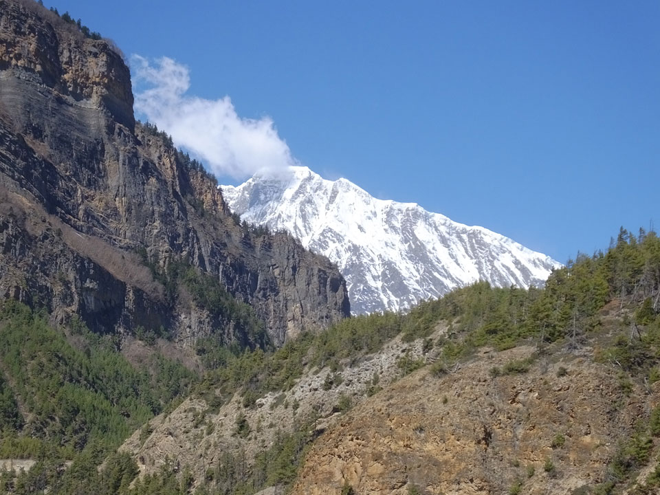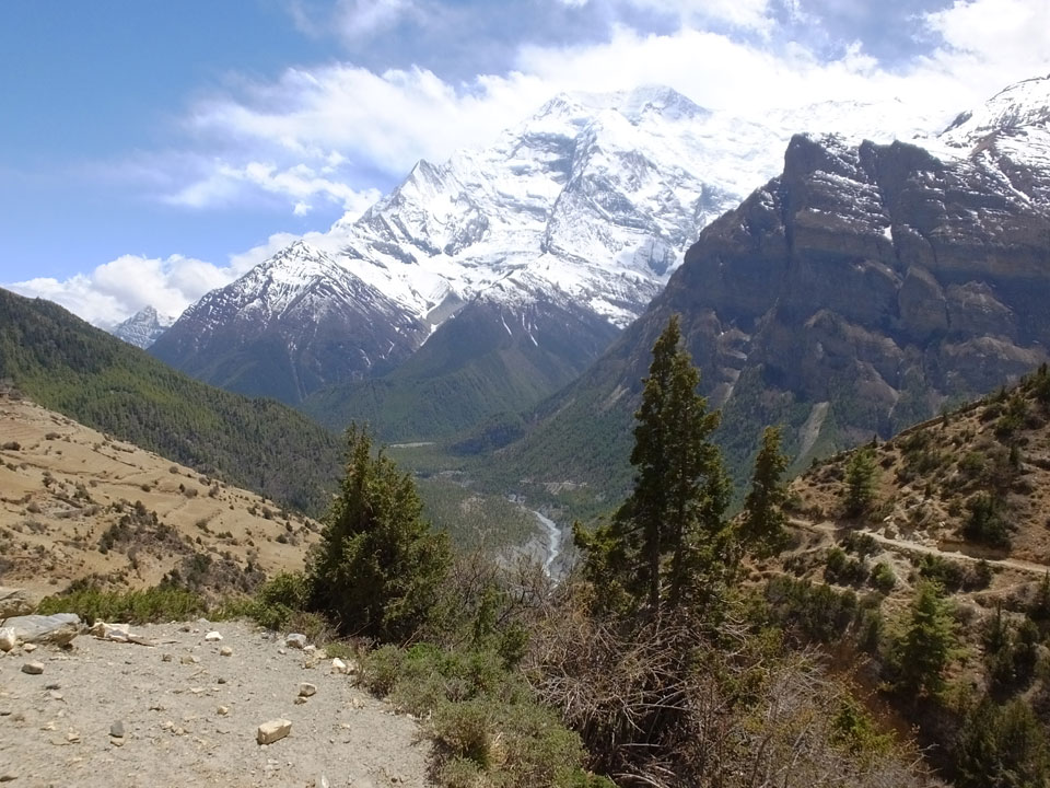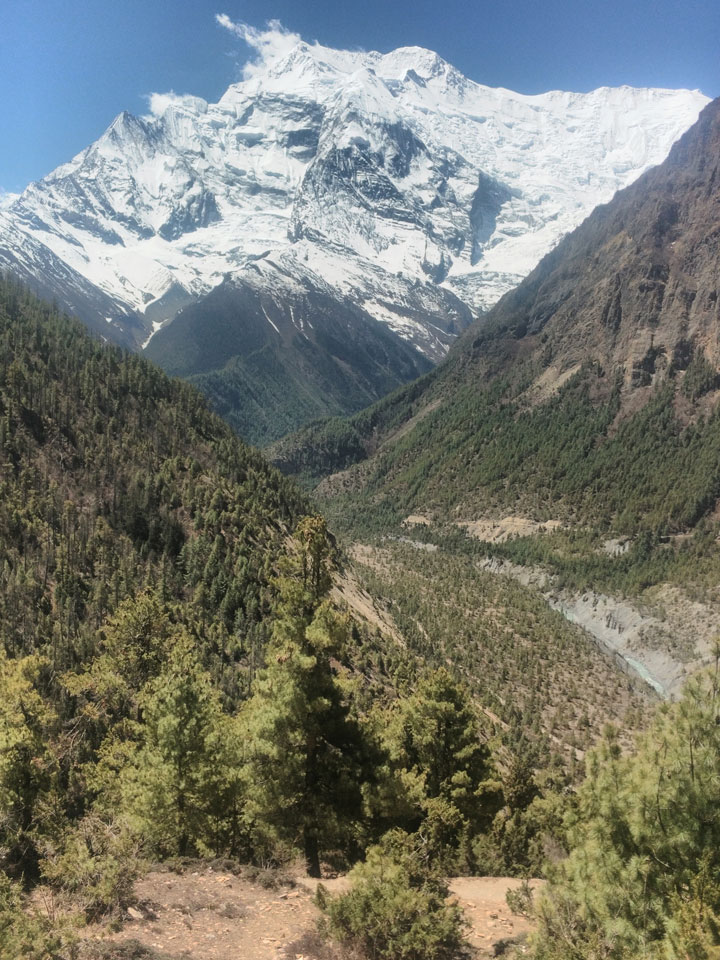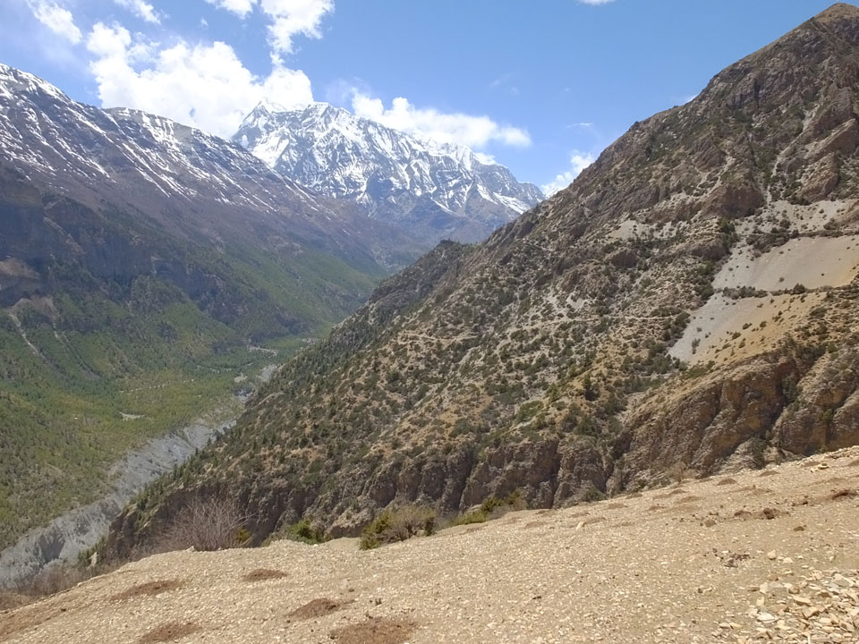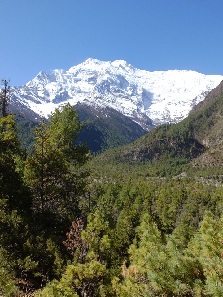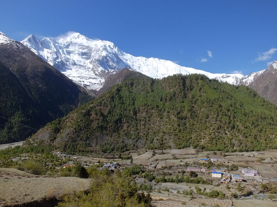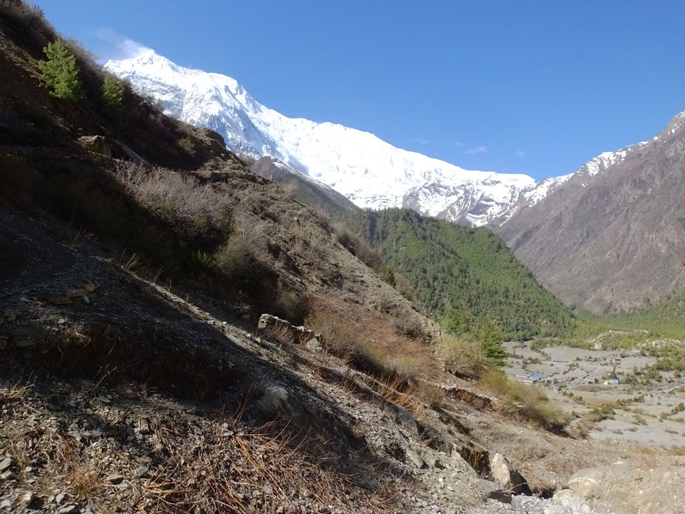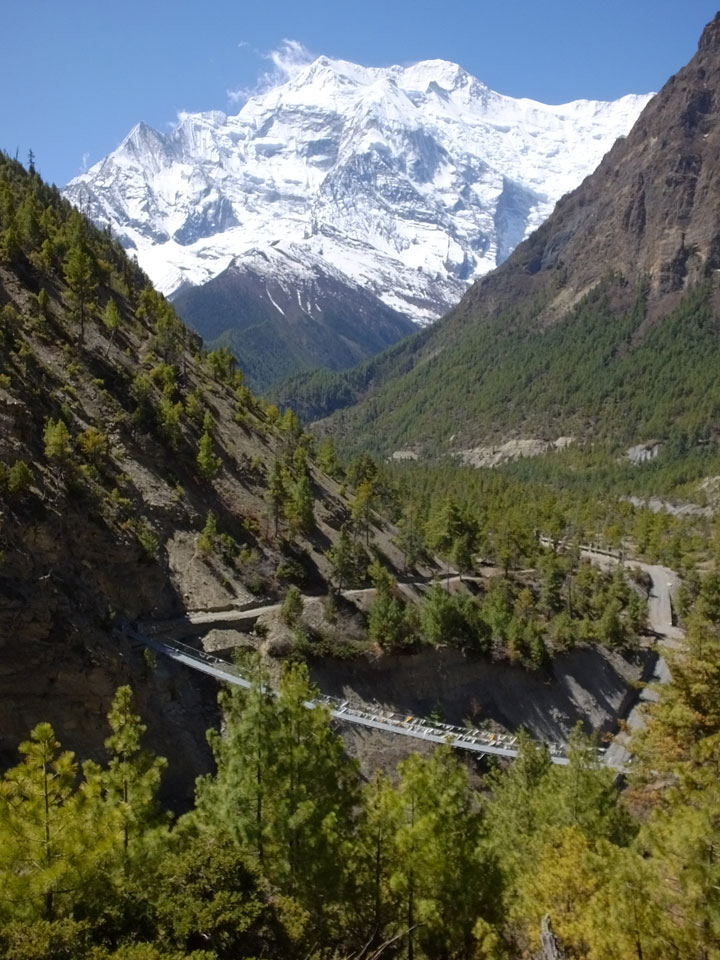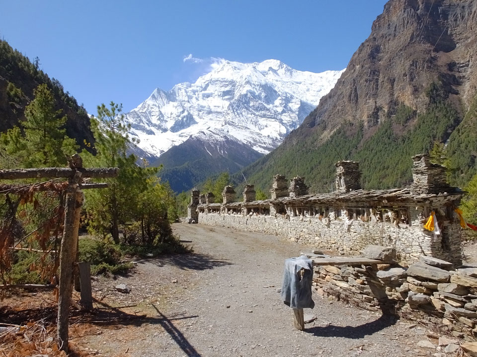 Die Aussicht und das Wetter heute morgen war wieder fantastisch. Der Klare blaue Himmel bot eine super Aussicht auf Annapurna 2. Wir liefen weiter auf der Route nach Manang und bekamen dann auch gleich den schwersten Teil der Strecke zu spüren. Gleich an einer Brücke passierte mir ein Missgeschick. Ich filmte und mein Wanderstock verhakte sich im Maschendraht. Das untere Stück flog von der Brücke. Ich rief kurz nach den 3 vorausgelaufenen Leuten. Sie kamen zurück und ich fand das Stück, baute den Wanderstock wieder zusammen. Wieder mal gut gegangen, da der Stock eine kleine Erleichterung ist. Es ging dann im Zick-zack-Kurs den Berg hoch. Viele Höhenmeter bekamen wir so unter die Füße. Oben dann eine Verschnaufpause und trotz nicht mal 12, entschieden wir uns für Mittagessen.