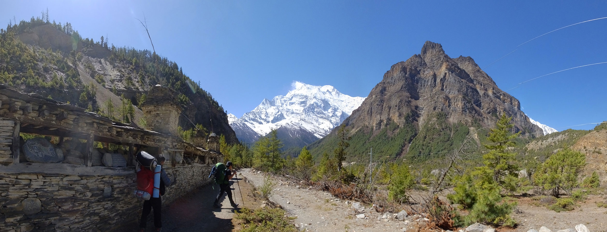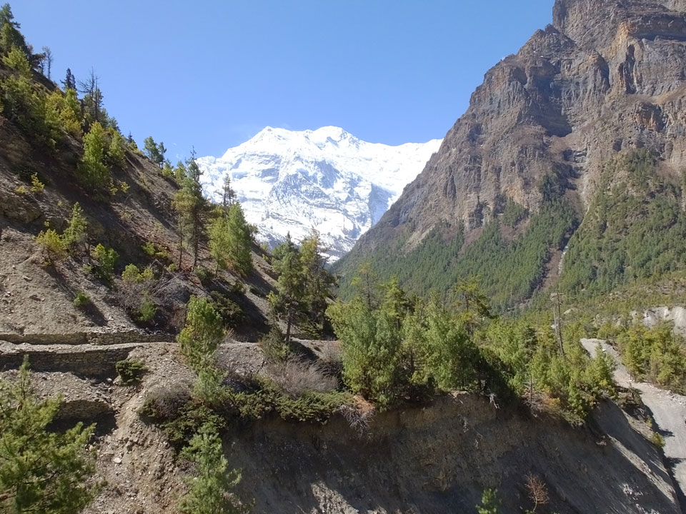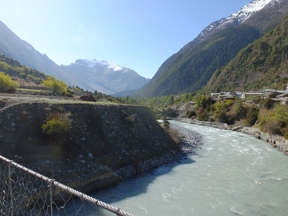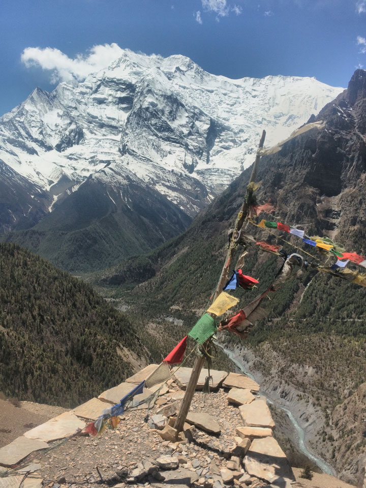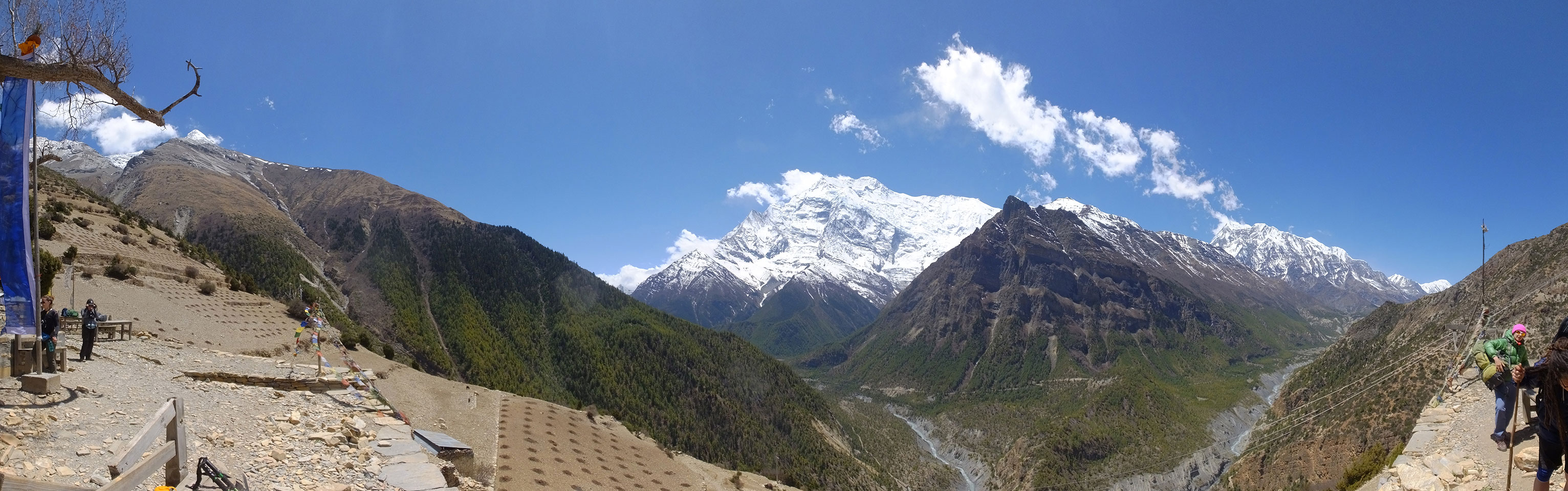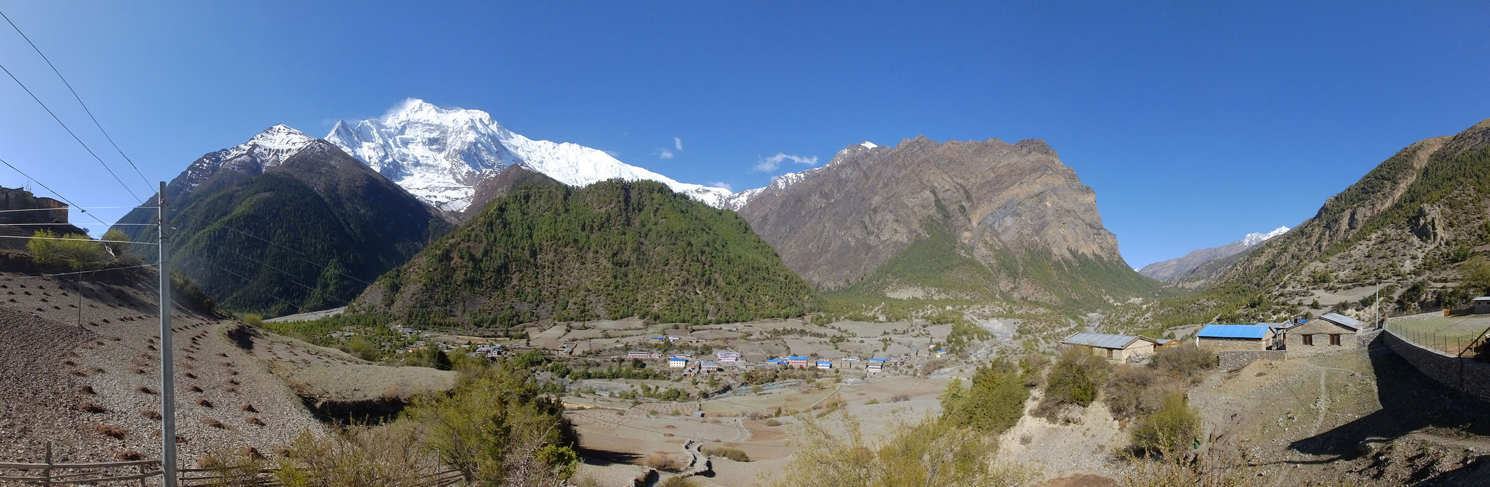 Die Aussicht und das Wetter heute morgen war wieder fantastisch. Der Klare blaue Himmel bot eine super Aussicht auf Annapurna 2. Wir liefen weiter auf der Route nach Manang und bekamen dann auch gleich den schwersten Teil der Strecke zu spüren. Gleich an einer Brücke passierte mir ein Missgeschick. Ich filmte und mein Wanderstock verhakte sich im Maschendraht. Das untere Stück flog von der Brücke. Ich rief kurz nach den 3 vorausgelaufenen Leuten. Sie kamen zurück und ich fand das Stück, baute den Wanderstock wieder zusammen. Wieder mal gut gegangen, da der Stock eine kleine Erleichterung ist. Es ging dann im Zick-zack-Kurs den Berg hoch. Viele Höhenmeter bekamen wir so unter die Füße. Oben dann eine Verschnaufpause und trotz nicht mal 12, entschieden wir uns für Mittagessen.