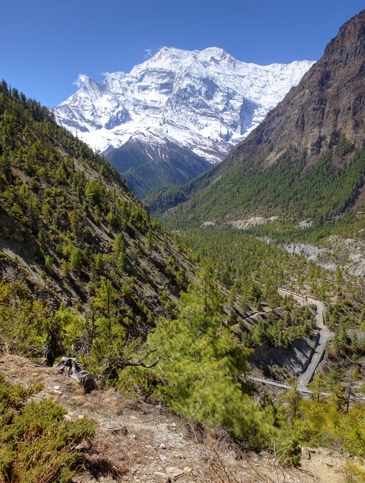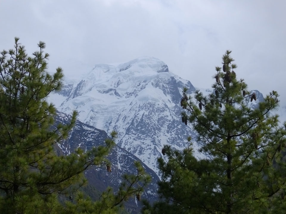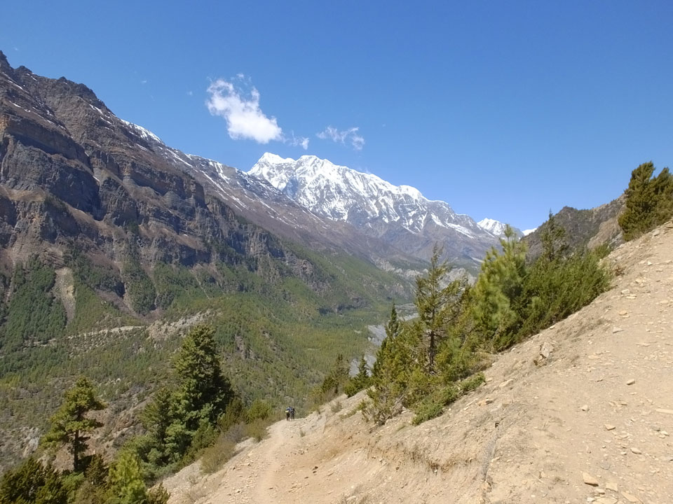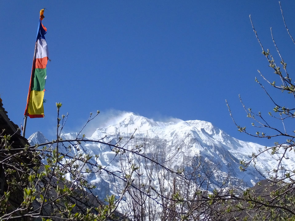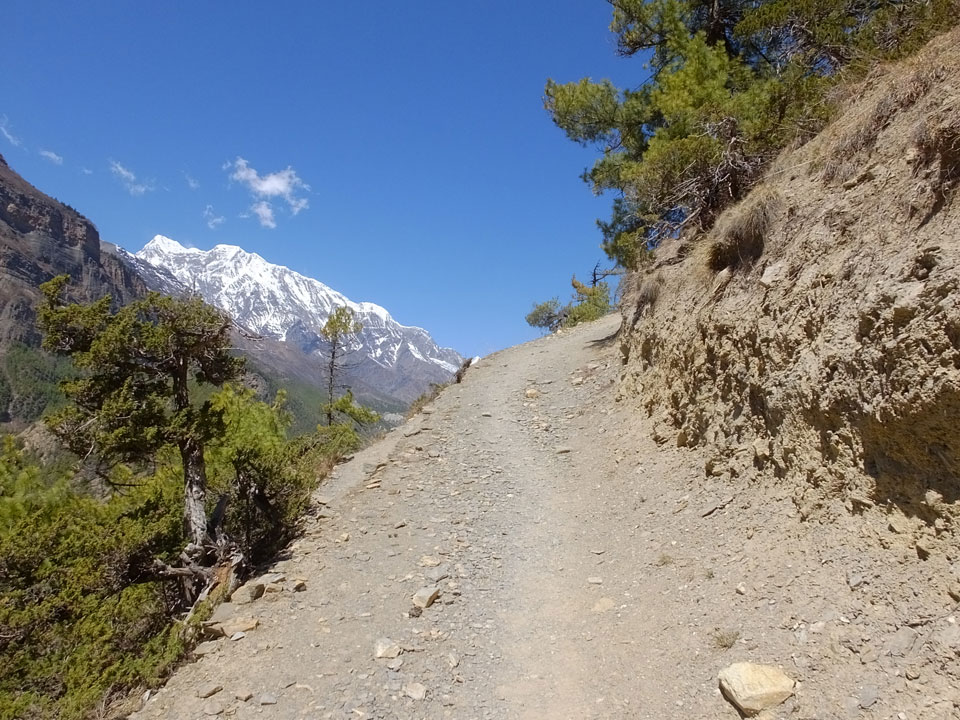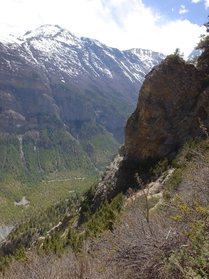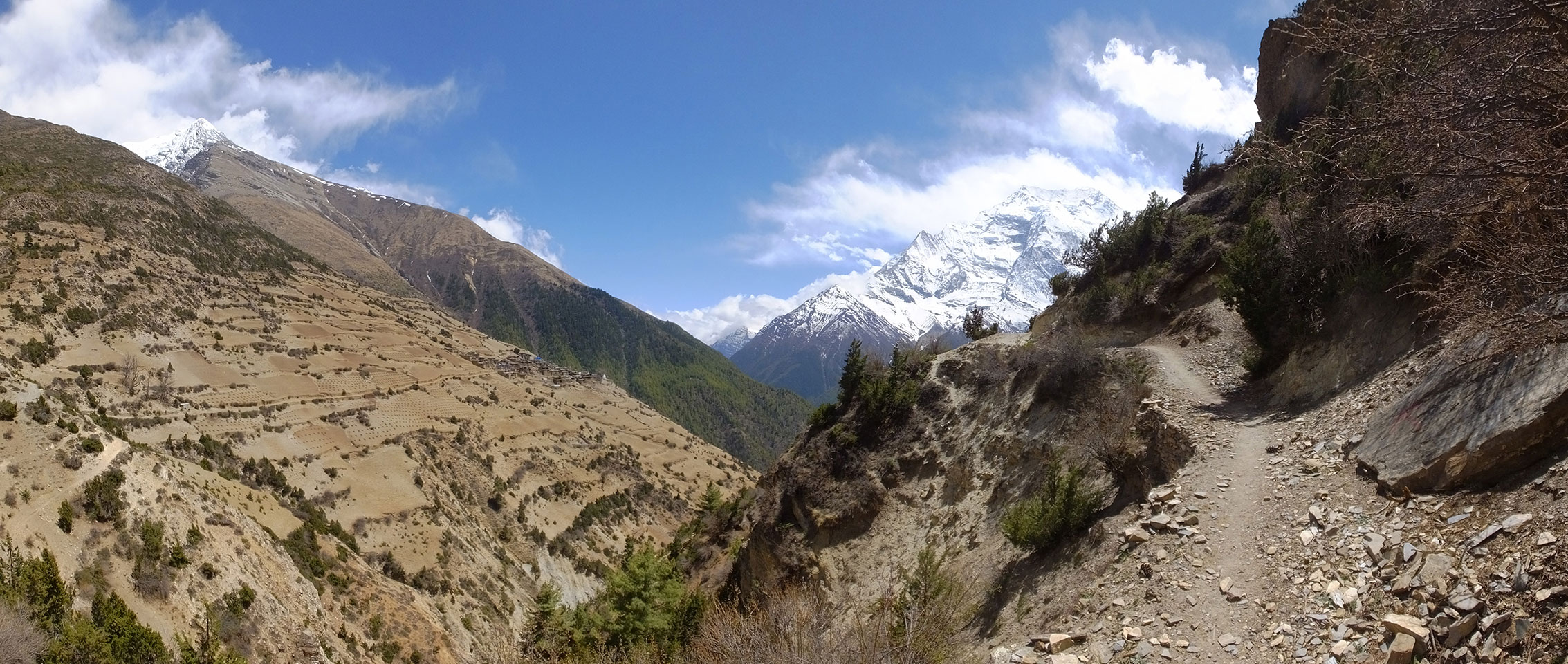 Die Aussicht und das Wetter heute morgen war wieder fantastisch. Der Klare blaue Himmel bot eine super Aussicht auf Annapurna 2. Wir liefen weiter auf der Route nach Manang und bekamen dann auch gleich den schwersten Teil der Strecke zu spüren. Gleich an einer Brücke passierte mir ein Missgeschick. Ich filmte und mein Wanderstock verhakte sich im Maschendraht. Das untere Stück flog von der Brücke. Ich rief kurz nach den 3 vorausgelaufenen Leuten. Sie kamen zurück und ich fand das Stück, baute den Wanderstock wieder zusammen. Wieder mal gut gegangen, da der Stock eine kleine Erleichterung ist. Es ging dann im Zick-zack-Kurs den Berg hoch. Viele Höhenmeter bekamen wir so unter die Füße. Oben dann eine Verschnaufpause und trotz nicht mal 12, entschieden wir uns für Mittagessen.
