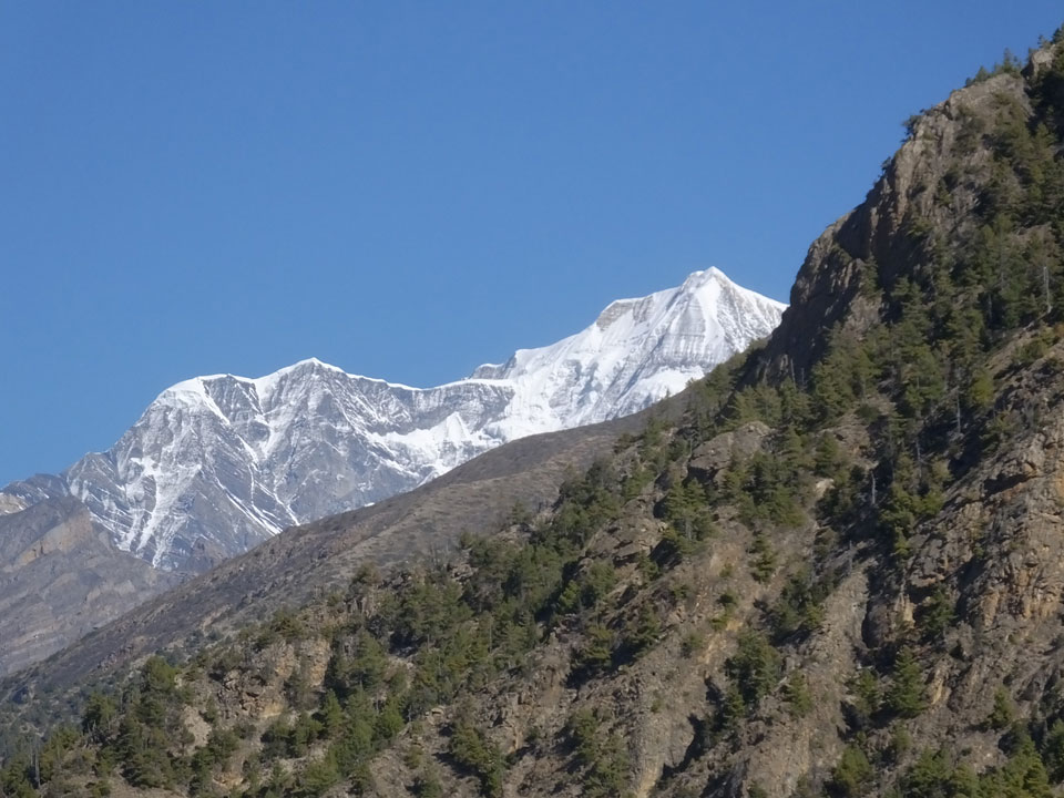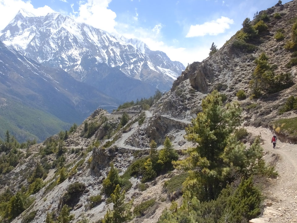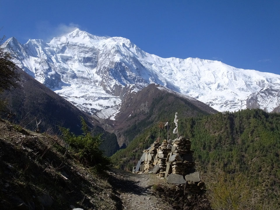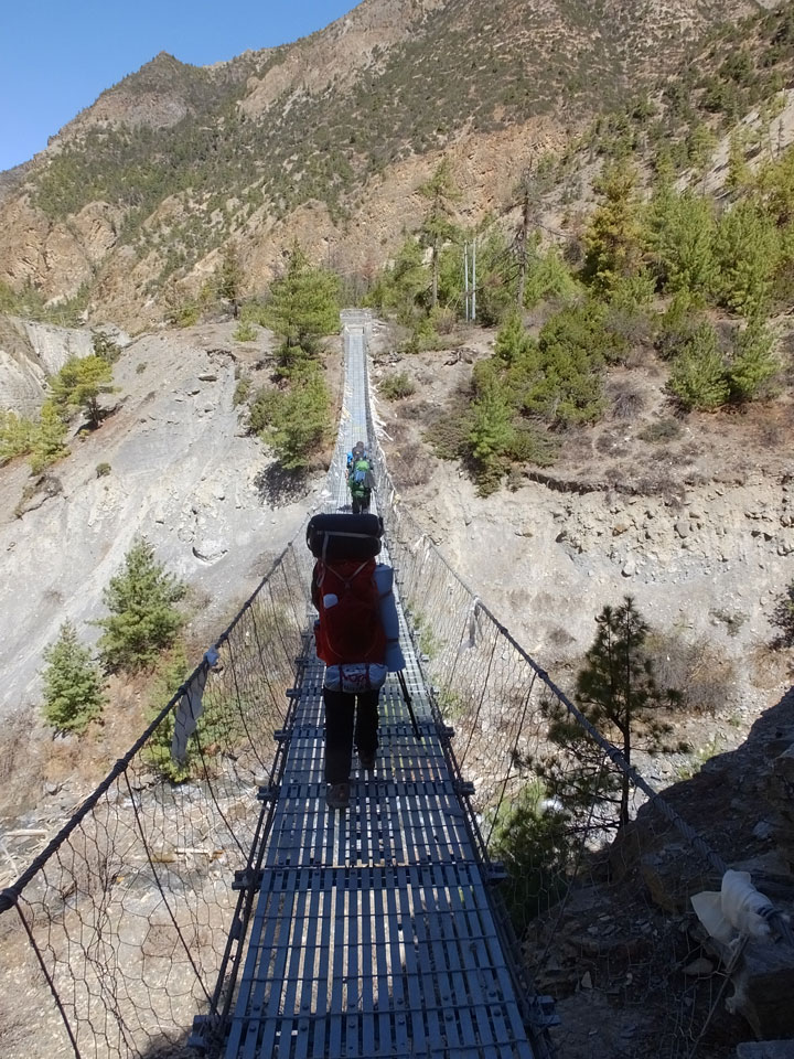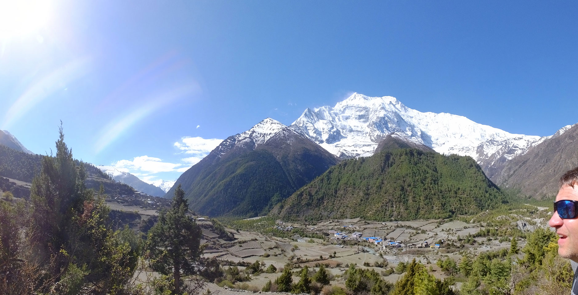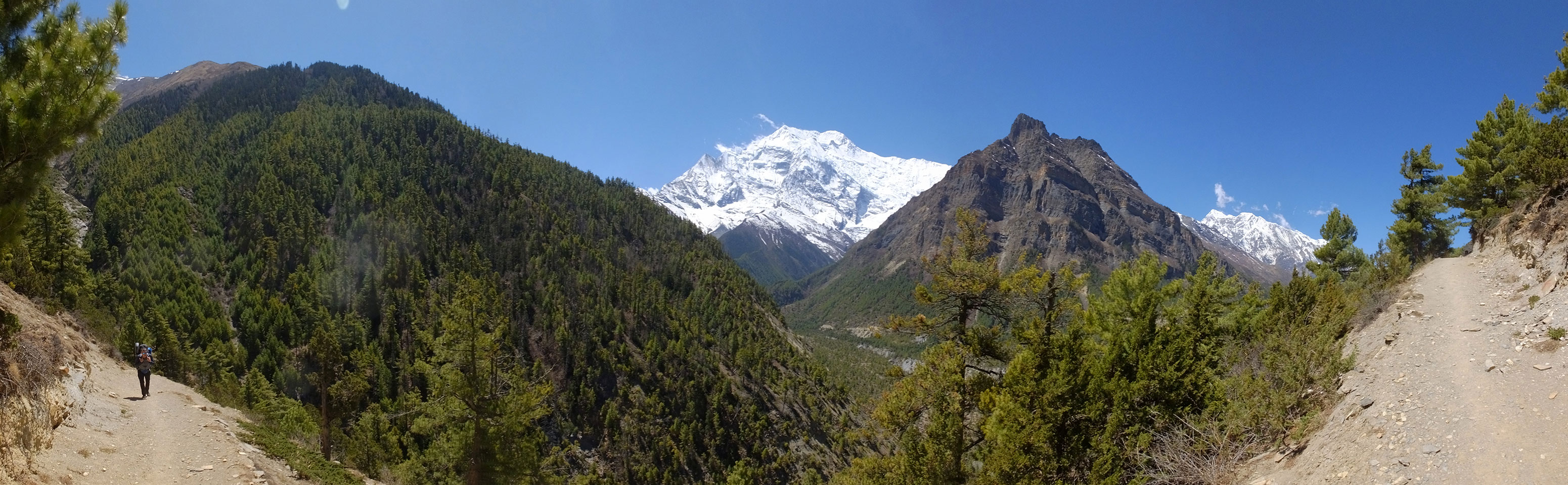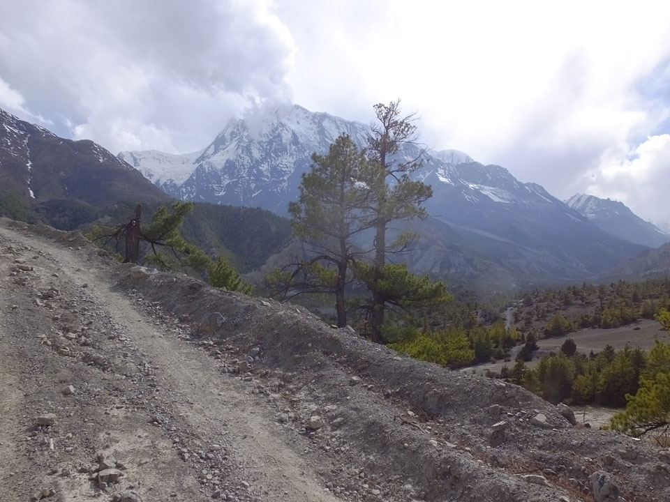 Die Aussicht und das Wetter heute morgen war wieder fantastisch. Der Klare blaue Himmel bot eine super Aussicht auf Annapurna 2. Wir liefen weiter auf der Route nach Manang und bekamen dann auch gleich den schwersten Teil der Strecke zu spüren. Gleich an einer Brücke passierte mir ein Missgeschick. Ich filmte und mein Wanderstock verhakte sich im Maschendraht. Das untere Stück flog von der Brücke. Ich rief kurz nach den 3 vorausgelaufenen Leuten. Sie kamen zurück und ich fand das Stück, baute den Wanderstock wieder zusammen. Wieder mal gut gegangen, da der Stock eine kleine Erleichterung ist. Es ging dann im Zick-zack-Kurs den Berg hoch. Viele Höhenmeter bekamen wir so unter die Füße. Oben dann eine Verschnaufpause und trotz nicht mal 12, entschieden wir uns für Mittagessen.