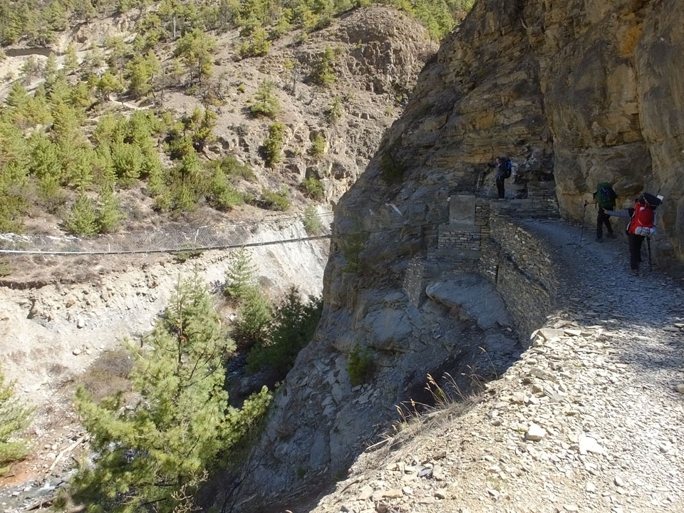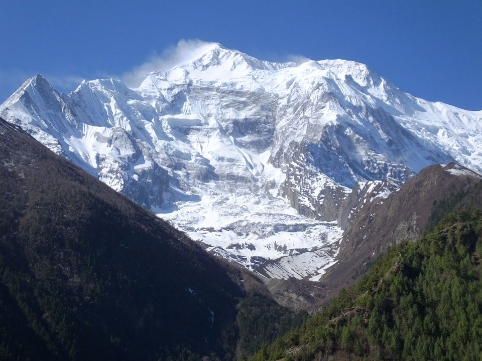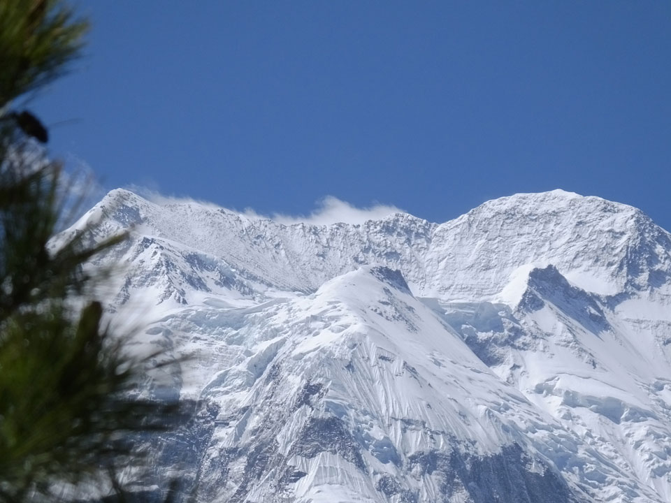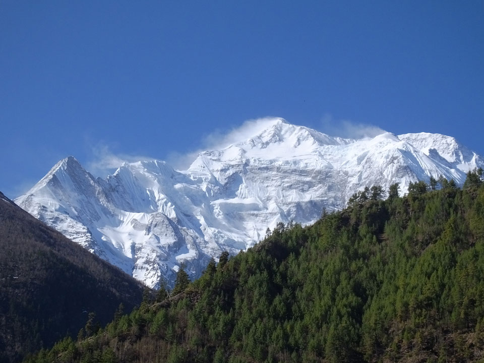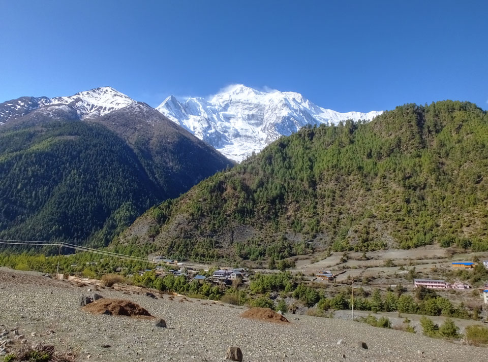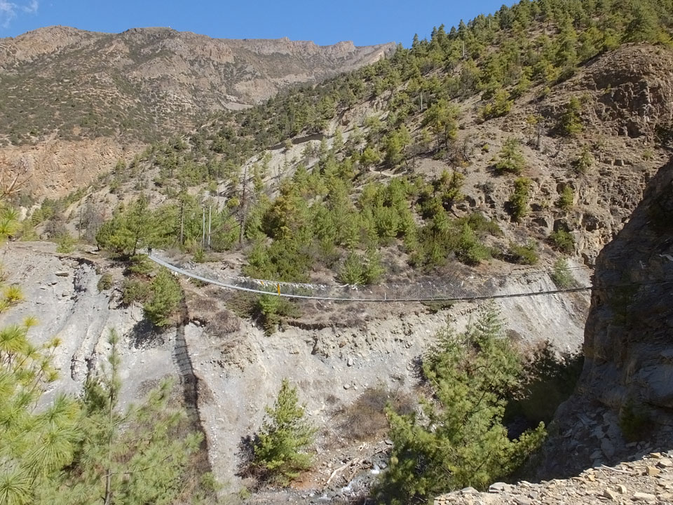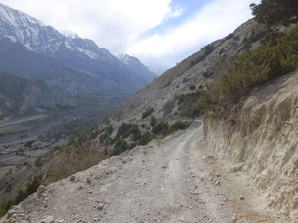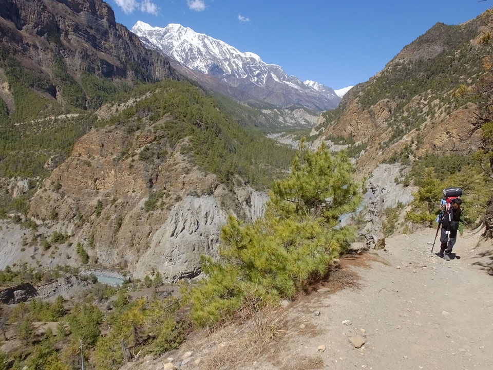 Die Aussicht und das Wetter heute morgen war wieder fantastisch. Der Klare blaue Himmel bot eine super Aussicht auf Annapurna 2. Wir liefen weiter auf der Route nach Manang und bekamen dann auch gleich den schwersten Teil der Strecke zu spüren. Gleich an einer Brücke passierte mir ein Missgeschick. Ich filmte und mein Wanderstock verhakte sich im Maschendraht. Das untere Stück flog von der Brücke. Ich rief kurz nach den 3 vorausgelaufenen Leuten. Sie kamen zurück und ich fand das Stück, baute den Wanderstock wieder zusammen. Wieder mal gut gegangen, da der Stock eine kleine Erleichterung ist. Es ging dann im Zick-zack-Kurs den Berg hoch. Viele Höhenmeter bekamen wir so unter die Füße. Oben dann eine Verschnaufpause und trotz nicht mal 12, entschieden wir uns für Mittagessen.