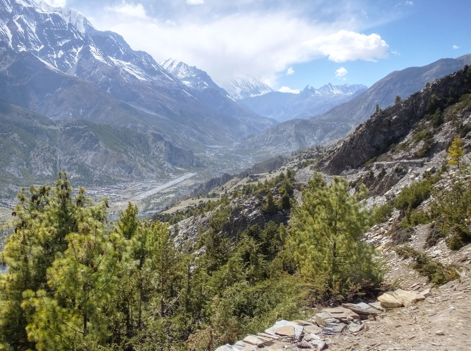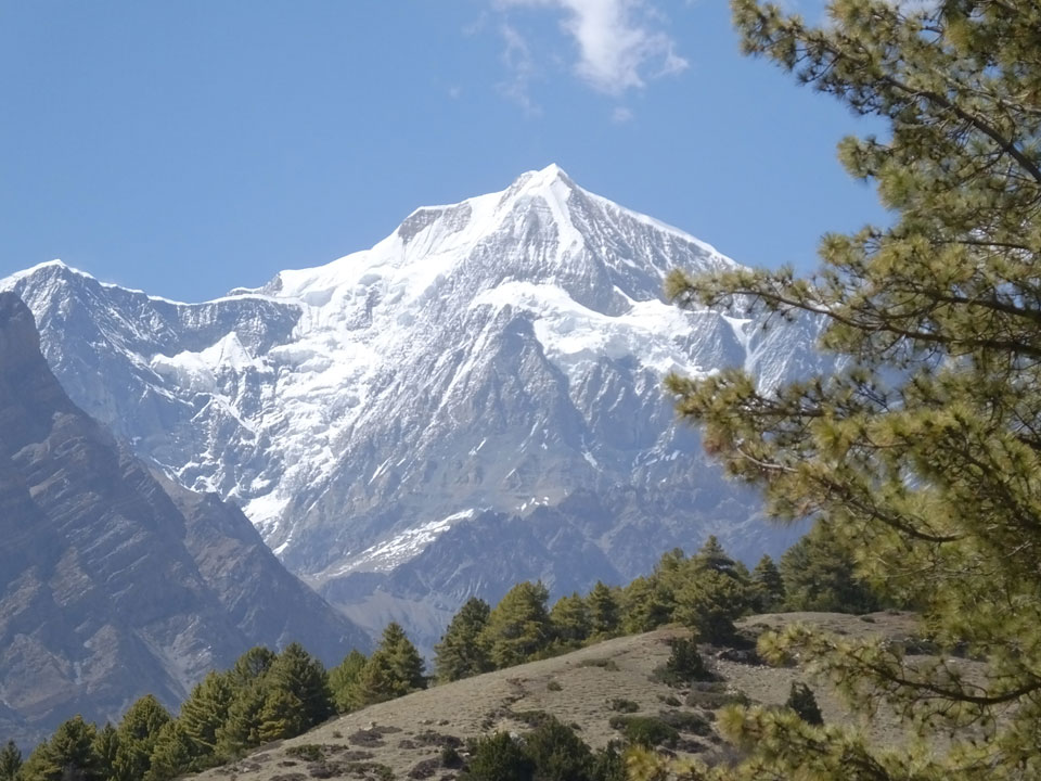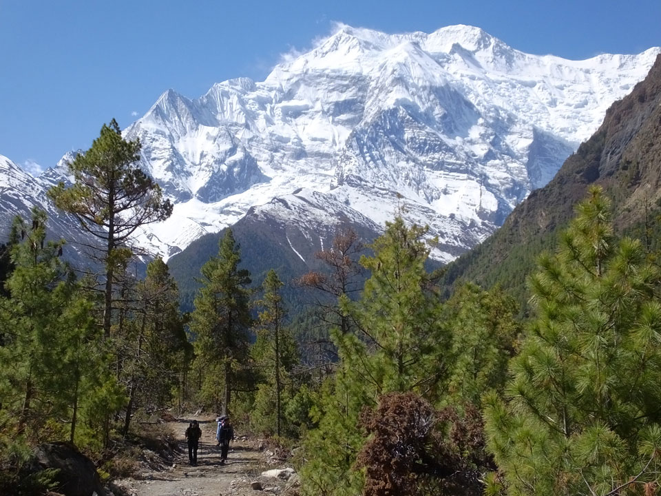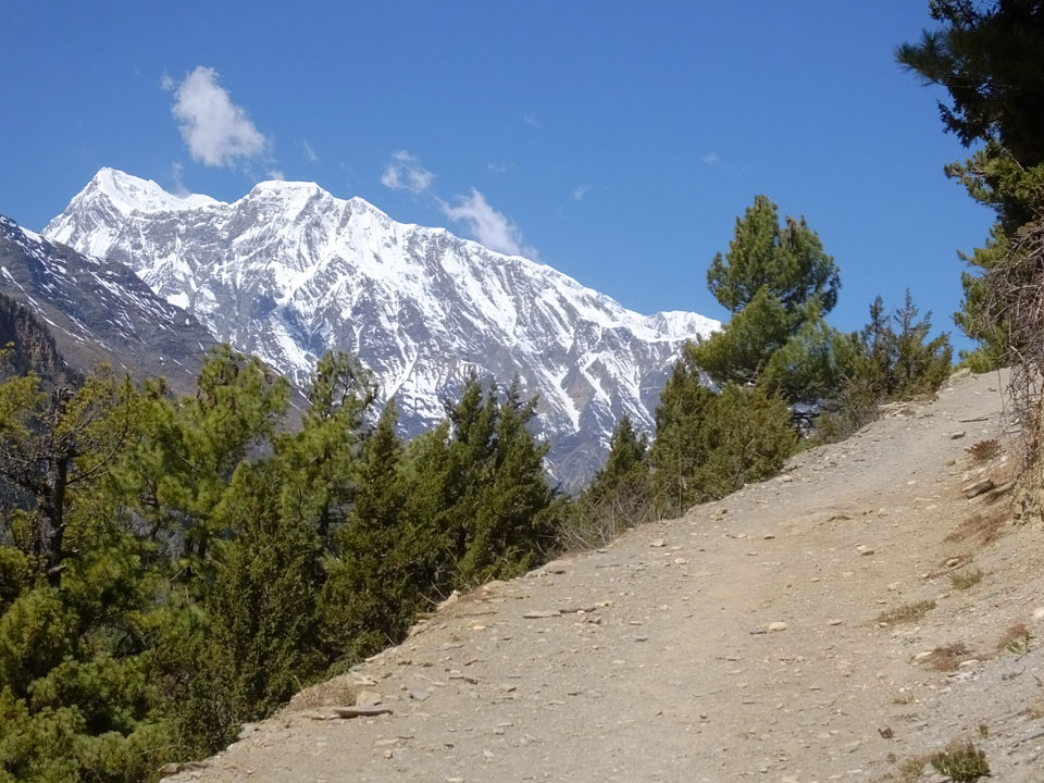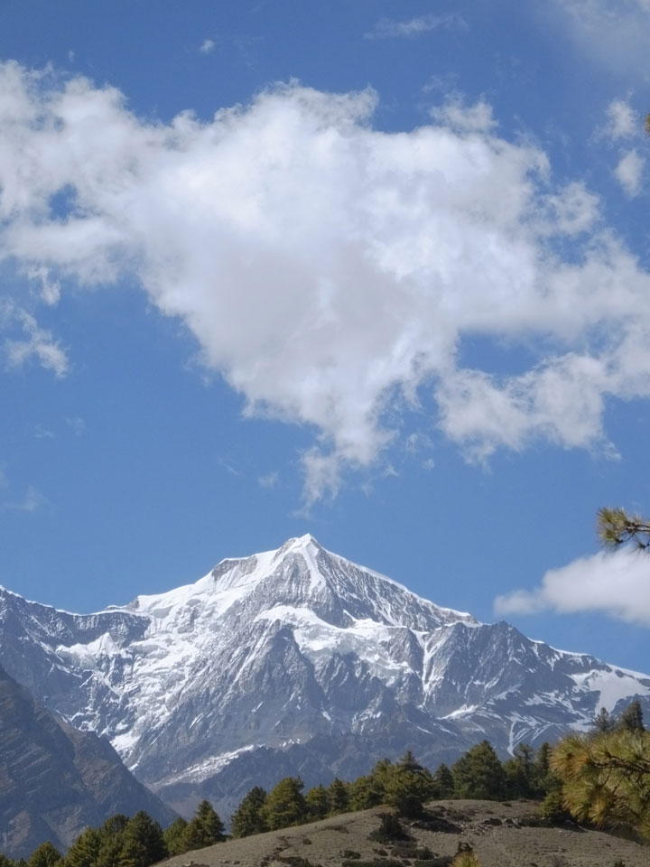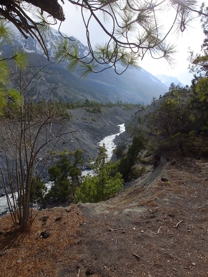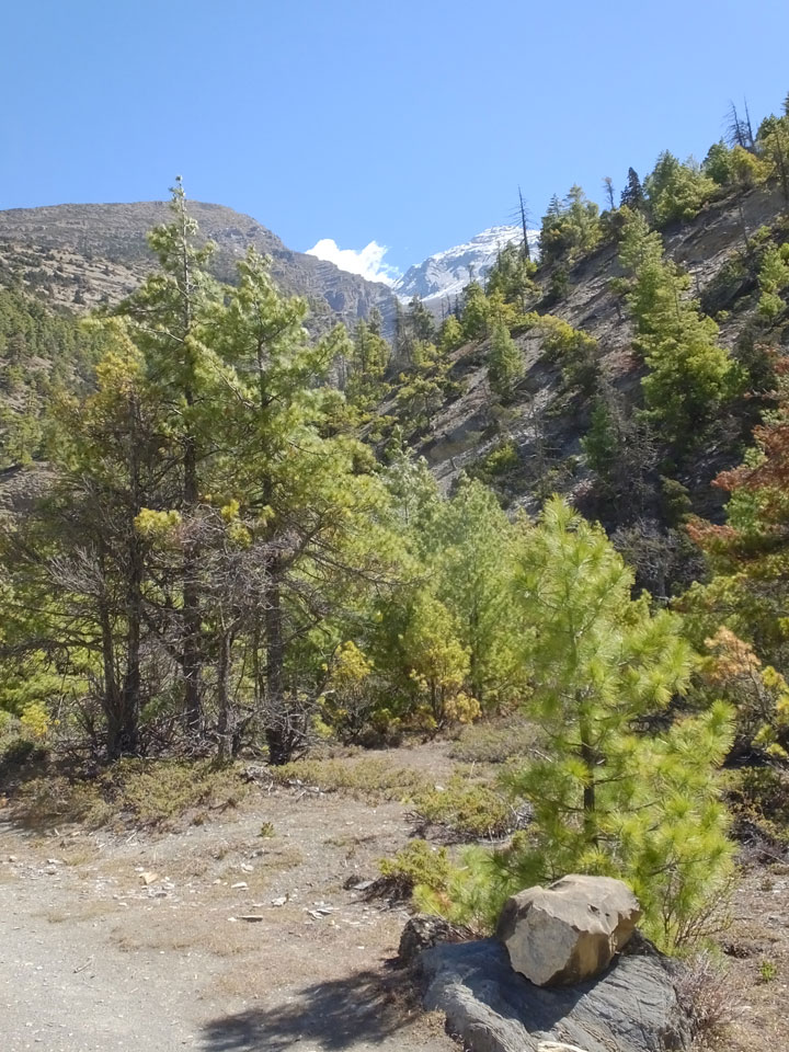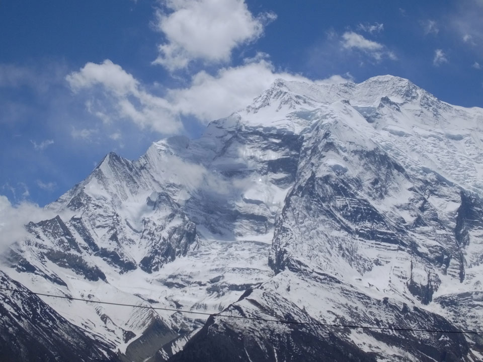 Die Aussicht und das Wetter heute morgen war wieder fantastisch. Der Klare blaue Himmel bot eine super Aussicht auf Annapurna 2. Wir liefen weiter auf der Route nach Manang und bekamen dann auch gleich den schwersten Teil der Strecke zu spüren. Gleich an einer Brücke passierte mir ein Missgeschick. Ich filmte und mein Wanderstock verhakte sich im Maschendraht. Das untere Stück flog von der Brücke. Ich rief kurz nach den 3 vorausgelaufenen Leuten. Sie kamen zurück und ich fand das Stück, baute den Wanderstock wieder zusammen. Wieder mal gut gegangen, da der Stock eine kleine Erleichterung ist. Es ging dann im Zick-zack-Kurs den Berg hoch. Viele Höhenmeter bekamen wir so unter die Füße. Oben dann eine Verschnaufpause und trotz nicht mal 12, entschieden wir uns für Mittagessen.