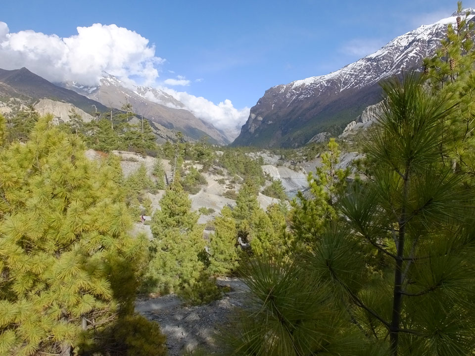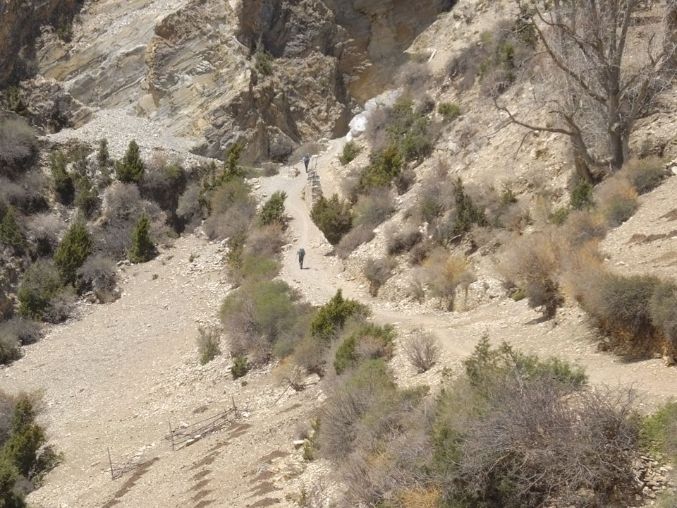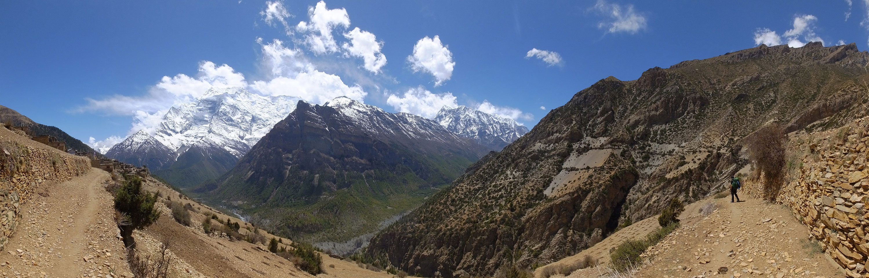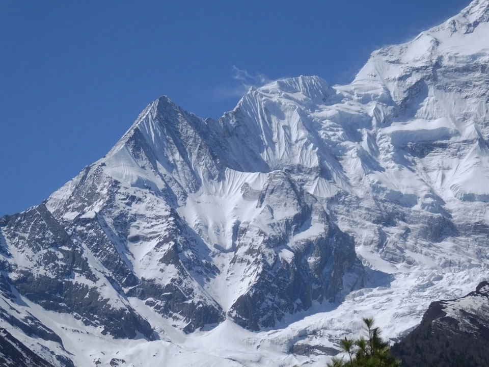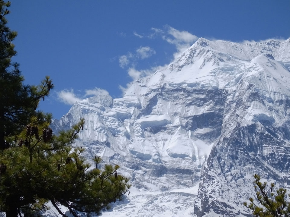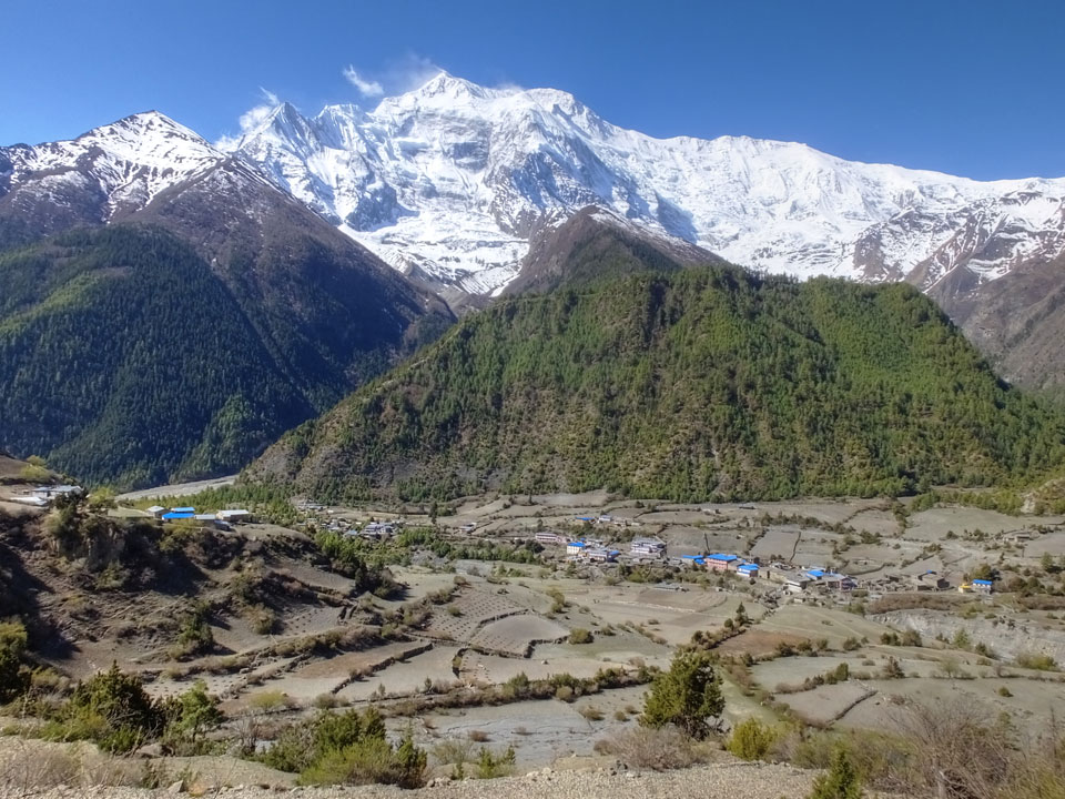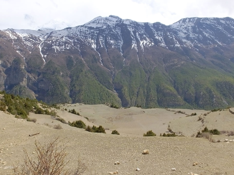 Die Aussicht und das Wetter heute morgen war wieder fantastisch. Der Klare blaue Himmel bot eine super Aussicht auf Annapurna 2. Wir liefen weiter auf der Route nach Manang und bekamen dann auch gleich den schwersten Teil der Strecke zu spüren. Gleich an einer Brücke passierte mir ein Missgeschick. Ich filmte und mein Wanderstock verhakte sich im Maschendraht. Das untere Stück flog von der Brücke. Ich rief kurz nach den 3 vorausgelaufenen Leuten. Sie kamen zurück und ich fand das Stück, baute den Wanderstock wieder zusammen. Wieder mal gut gegangen, da der Stock eine kleine Erleichterung ist. Es ging dann im Zick-zack-Kurs den Berg hoch. Viele Höhenmeter bekamen wir so unter die Füße. Oben dann eine Verschnaufpause und trotz nicht mal 12, entschieden wir uns für Mittagessen.