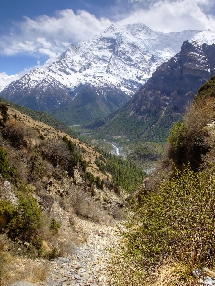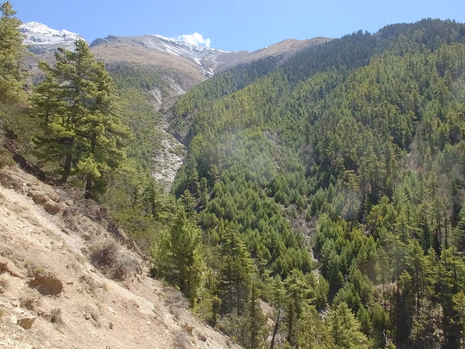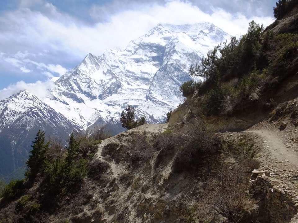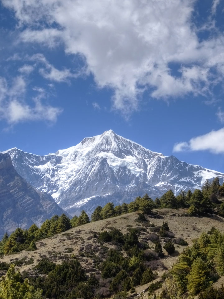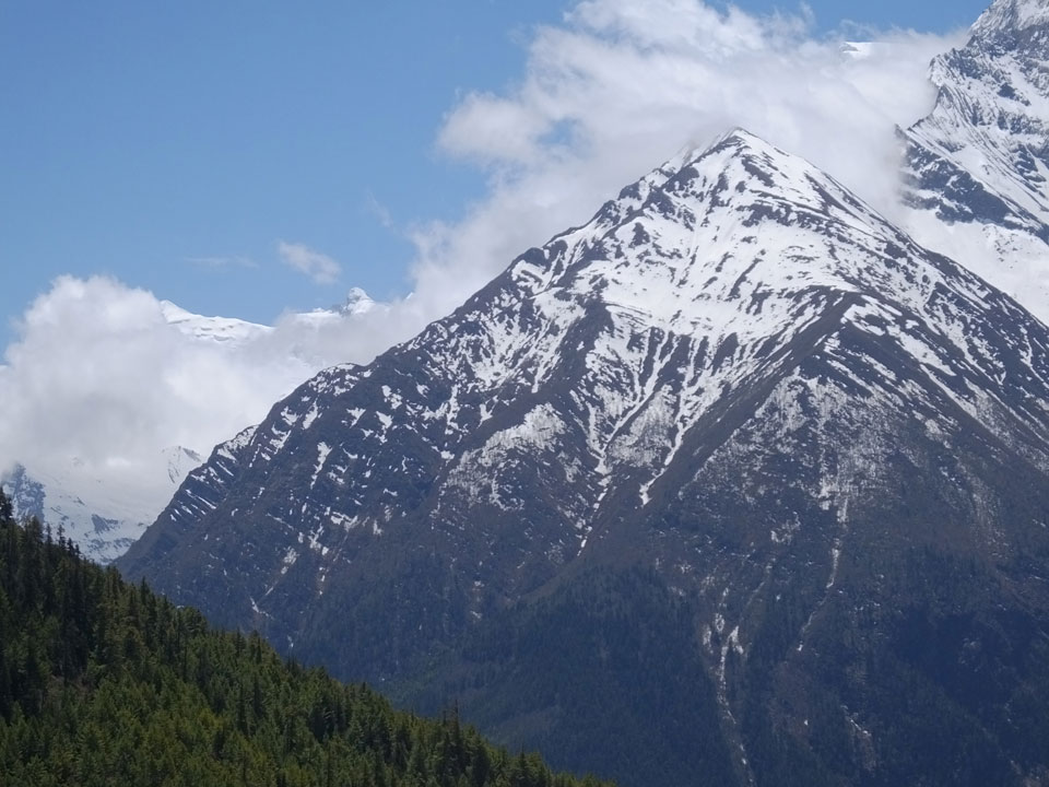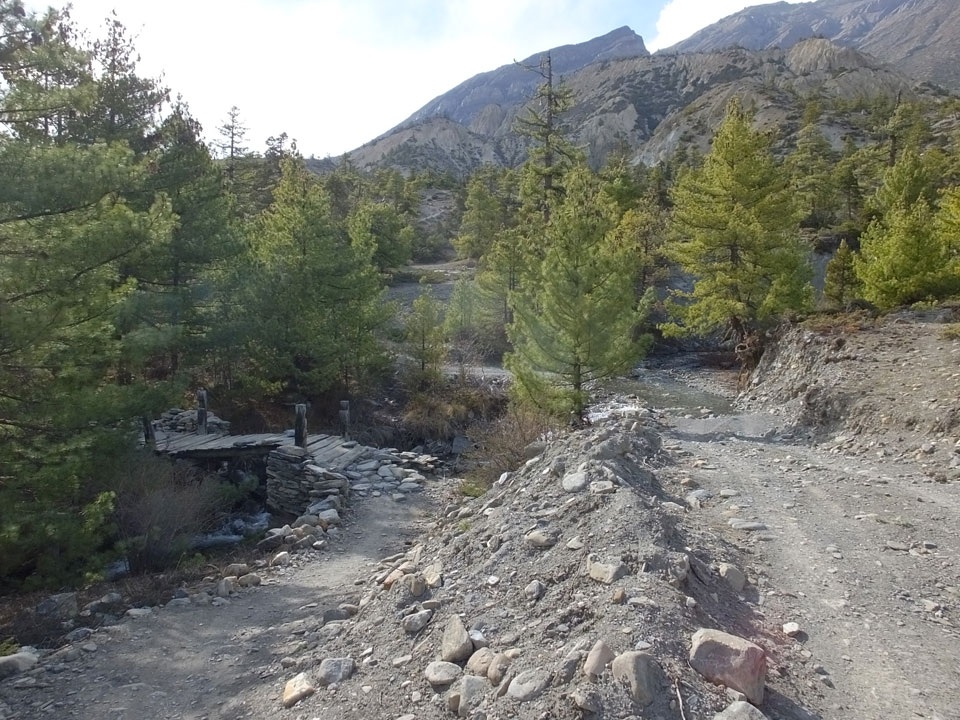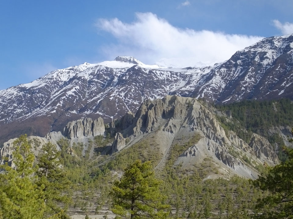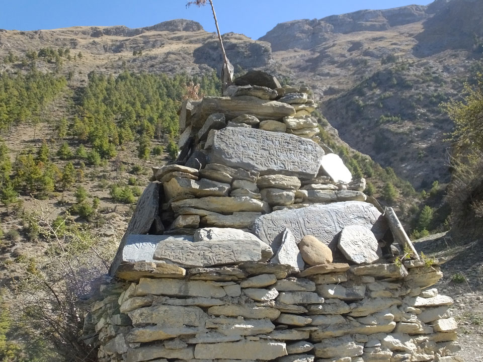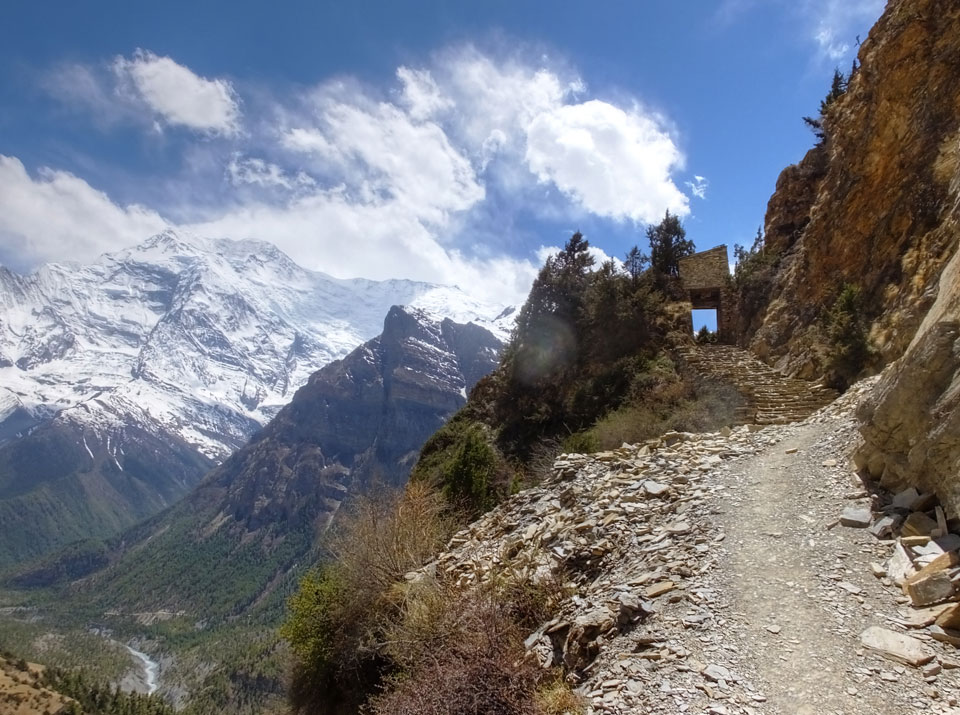Die Aussicht und das Wetter heute morgen war wieder fantastisch. Der Klare blaue Himmel bot eine super Aussicht auf Annapurna 2. Wir liefen weiter auf der Route nach Manang und bekamen dann auch gleich den schwersten Teil der Strecke zu spüren. Gleich an einer Brücke passierte mir ein Missgeschick. Ich filmte und mein Wanderstock verhakte sich im Maschendraht. Das untere Stück flog von der Brücke. Ich rief kurz nach den 3 vorausgelaufenen Leuten. Sie kamen zurück und ich fand das Stück, baute den Wanderstock wieder zusammen. Wieder mal gut gegangen, da der Stock eine kleine Erleichterung ist. Es ging dann im Zick-zack-Kurs den Berg hoch. Viele Höhenmeter bekamen wir so unter die Füße. Oben dann eine Verschnaufpause und trotz nicht mal 12, entschieden wir uns für Mittagessen.