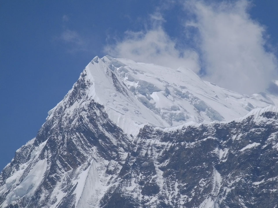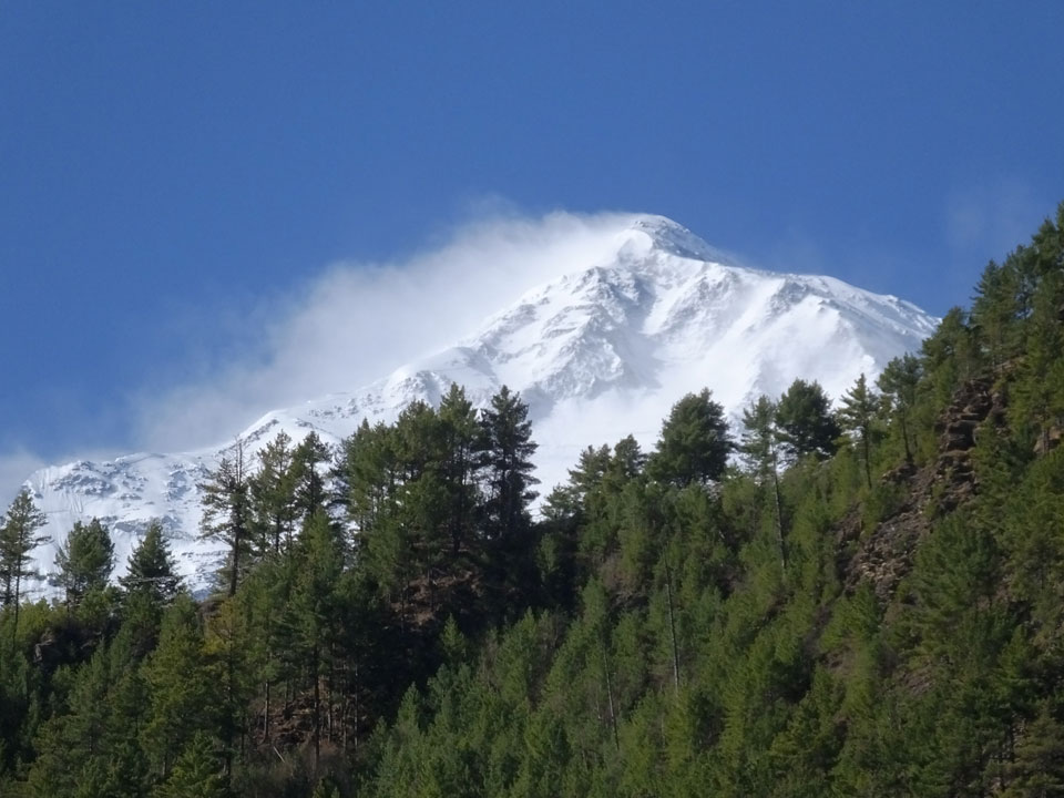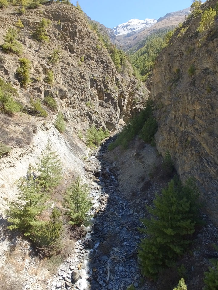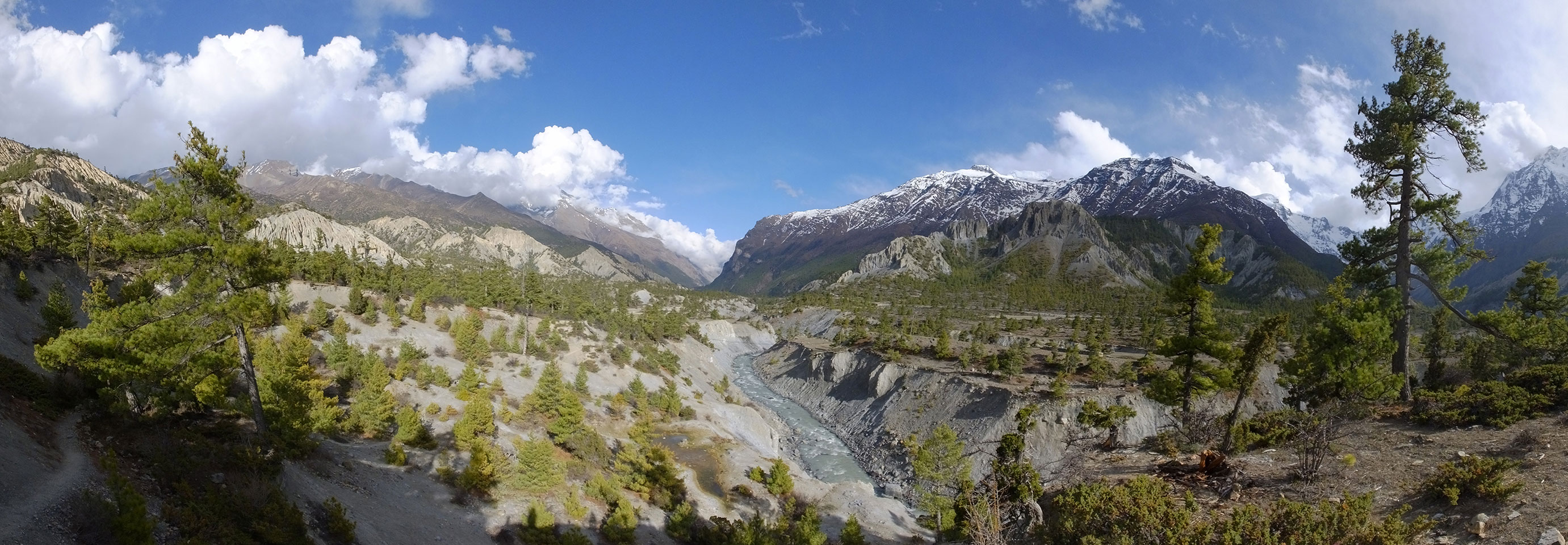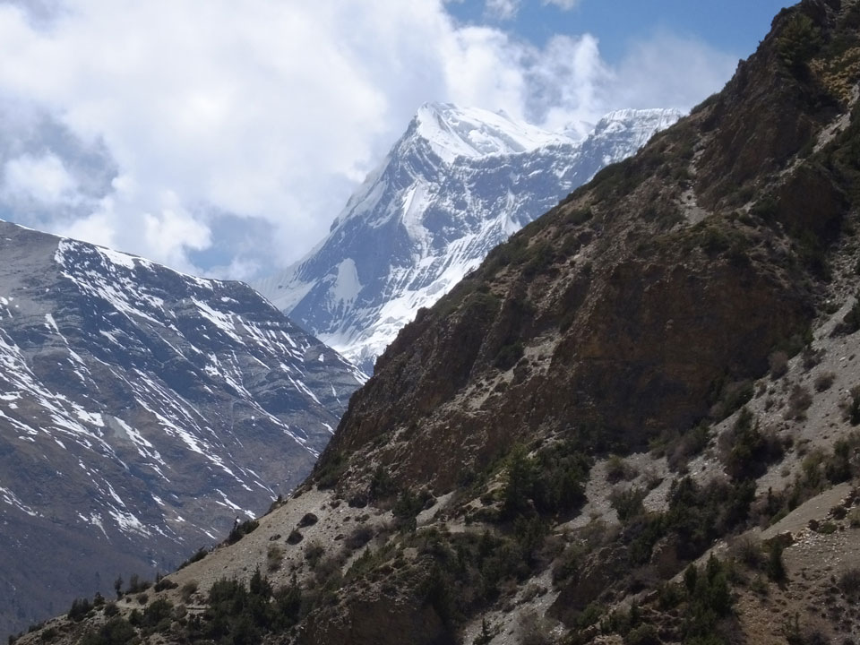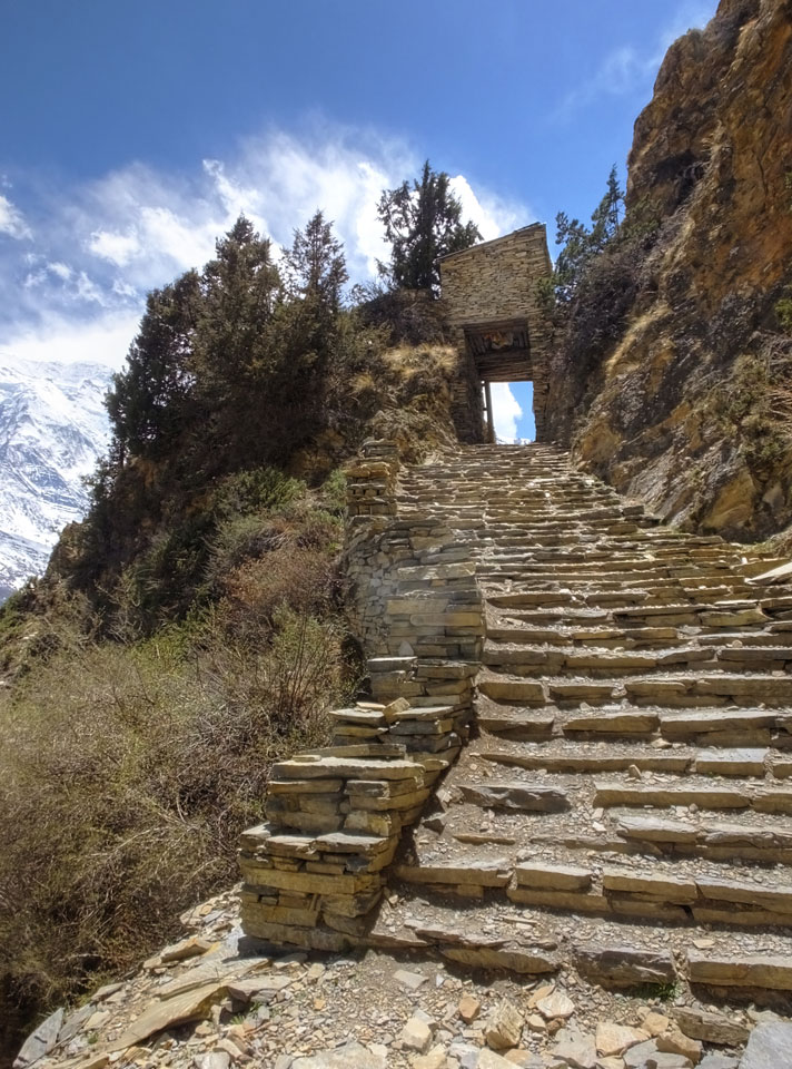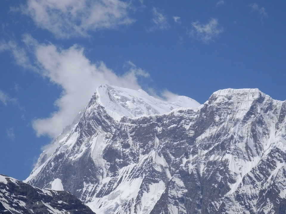 Die Aussicht und das Wetter heute morgen war wieder fantastisch. Der Klare blaue Himmel bot eine super Aussicht auf Annapurna 2. Wir liefen weiter auf der Route nach Manang und bekamen dann auch gleich den schwersten Teil der Strecke zu spüren. Gleich an einer Brücke passierte mir ein Missgeschick. Ich filmte und mein Wanderstock verhakte sich im Maschendraht. Das untere Stück flog von der Brücke. Ich rief kurz nach den 3 vorausgelaufenen Leuten. Sie kamen zurück und ich fand das Stück, baute den Wanderstock wieder zusammen. Wieder mal gut gegangen, da der Stock eine kleine Erleichterung ist. Es ging dann im Zick-zack-Kurs den Berg hoch. Viele Höhenmeter bekamen wir so unter die Füße. Oben dann eine Verschnaufpause und trotz nicht mal 12, entschieden wir uns für Mittagessen.