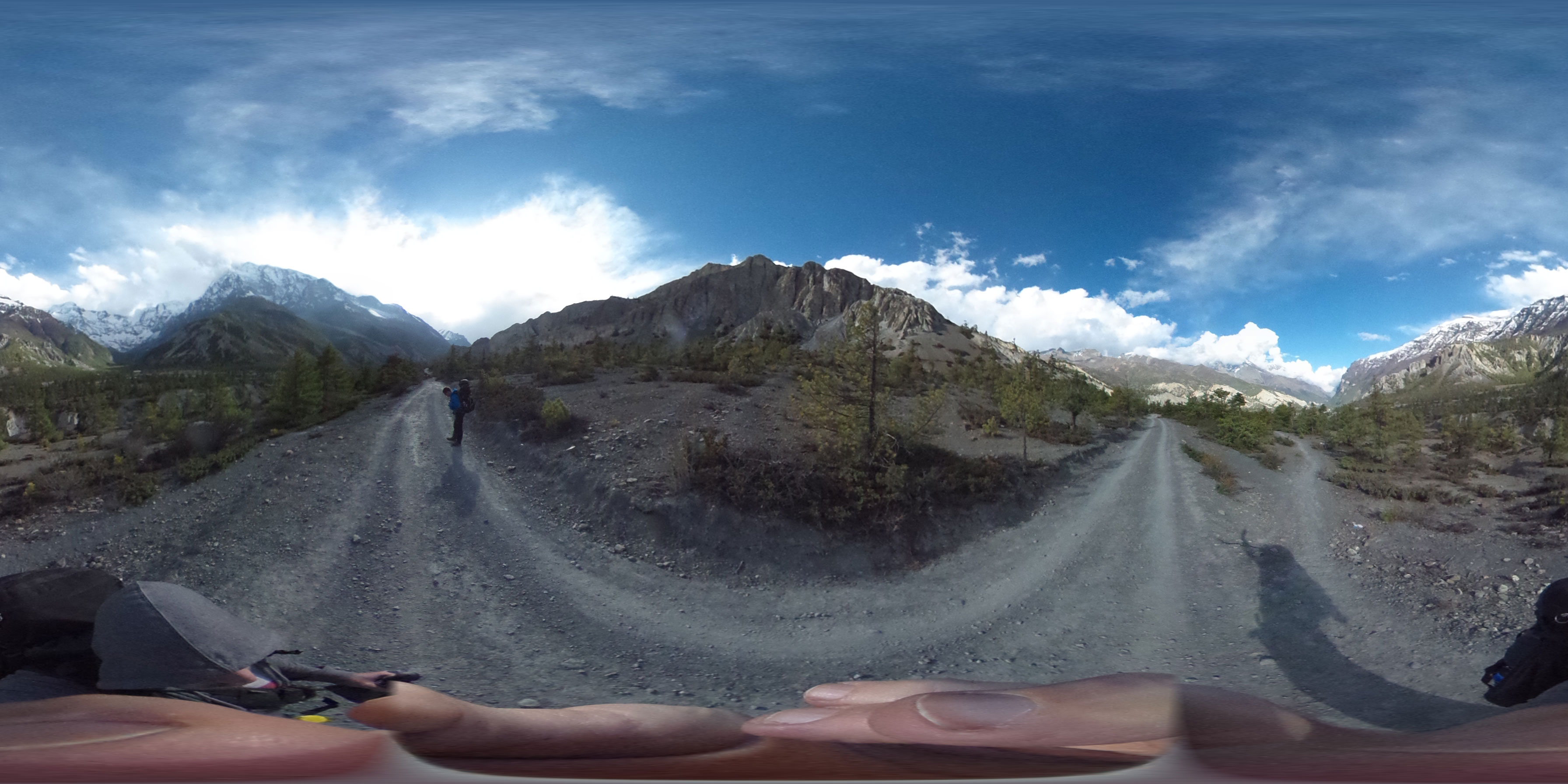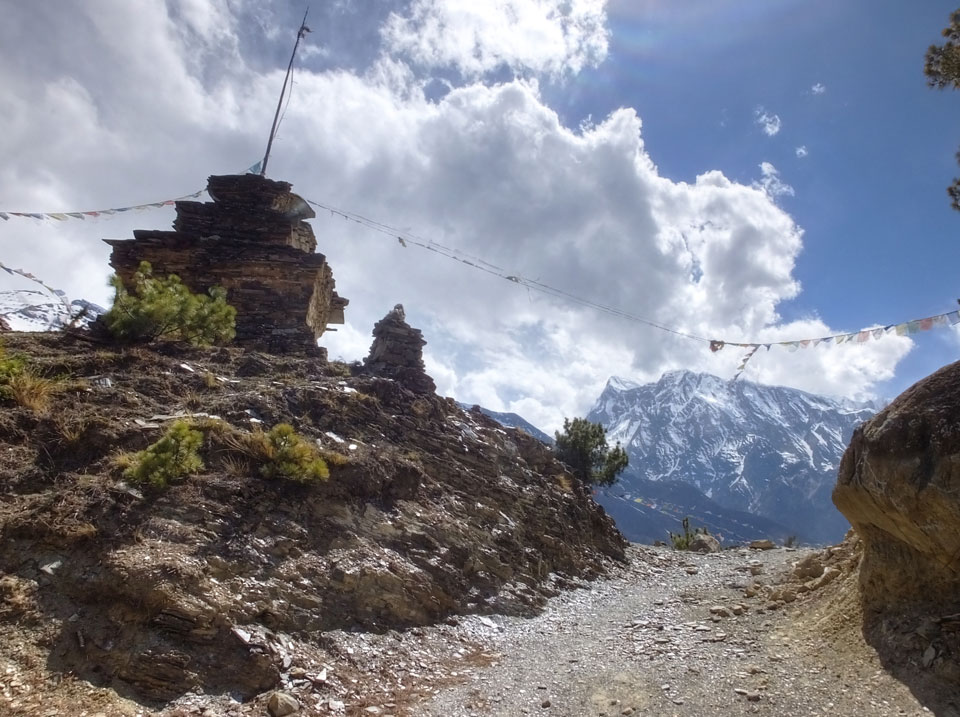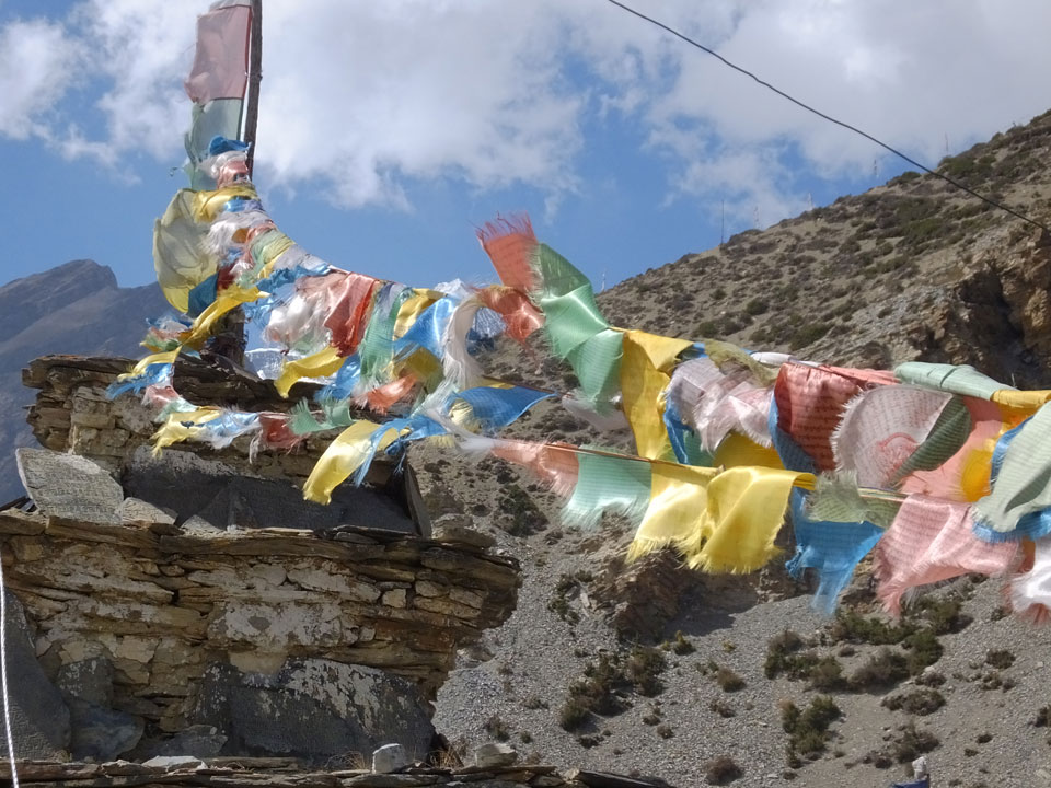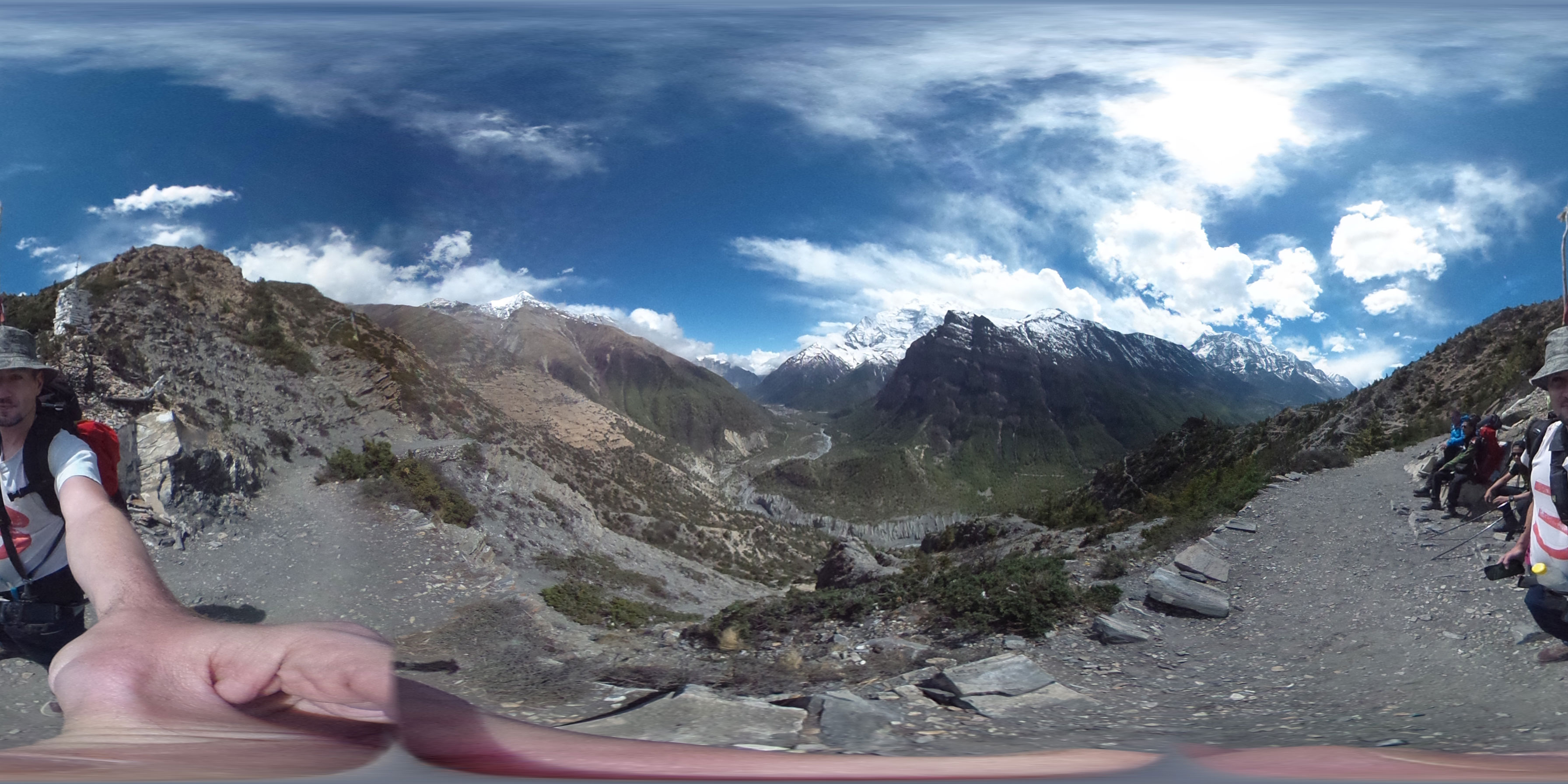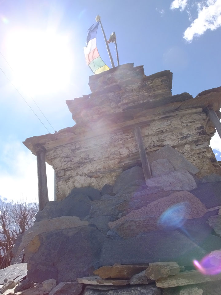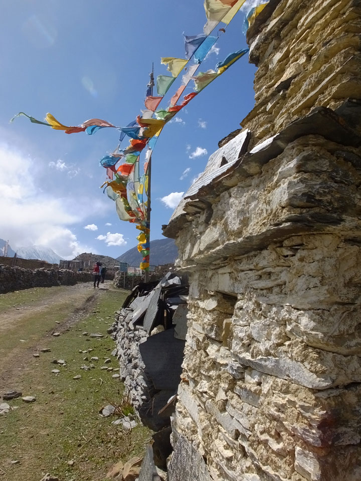 Weiter ging’s auf der Tour raus aus dem Dorf und immer weiter hoch. Hubschrauber flogen ab und zu mal vorbei. Inzwischen waren wir höher als die Helicopter. Das Panorama mit den vielen hohen Bergen war einfach super. Viele Stupas oder Gebetstürmchen standen hier in der Höhe herum mit flatternden Fahnen. Obwohl ich mit meinem Rucksack schwer und kompliziert bepackt war, entschied ich mich endlich mal für die Theta. Die 360° Bilder zeigen doch besser, wie es insgesamt hier so aussieht.