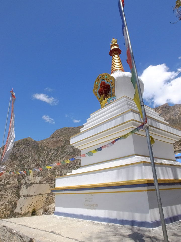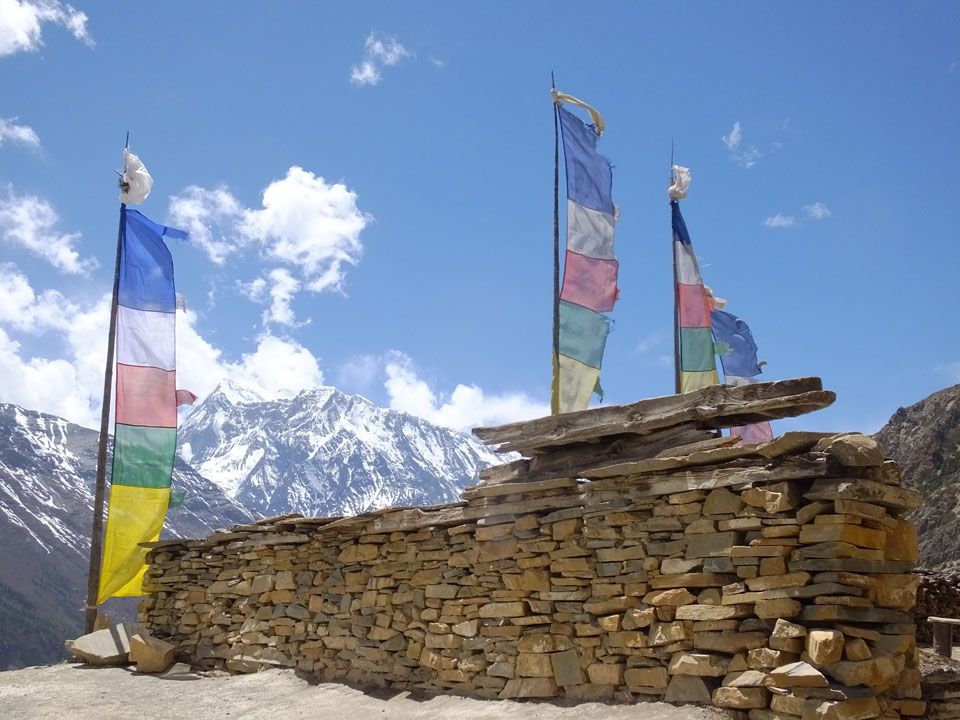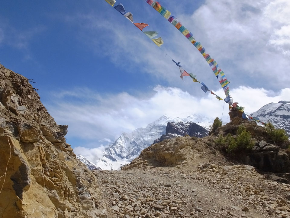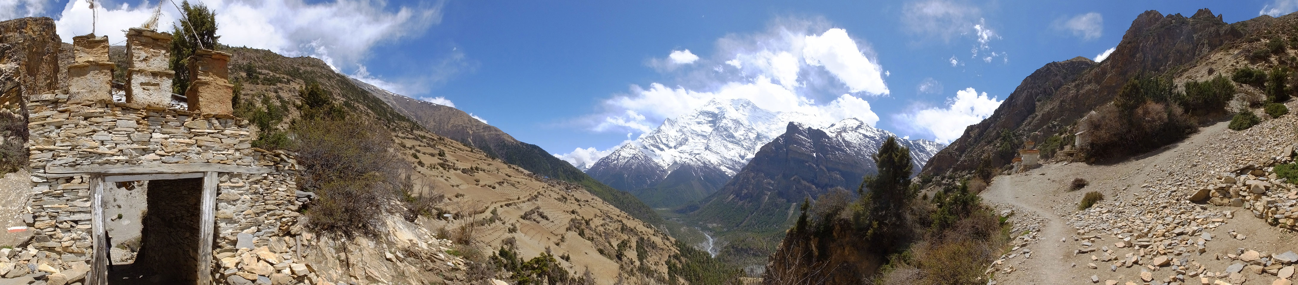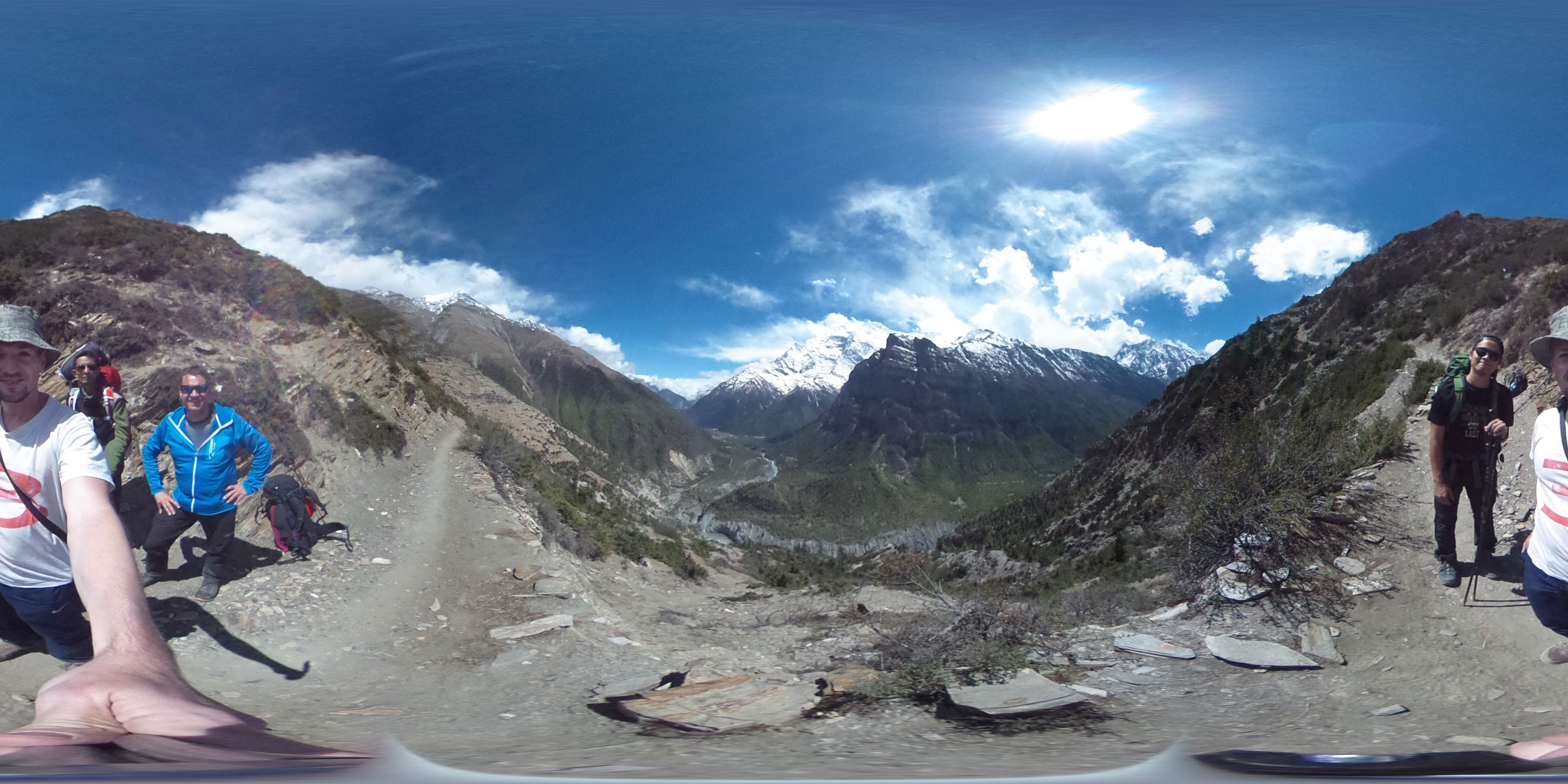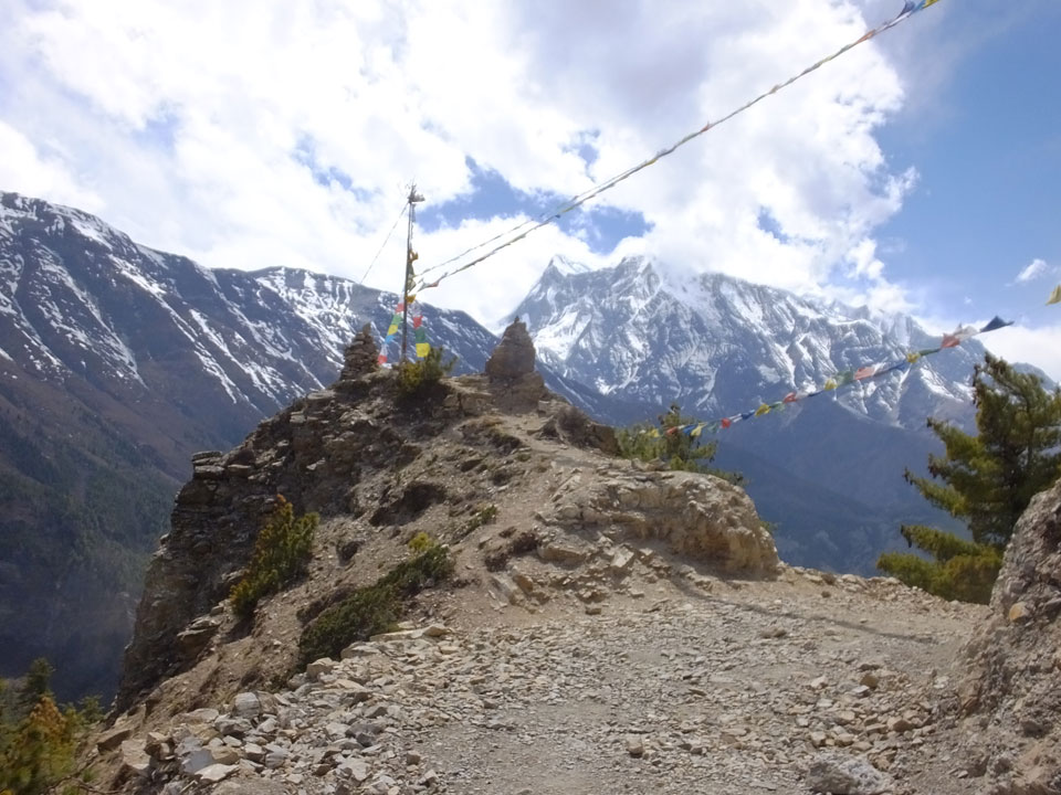 Weiter ging’s auf der Tour raus aus dem Dorf und immer weiter hoch. Hubschrauber flogen ab und zu mal vorbei. Inzwischen waren wir höher als die Helicopter. Das Panorama mit den vielen hohen Bergen war einfach super. Viele Stupas oder Gebetstürmchen standen hier in der Höhe herum mit flatternden Fahnen. Obwohl ich mit meinem Rucksack schwer und kompliziert bepackt war, entschied ich mich endlich mal für die Theta. Die 360° Bilder zeigen doch besser, wie es insgesamt hier so aussieht.