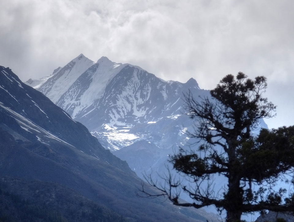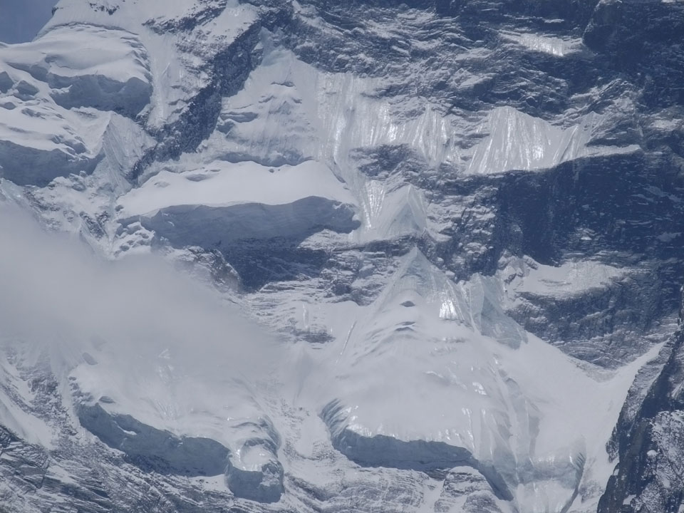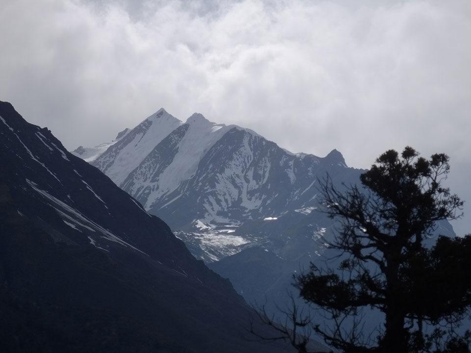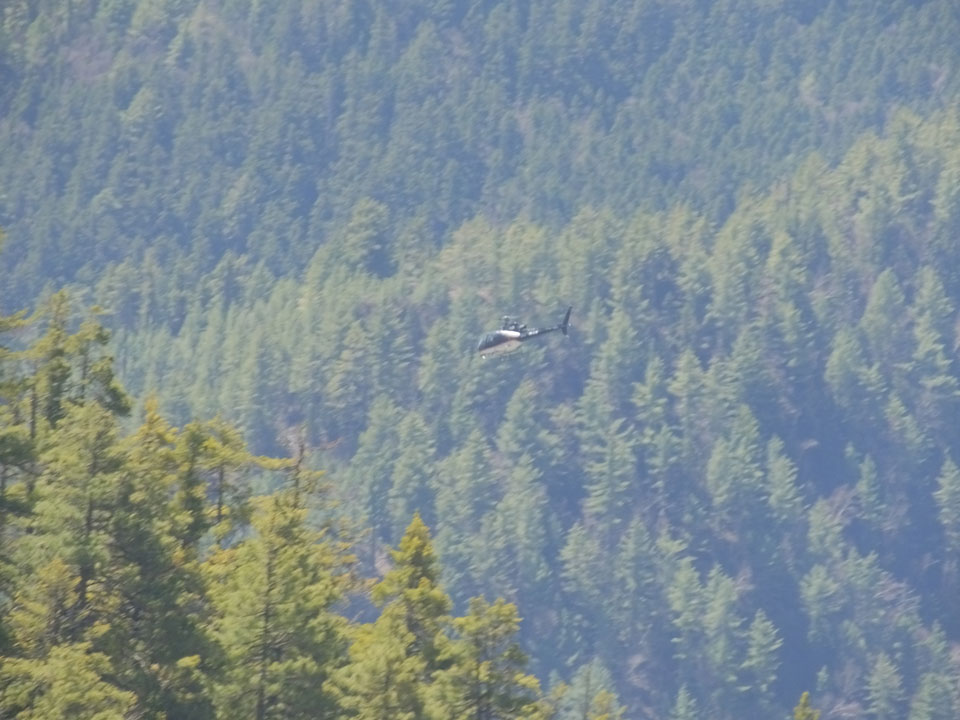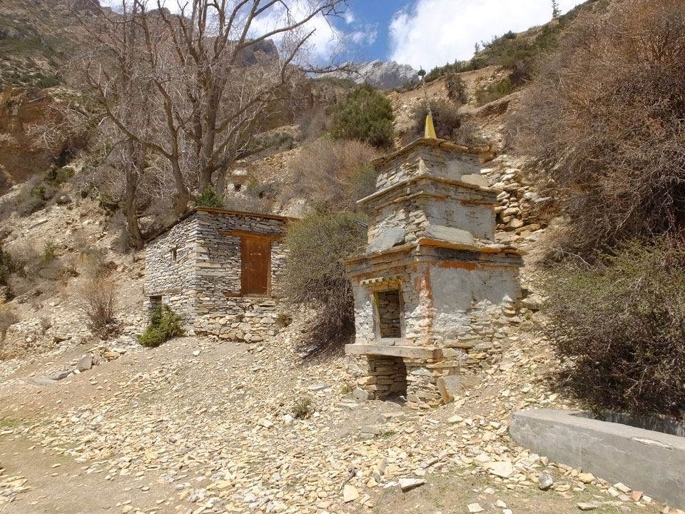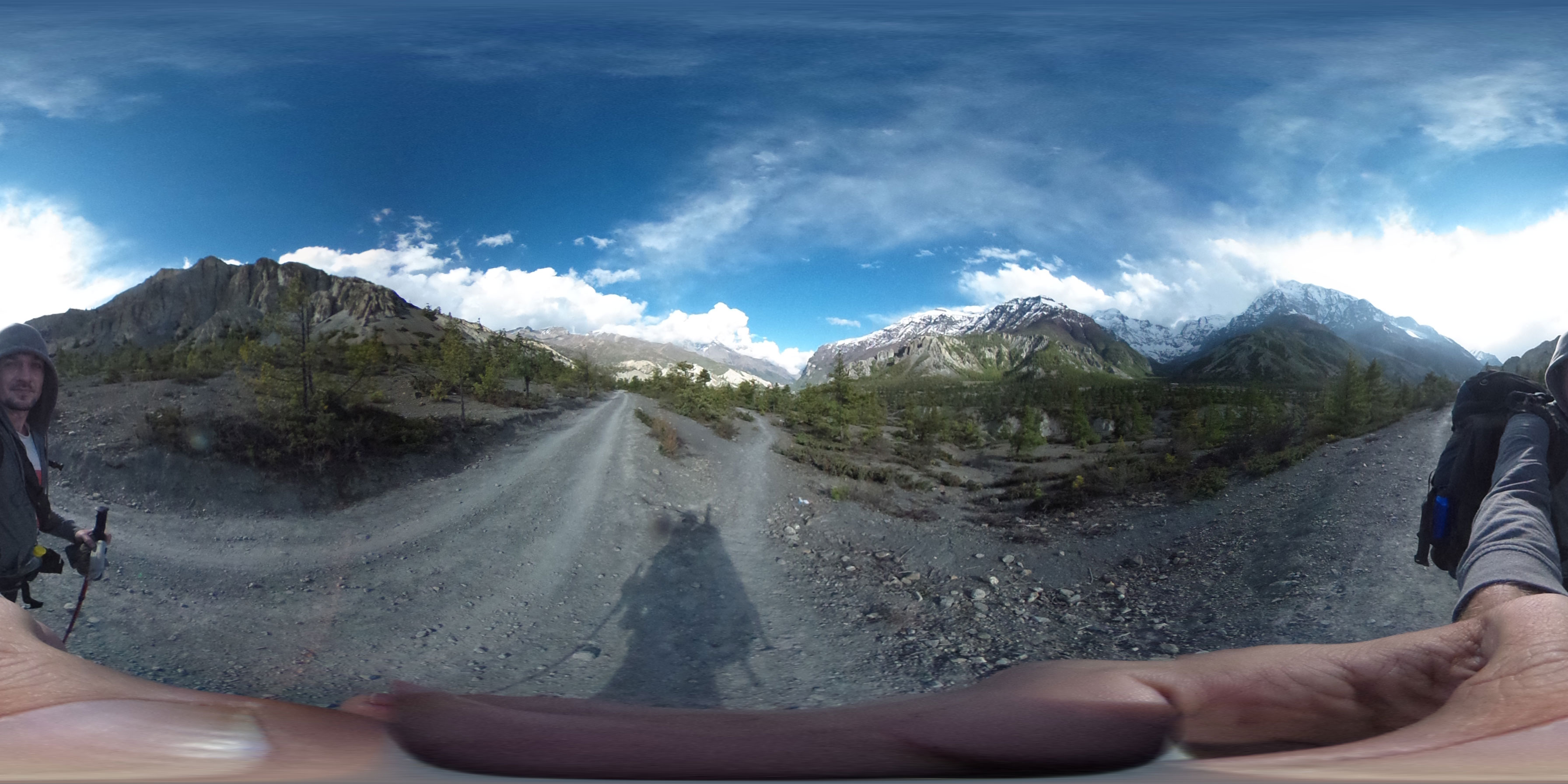 Weiter ging’s auf der Tour raus aus dem Dorf und immer weiter hoch. Hubschrauber flogen ab und zu mal vorbei. Inzwischen waren wir höher als die Helicopter. Das Panorama mit den vielen hohen Bergen war einfach super. Viele Stupas oder Gebetstürmchen standen hier in der Höhe herum mit flatternden Fahnen. Obwohl ich mit meinem Rucksack schwer und kompliziert bepackt war, entschied ich mich endlich mal für die Theta. Die 360° Bilder zeigen doch besser, wie es insgesamt hier so aussieht.