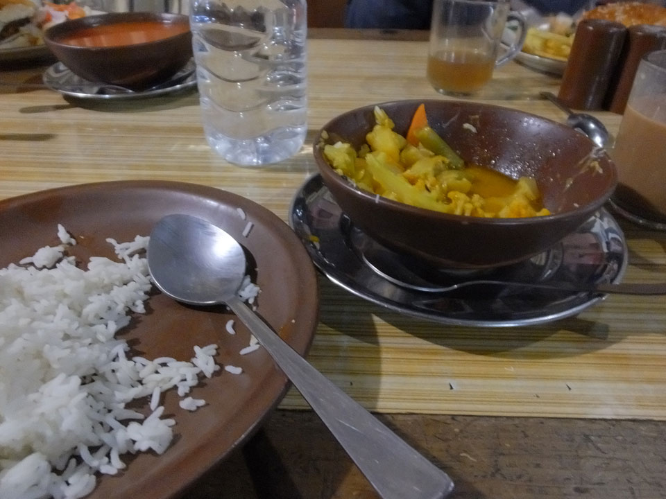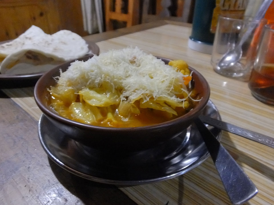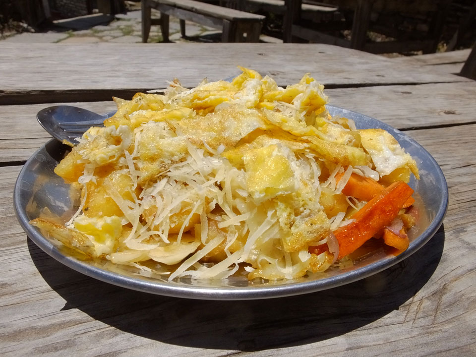 Alle bestellten Kartoffeln. Ich die Yak Ru Fried Potatoes (400 NRP). Nach einer Weile kamen die Sachen an, meins mit Ei und Yak Käse. Alles schmeckte. Die Frau des Hauses war sogar im Reiseführer des Deutschen drin, was ihr Sohn gleich erkannte und uns zeigte.