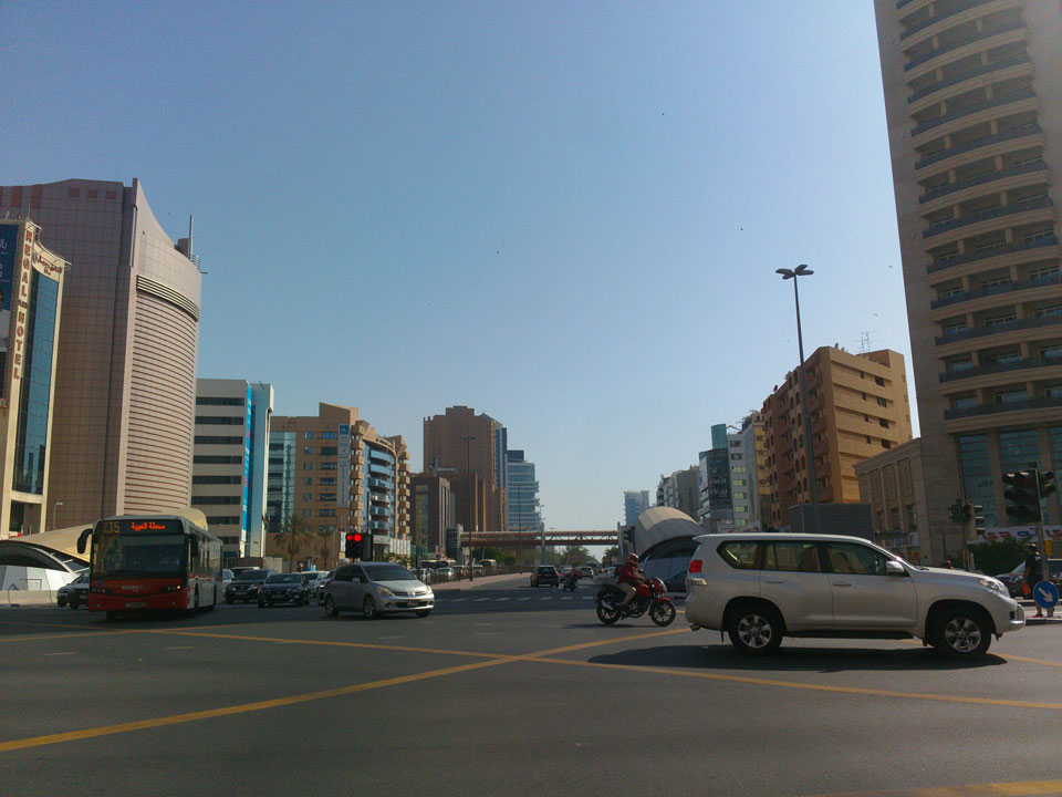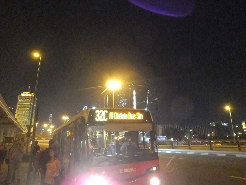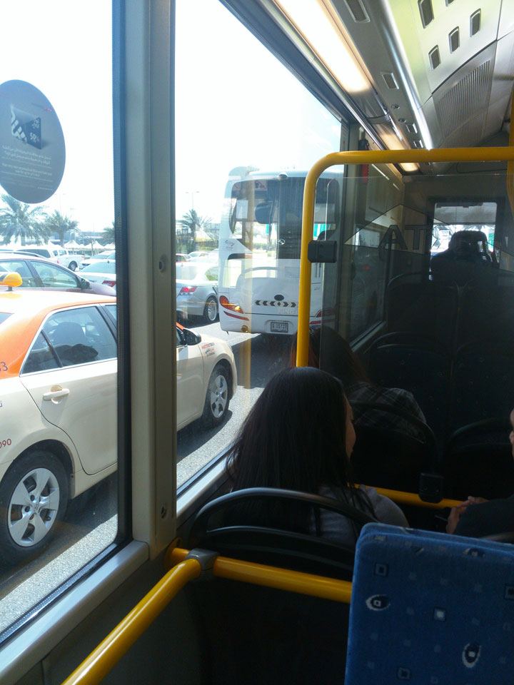 Dubais Nahverkehrssystem funktioniert mit RFID Karten. Per Kreditkarte kann man die in den Metro-Station aufladen. An der Bushaltestelle wollte man Cash. Ich fuhr dann endlich mit dem Bus Richtung Jumeirah Beach, ohne genügend Credits für die Rückfahrt. Dort aber stieg niemand aus. Ein paar Jungs wollten auch zum Strand und so ging die Fahrt weiter.