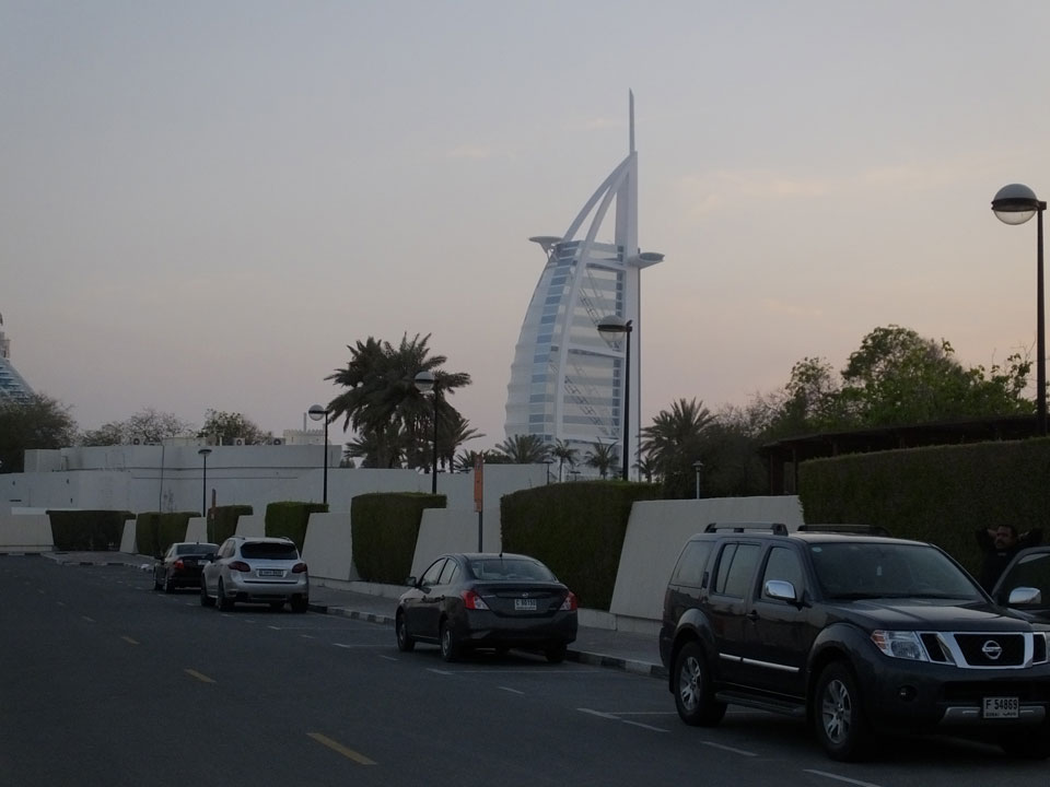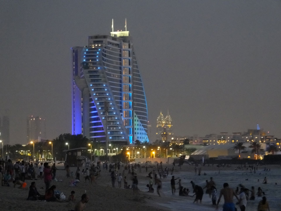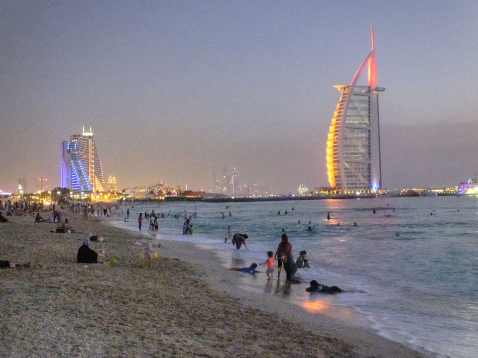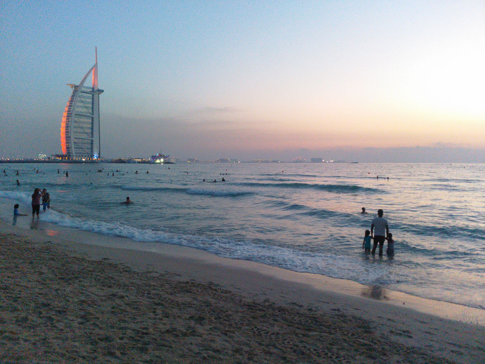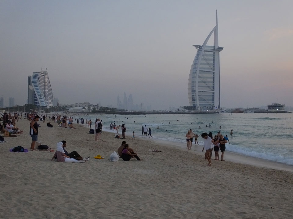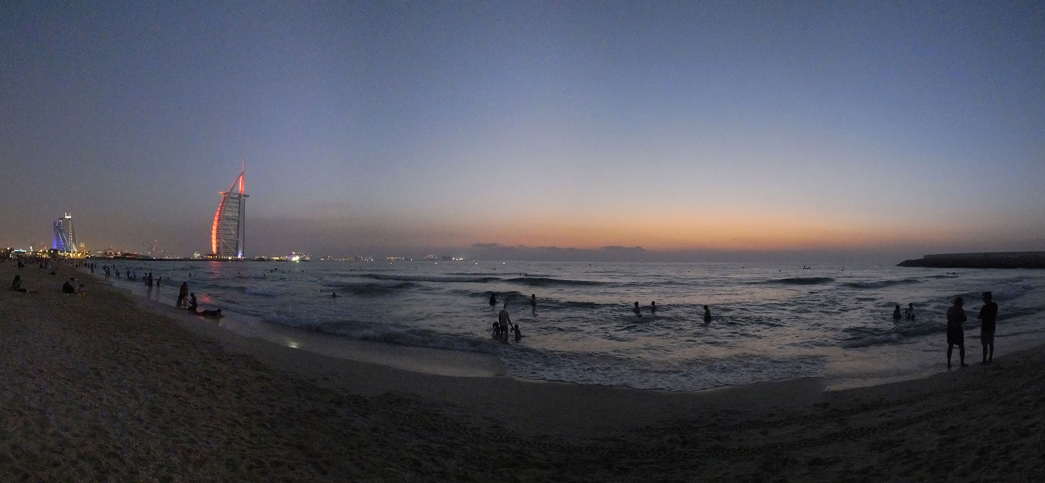 Im Bus roch es nach ein paar Bremsmanövern nach verkohlten Bremsscheiben. Wir mussten den Bus wecheln und es wurde immer später. Über eine Stunde brauchte ich bis Marina Beach. Dort sah ich das berühmte Burj Al Arab Hotel in Segelform. Ich hüpfte in’s Wasser. Sehr schön und angenehm mit der perfekten Temperatur. Ich blieb recht lange, doch es grauste mir vor’m Heimweg.