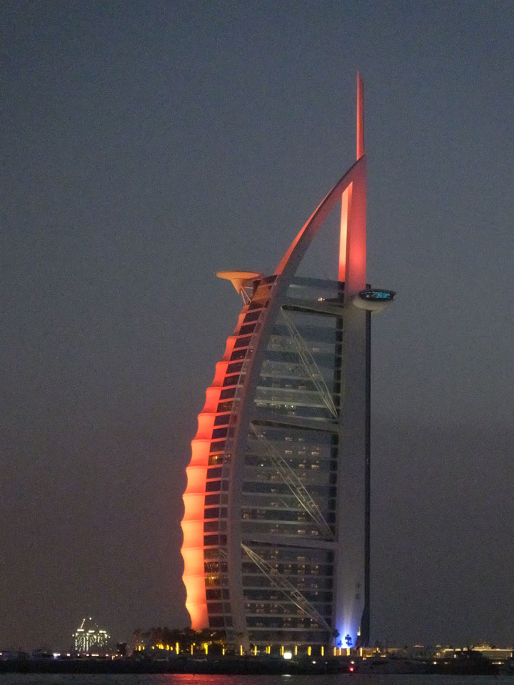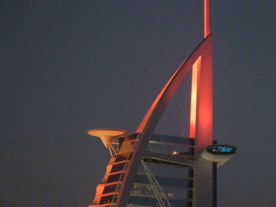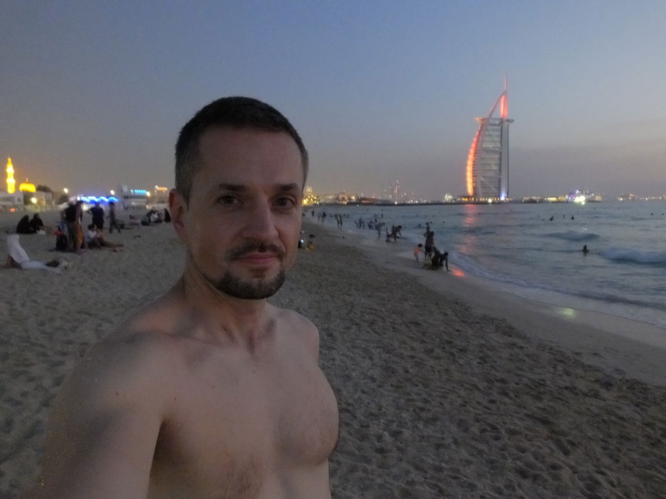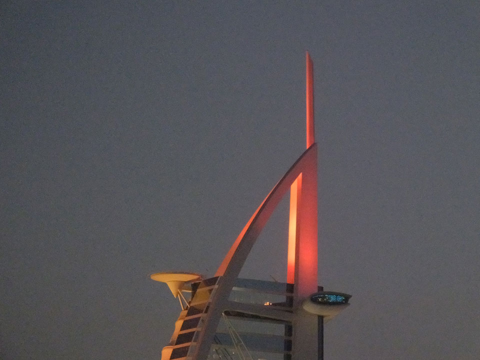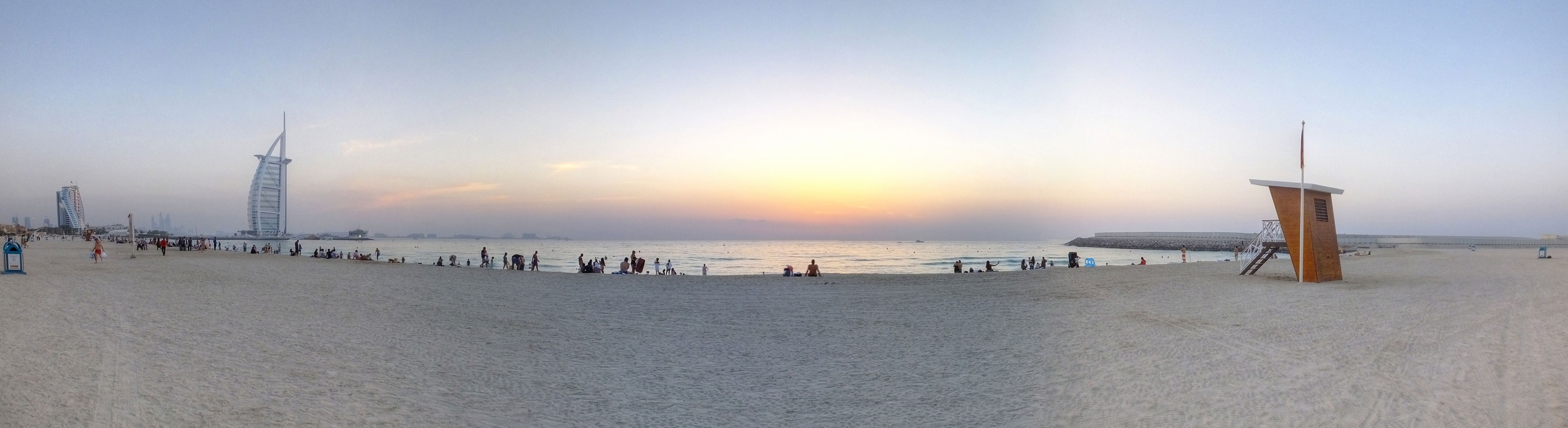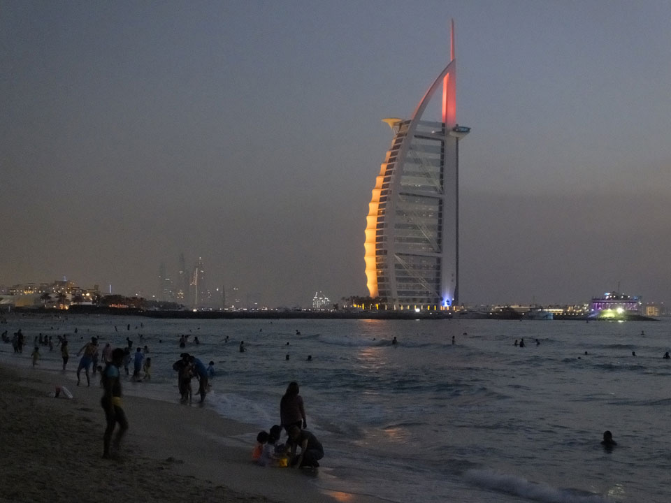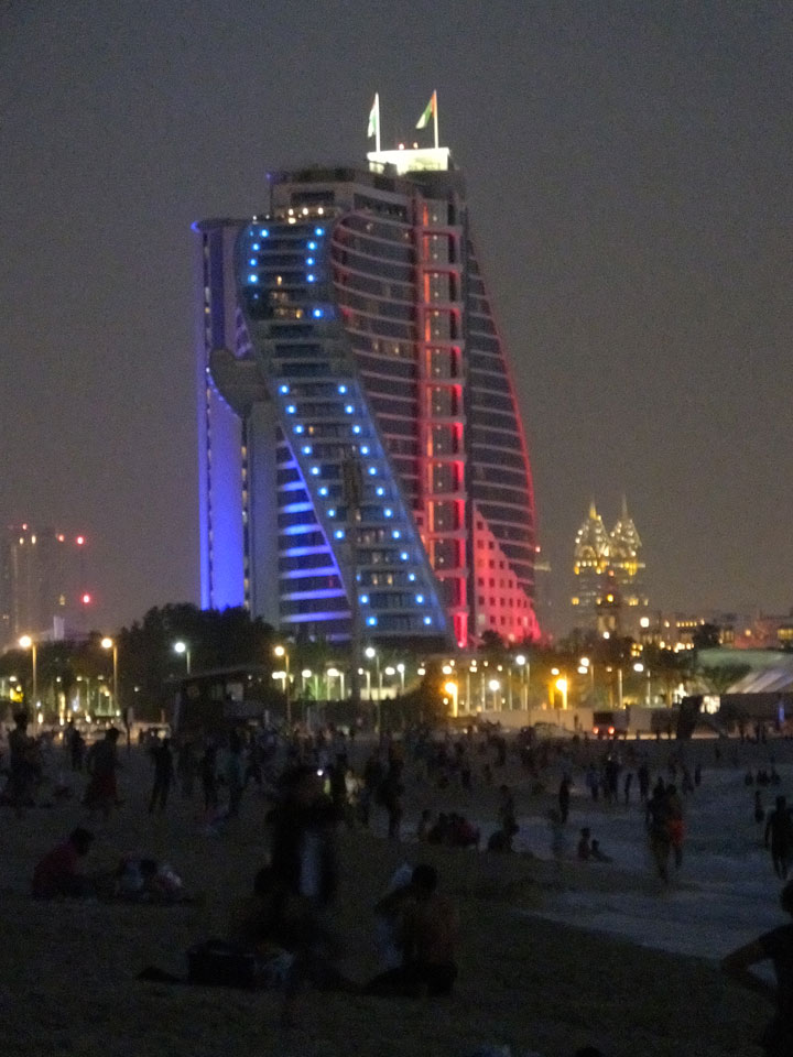 Im Bus roch es nach ein paar Bremsmanövern nach verkohlten Bremsscheiben. Wir mussten den Bus wecheln und es wurde immer später. Über eine Stunde brauchte ich bis Marina Beach. Dort sah ich das berühmte Burj Al Arab Hotel in Segelform. Ich hüpfte in’s Wasser. Sehr schön und angenehm mit der perfekten Temperatur. Ich blieb recht lange, doch es grauste mir vor’m Heimweg.