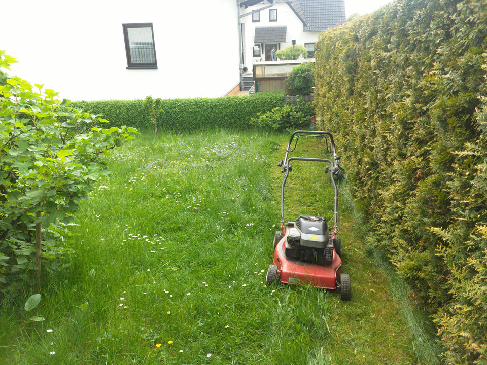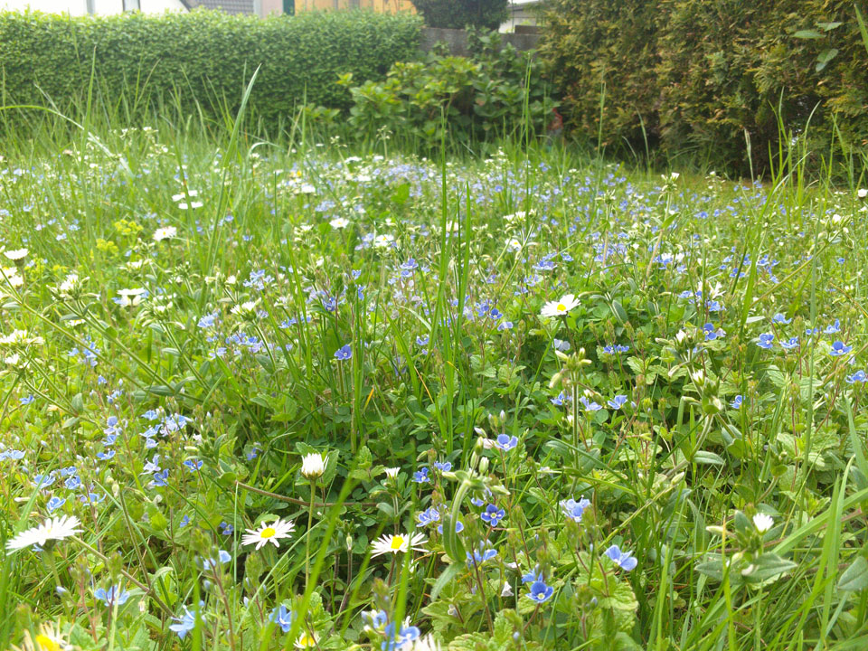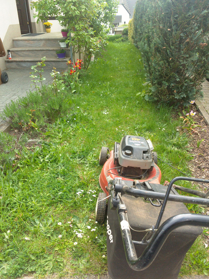 Der Rasen war fällig. Schöne Blümchen jetzt Anfang des Sommers. Der Benzin-Rasenmäher wollte nicht anspringen. Das übliche Problem. Ich zog und zog, dreht ihn auf die Seite und nach einem Tritt dann sprang er doch mal an. Nach der Hälfte des Mähens war dann wieder Schluss.