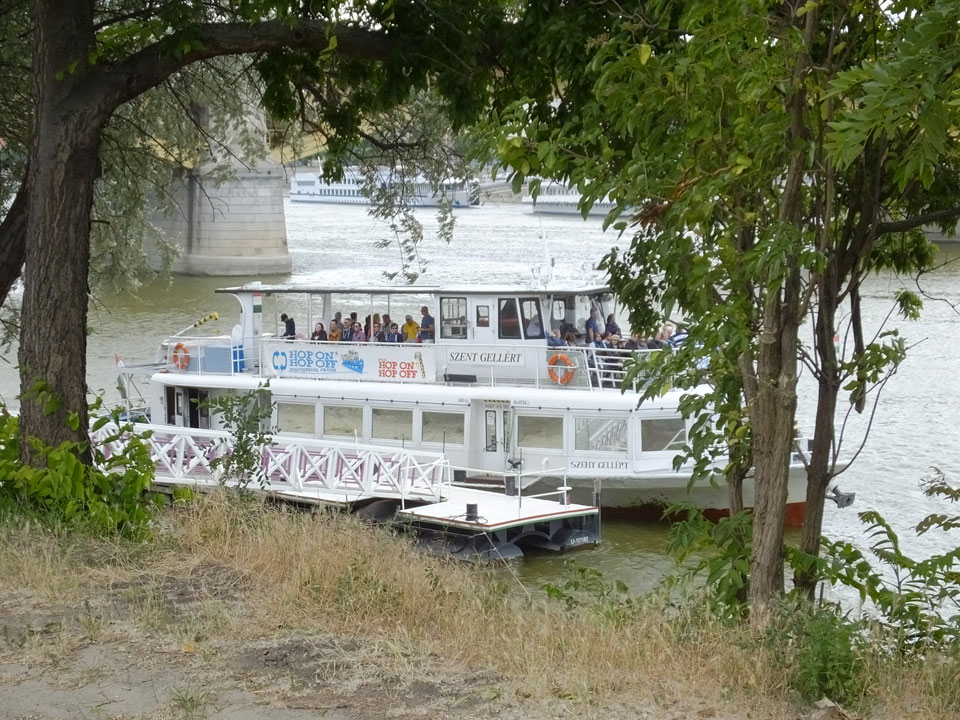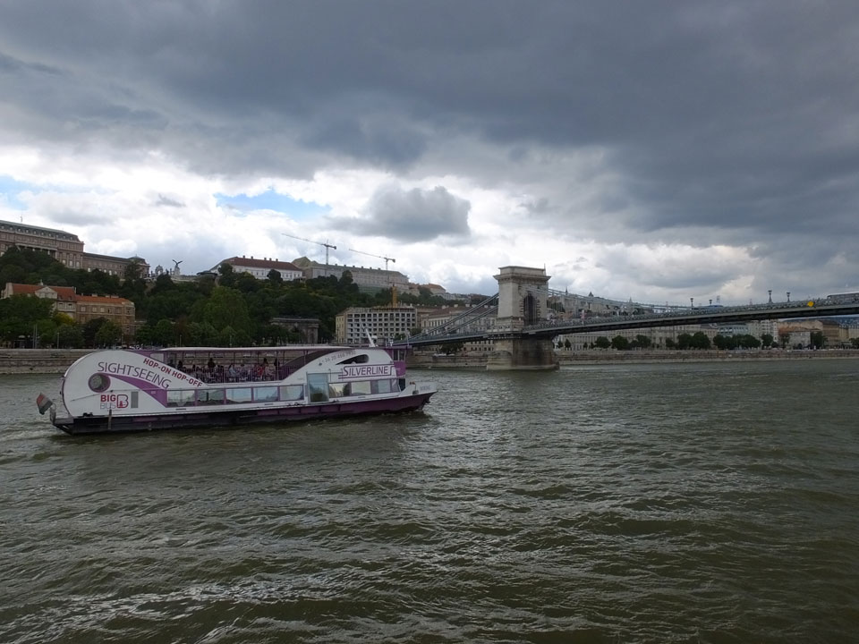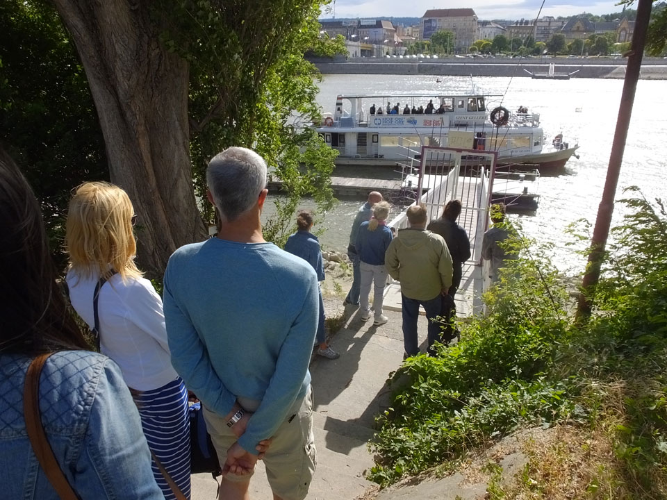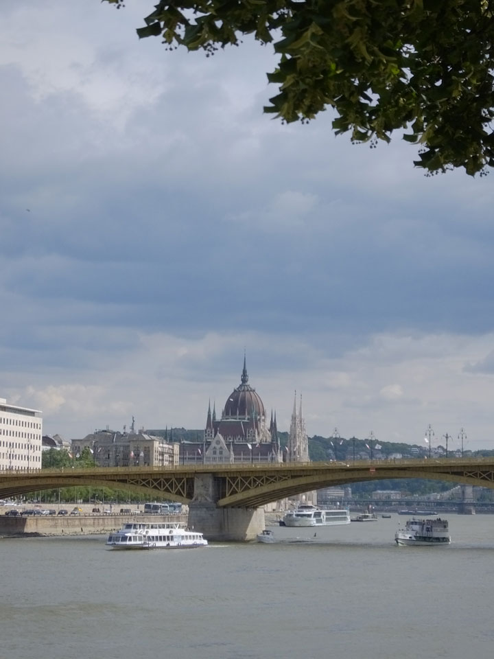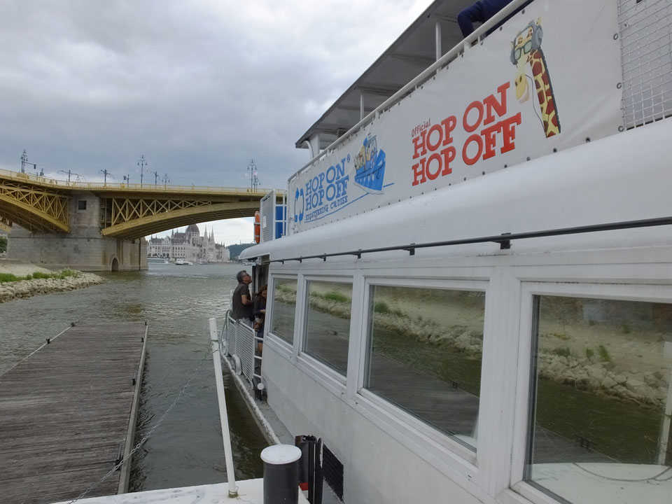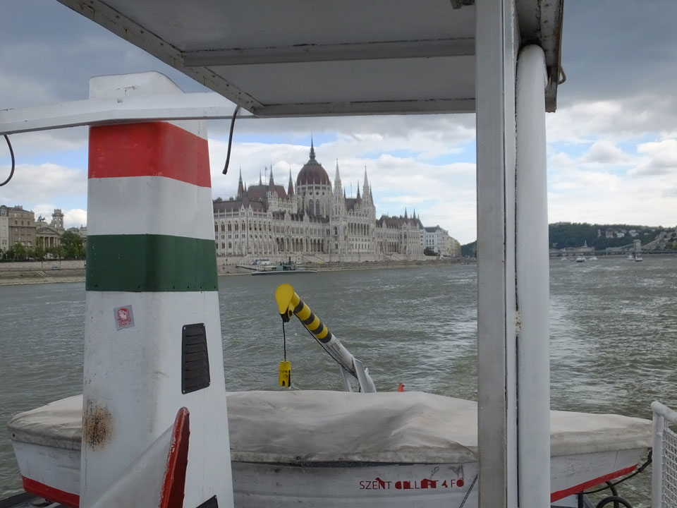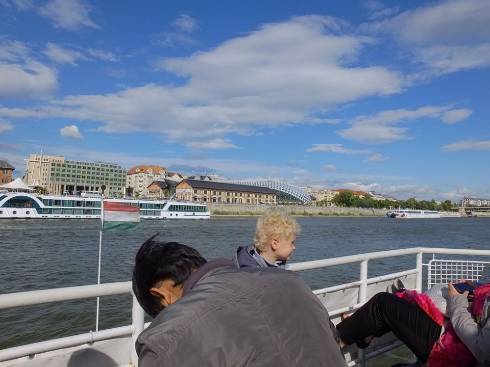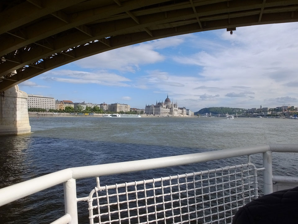 Um 15:00 machte der Markt gerade zu, was schlecht und gut war, denn so kamen wir bis 15:30 zur Boots-Abfahrt. Ein windiger Tag heute. Gerade mal 5′ warteten wir, dann ging es auf eine kleine Runde auf der Donau zur Margareteninsel.