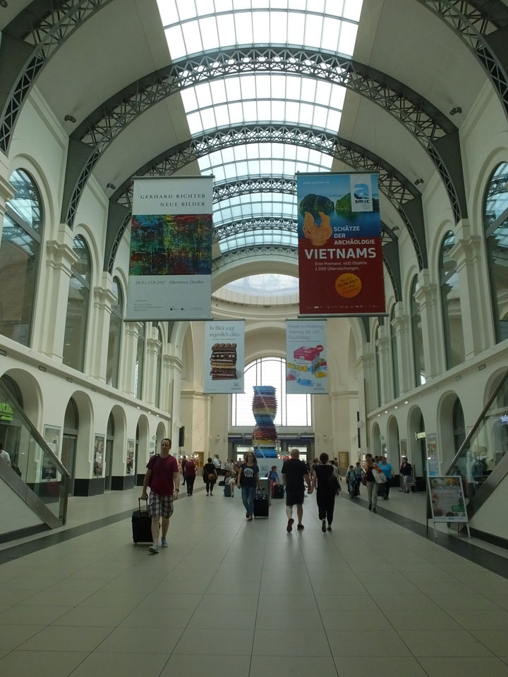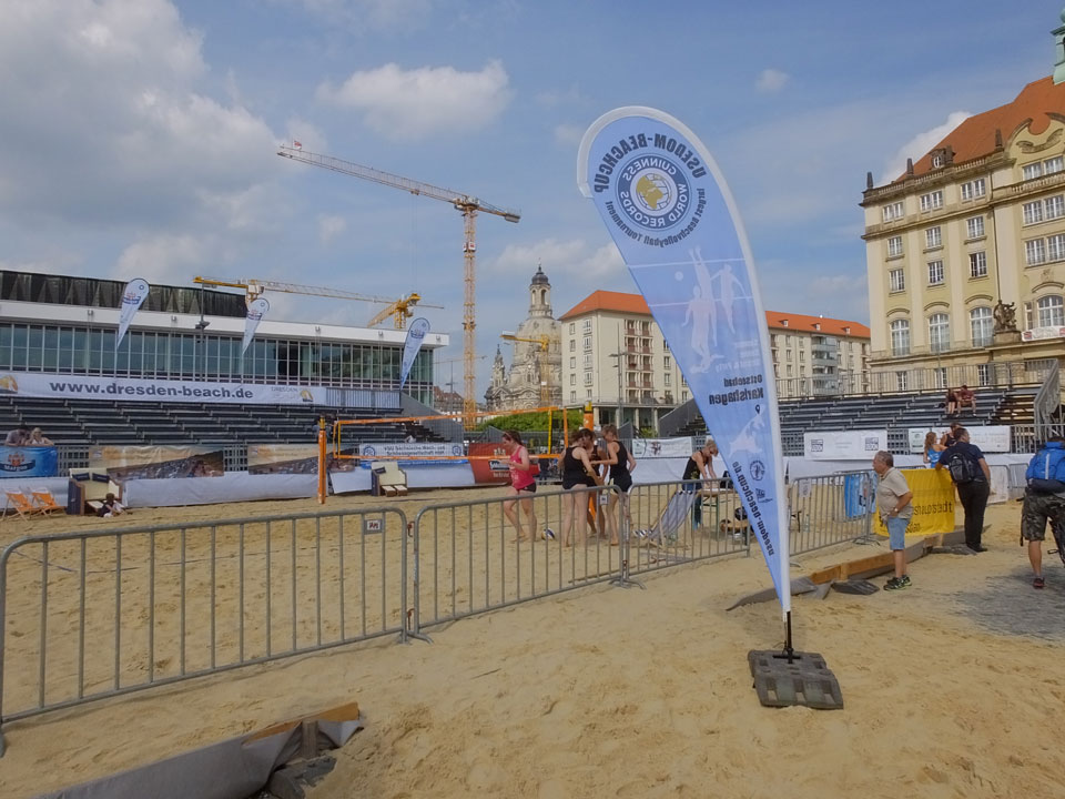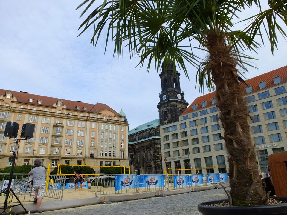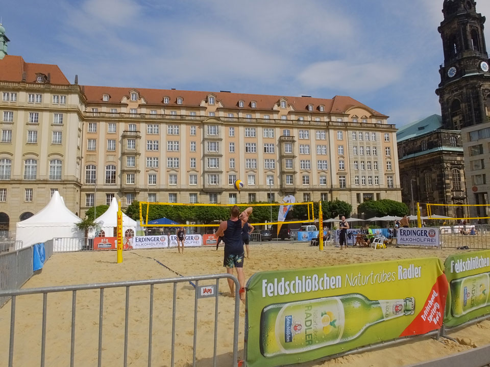 Bis zum nächsten Zug 19:06 nach Chemnitz wäre es knapp geworden. Auf dem Altmarkt setzten wir uns auf eine Limo in ein paar Liegestühle und schauten den letzten Spielen des Beachvolleyball-Turniers zu. Dann zum Hauptbahnhof, verspäteter Zug und eine Bummelfahrt nach Chemnitz-Siegmar.