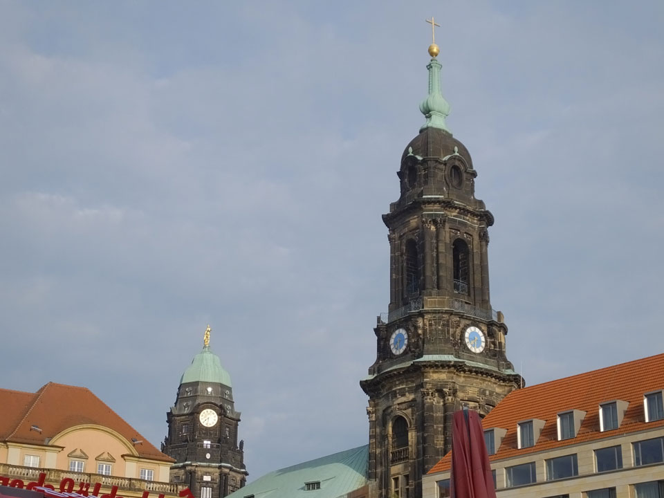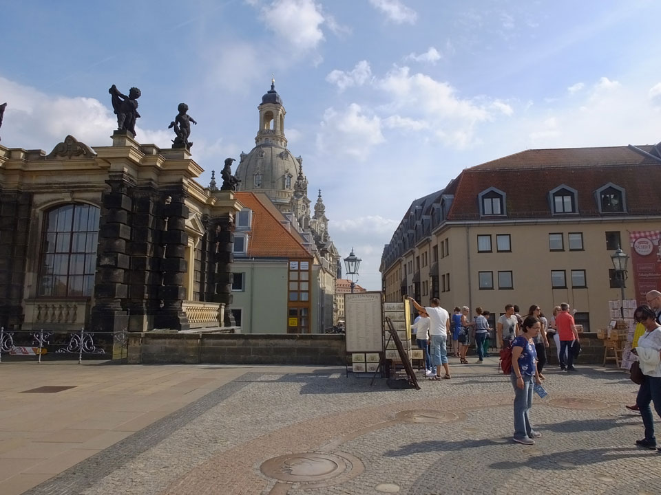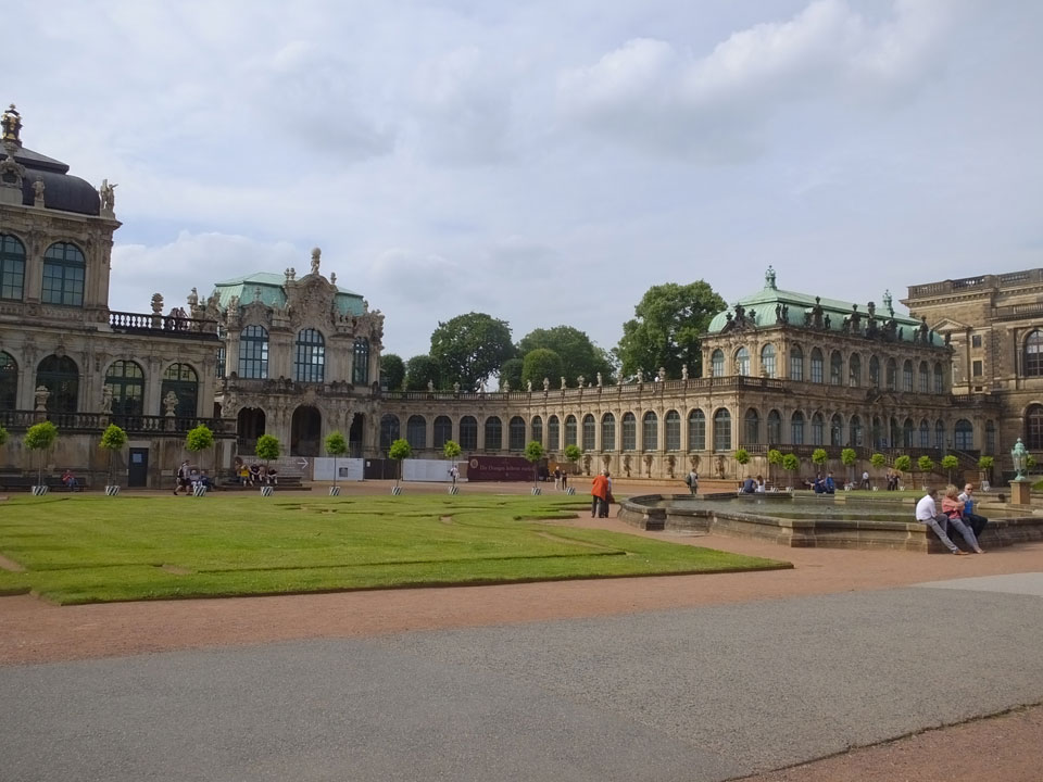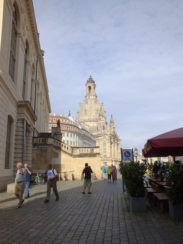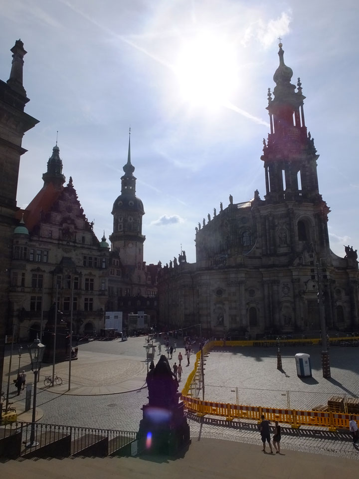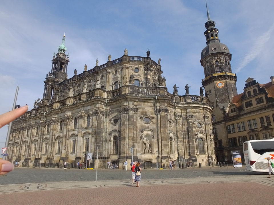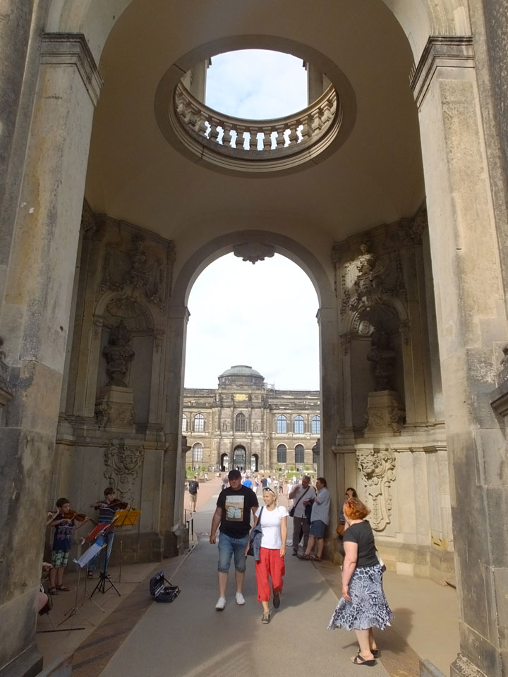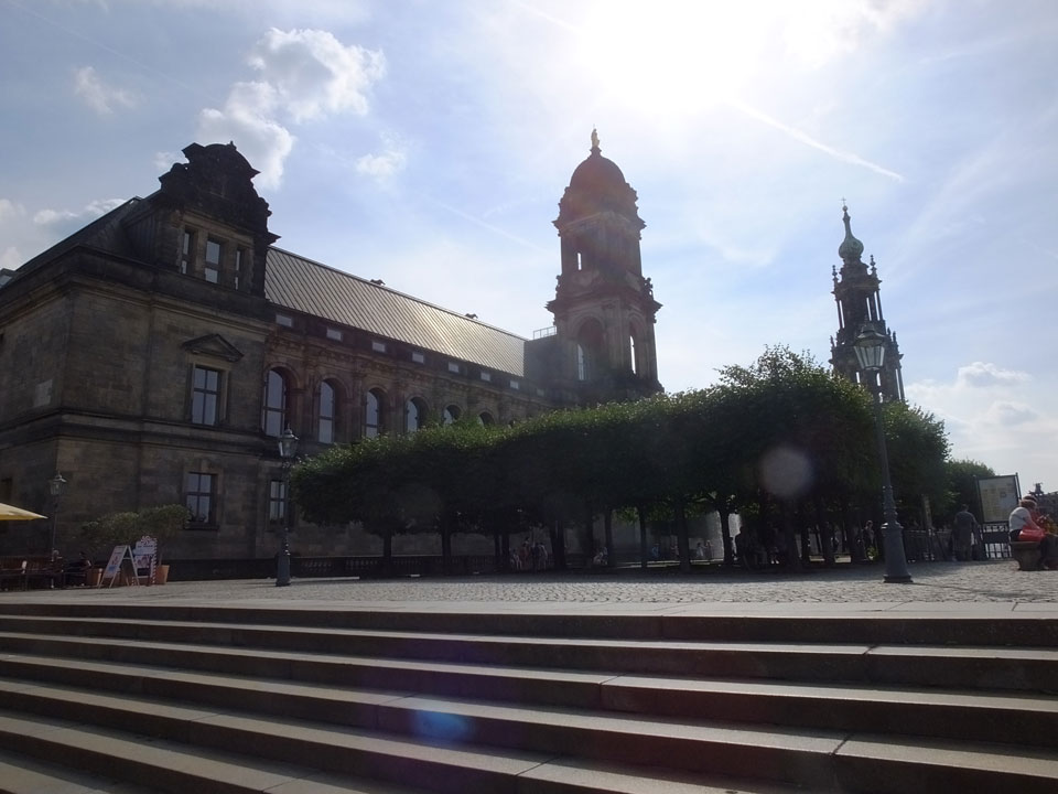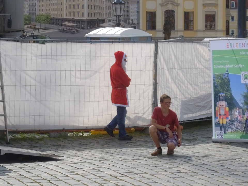 Wir verstauten das Gepäck am Bahnhof (€4) und gingen dann in die Altstadt. Jemandem gefiel Deutschland sehr gut. Mir gefiel weniger, dass jedes größere Schuhgeschäft gecheckt werden musste. Wir kamen zum Altmarkt. Da wurden Weihnachtslieder gesungen. Ich erfuhr, dass morgen der Johannistag sei – ein halbes Jahr vor Heiligabend. Es ging weiter über die geschlossene Frauenkirche an’s Elbufer mit den vielen alten Häuser und Museen. Die Semperoper und besonders der Zwinger gefielen besonders. Ein paar Kinder spielten klassische Musik.