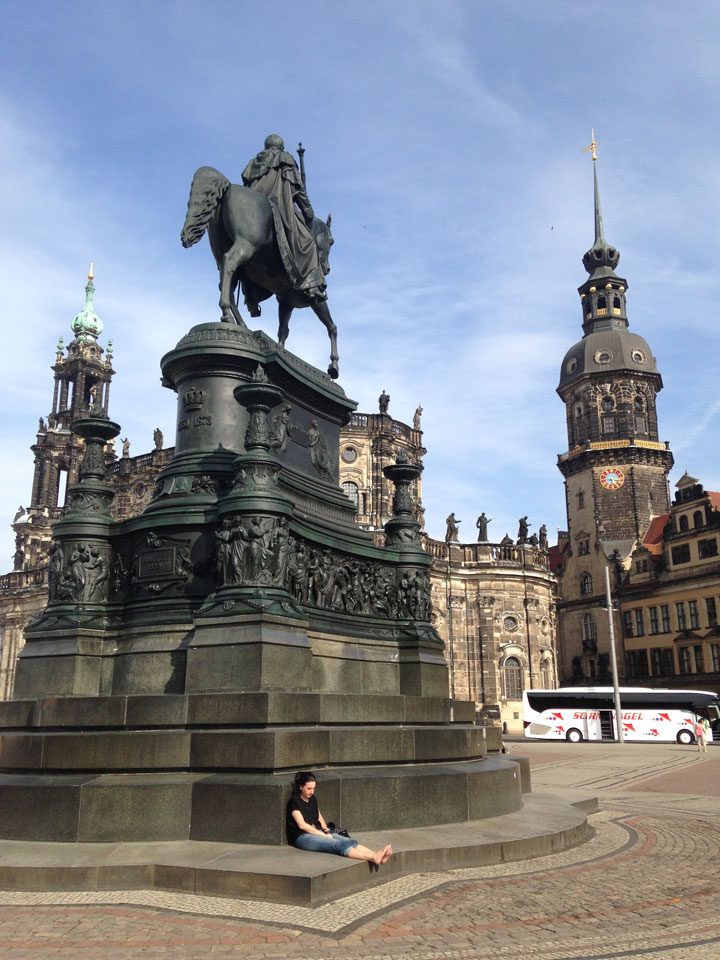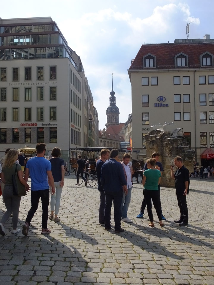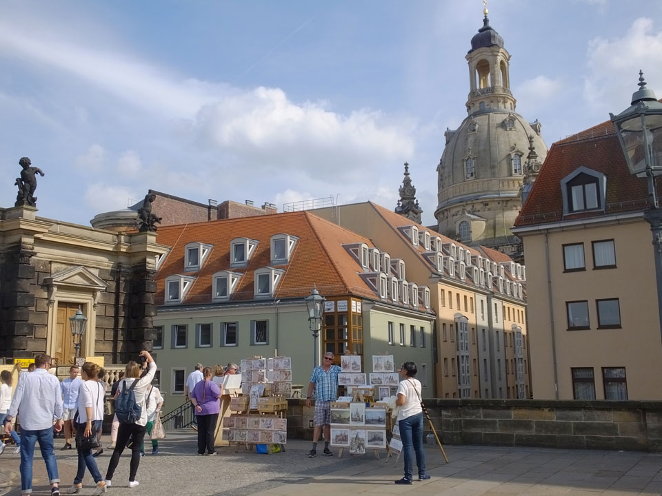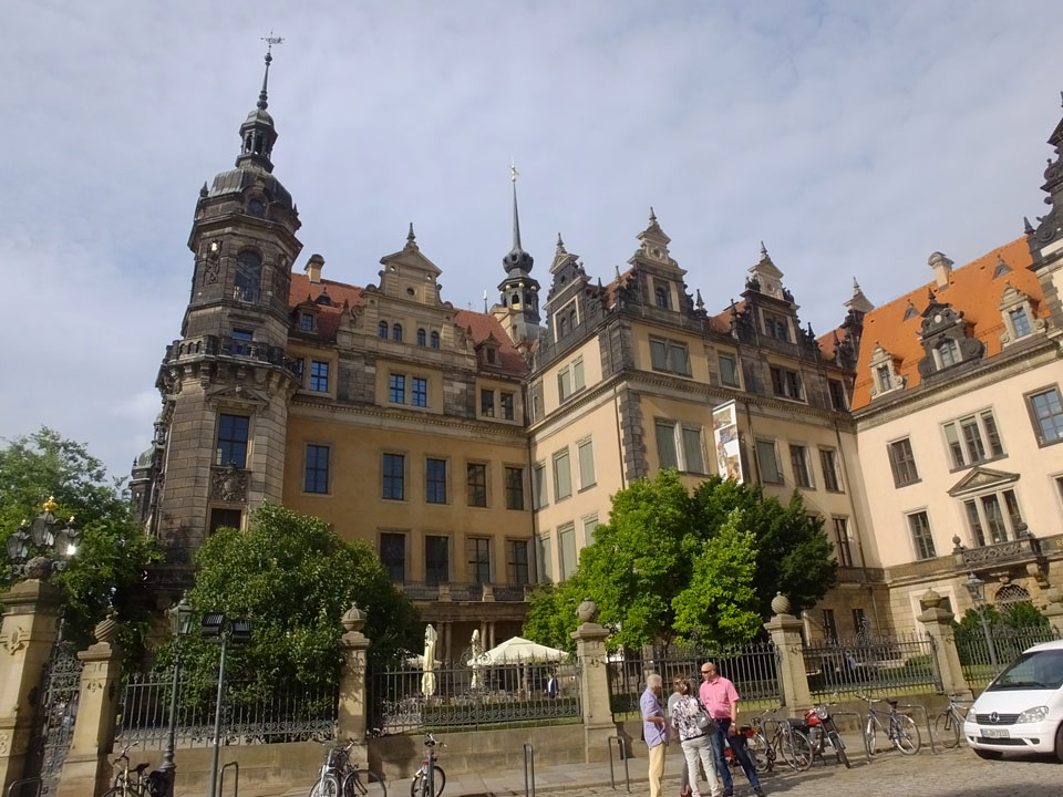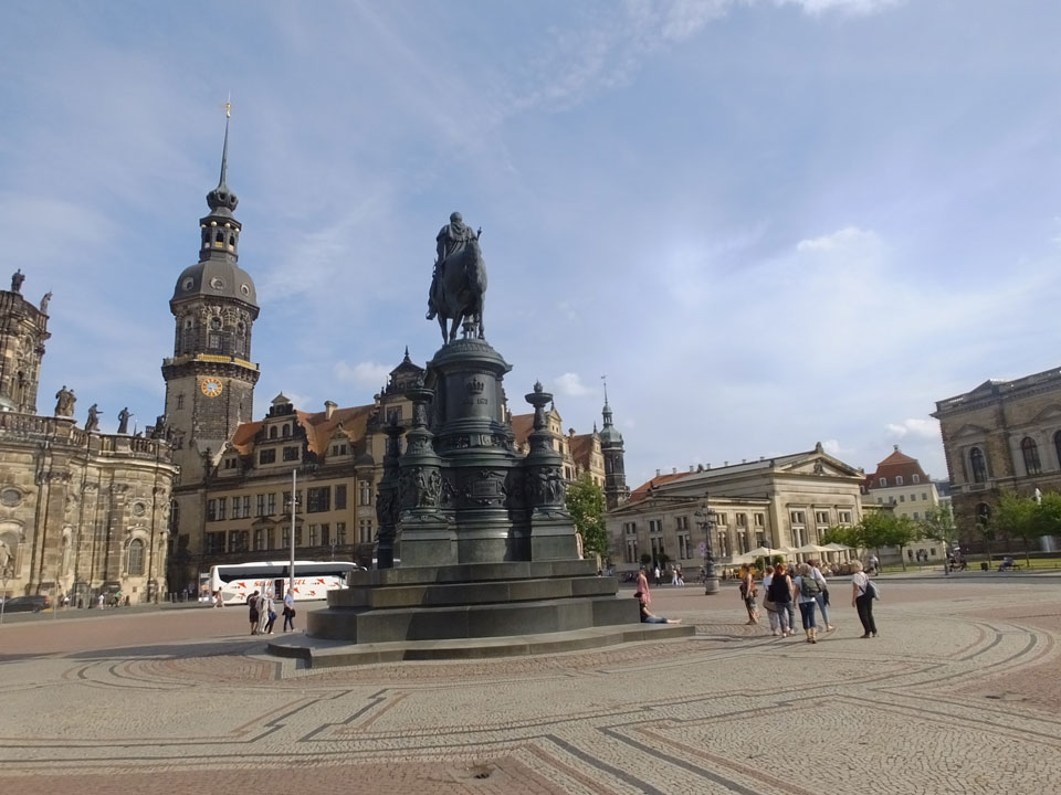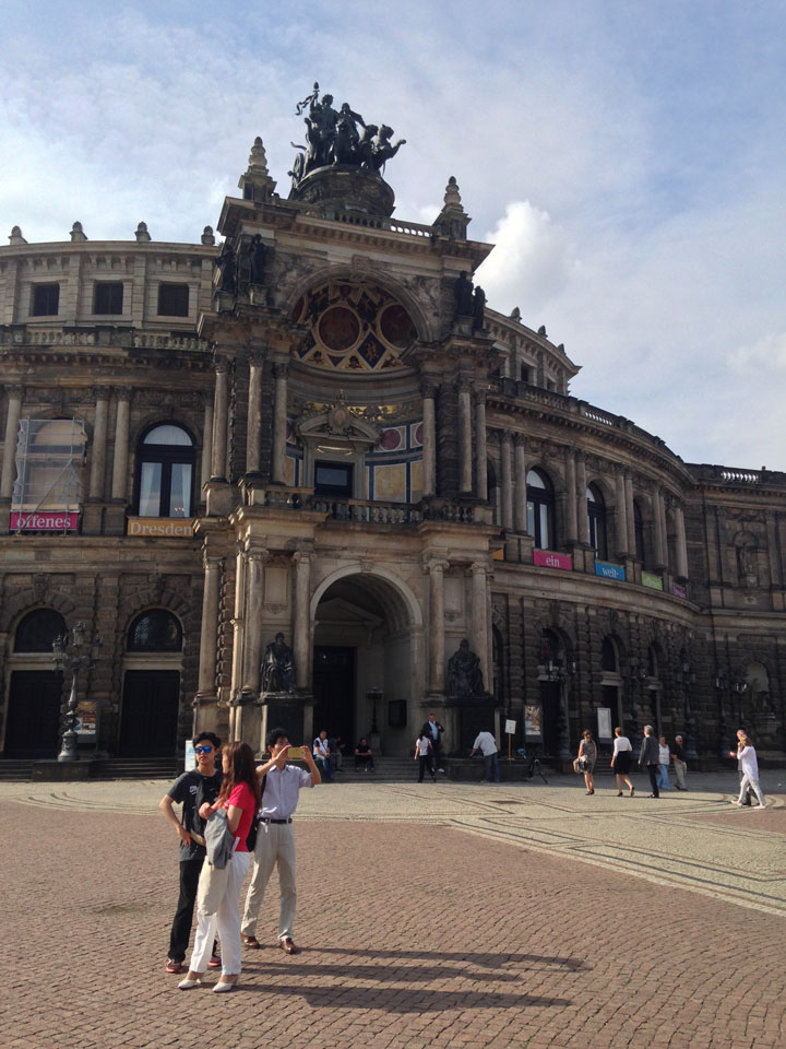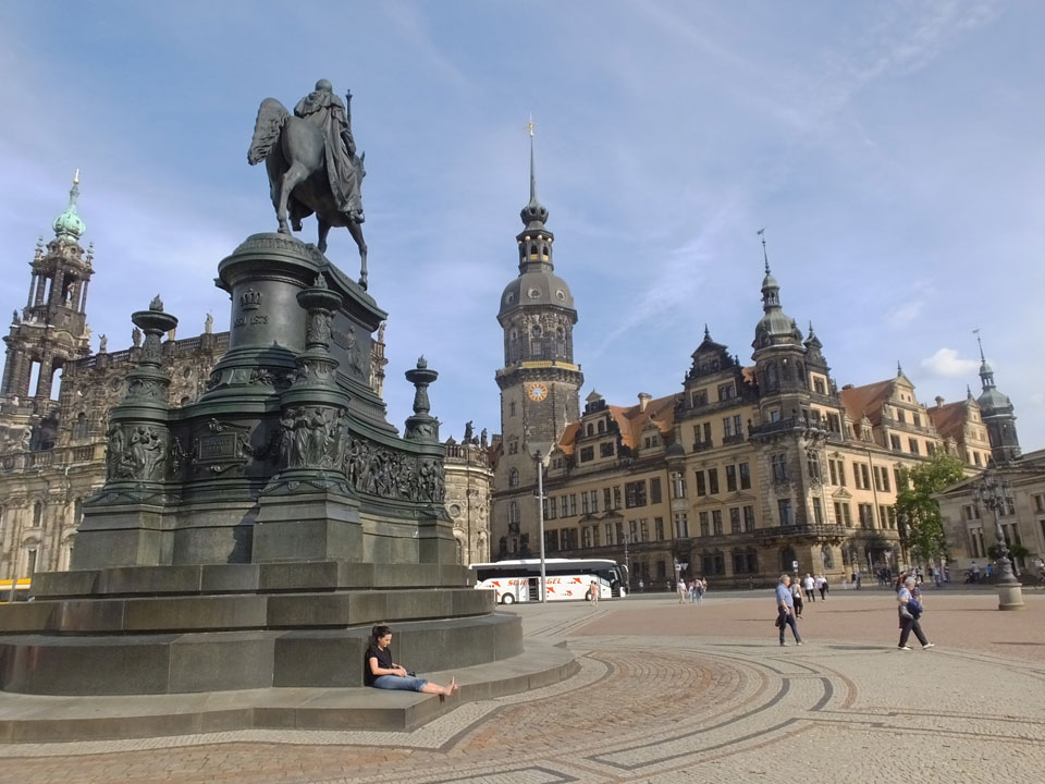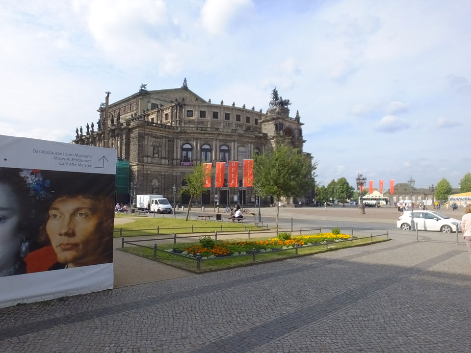 Wir verstauten das Gepäck am Bahnhof (€4) und gingen dann in die Altstadt. Jemandem gefiel Deutschland sehr gut. Mir gefiel weniger, dass jedes größere Schuhgeschäft gecheckt werden musste. Wir kamen zum Altmarkt. Da wurden Weihnachtslieder gesungen. Ich erfuhr, dass morgen der Johannistag sei – ein halbes Jahr vor Heiligabend. Es ging weiter über die geschlossene Frauenkirche an’s Elbufer mit den vielen alten Häuser und Museen. Die Semperoper und besonders der Zwinger gefielen besonders. Ein paar Kinder spielten klassische Musik.