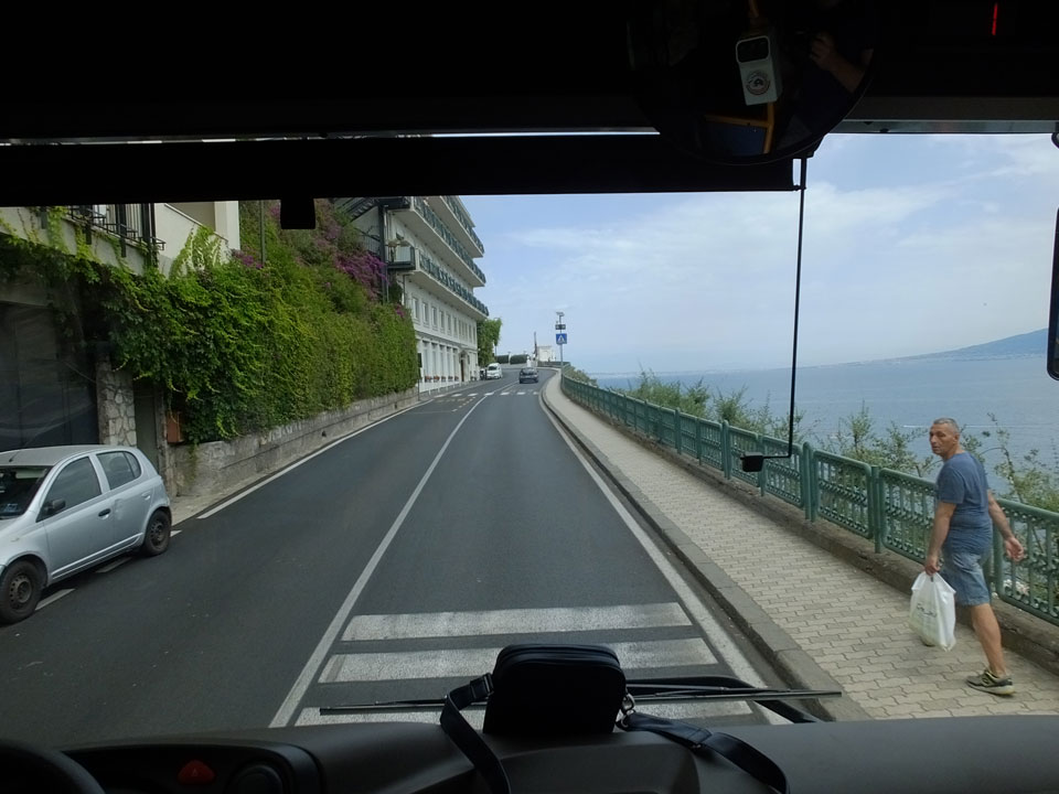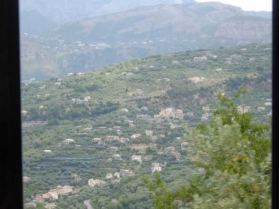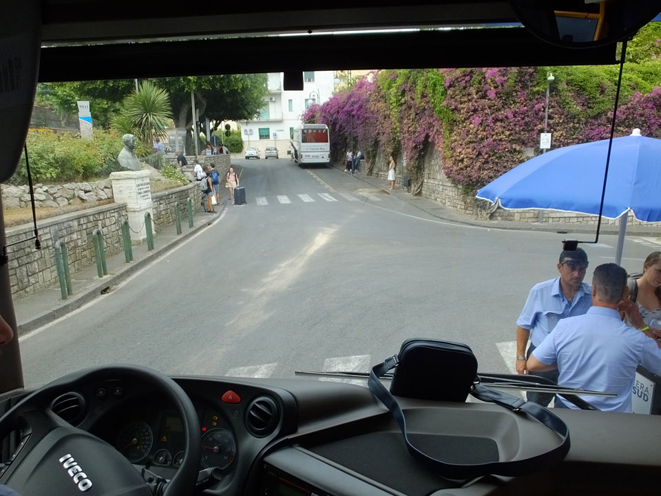 Wir hatten dann Sitzplätze. In Amalfi wollte jemand nach dem Hotel schauen. Ich wusste nur, dass Wunder schlecht zu erwarten seien. Unter €100 ist da wenig los. Wir nahmen den Bus Richtung San Lazzaro. Ich hatte auf Google Maps eine mögliche Haltestelle markiert. Als wir da nach ca. 45′ Fahrt ankamen, gefiel mir die Gegend gar nicht. Es war nichts los, kaum Hotels zu sehen. Wir fuhren weiter, immer weiter den Berg hinauf. Dann, in der Nähe der Endstation bei San Lazzaro stiegen wir aus. Das war ein Fehler.
