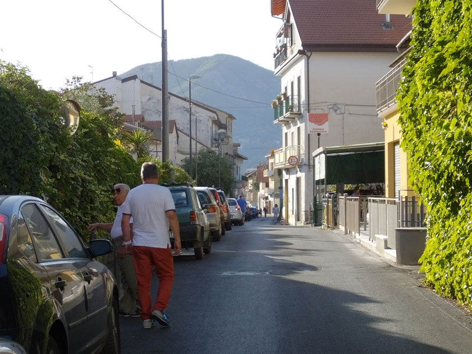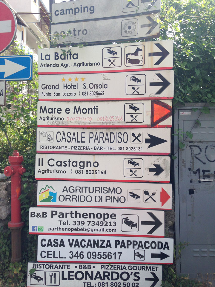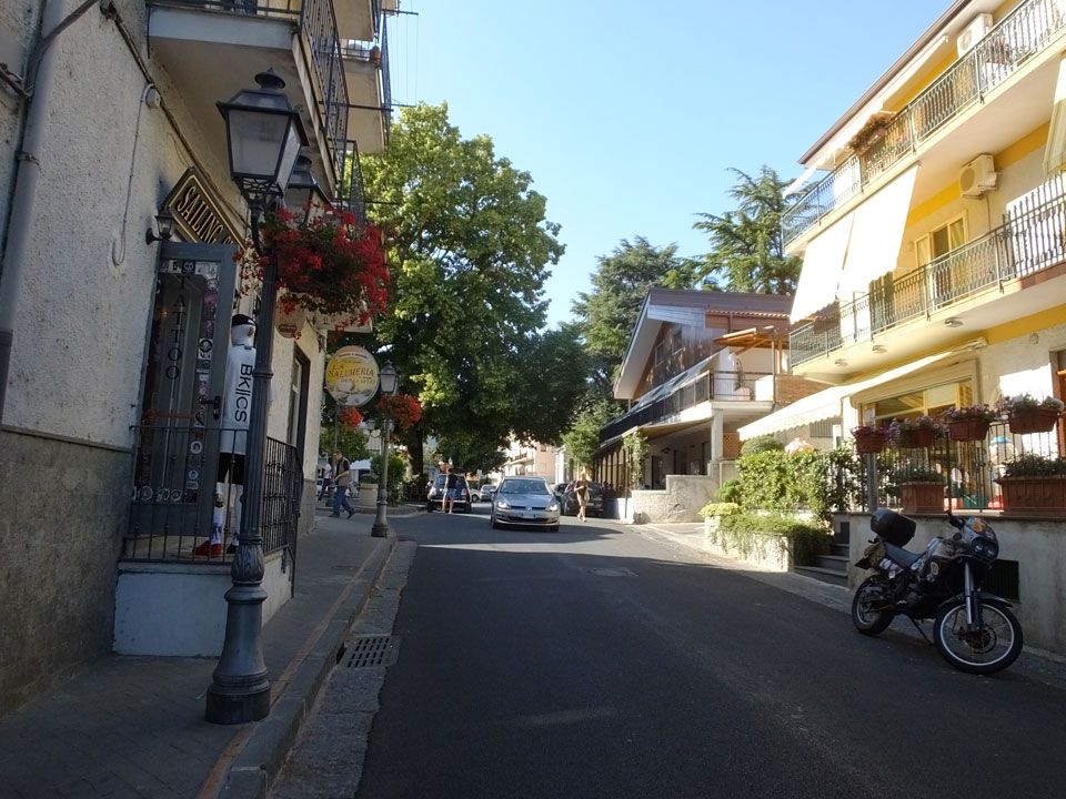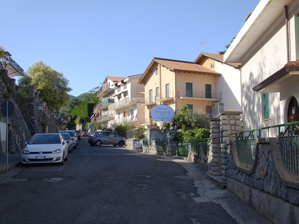Ich musste den Koffer nehmen, denn meine Stimmung war nun auch etwas im Keller. Wir wanderten durch die Pampa, kamen scheinbar in keinen Ort. Hier war noch nichts los. Ich sah schließlich ein Schild mit Telefonnummer von Pensionen. Die erste hatte keine Betten frei, die zweite „Leonardo’s“ bot Betten für €20/Nacht/Person an – also €40/Zimmer oder €50 mit Frühstück. Es ging weiter in die Stadt und da sah ich, dass ich 1-2 Stationen zu früh ausstieg. Jetzt waren wir im kleinen Ort San Lazzaro – der Endstation des SITA Busses. Von diesem Ort hatte ich in einem Reisebericht gelesen. Die Leute waren darin ganz begeistert – die Aussicht, die guten Preise und eben die Nähe zum Wanderweg „Path of Gods“.