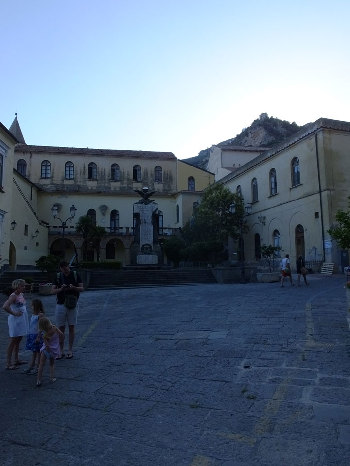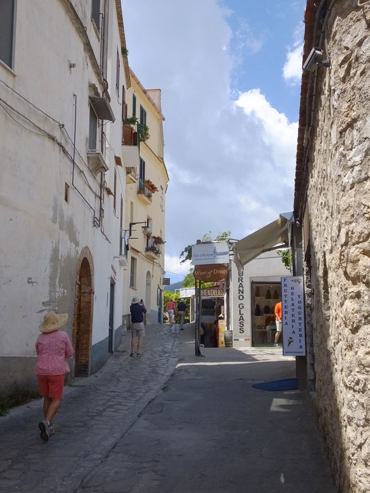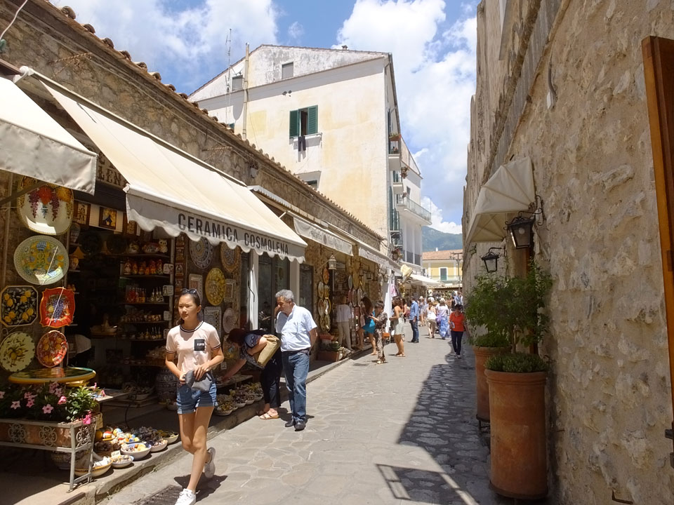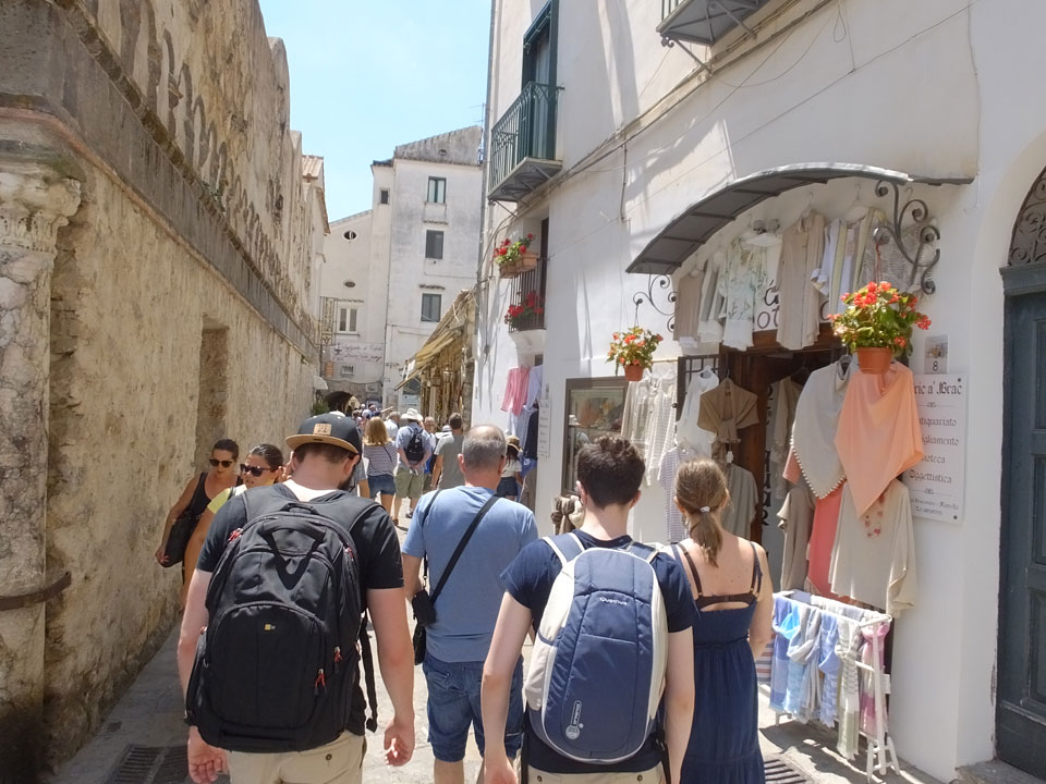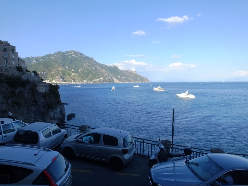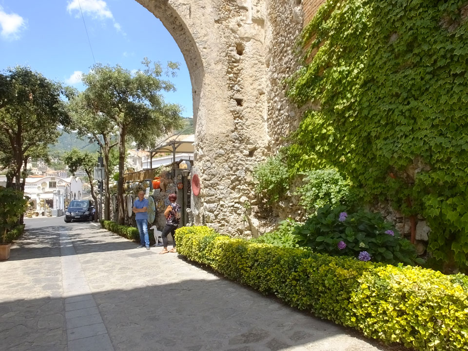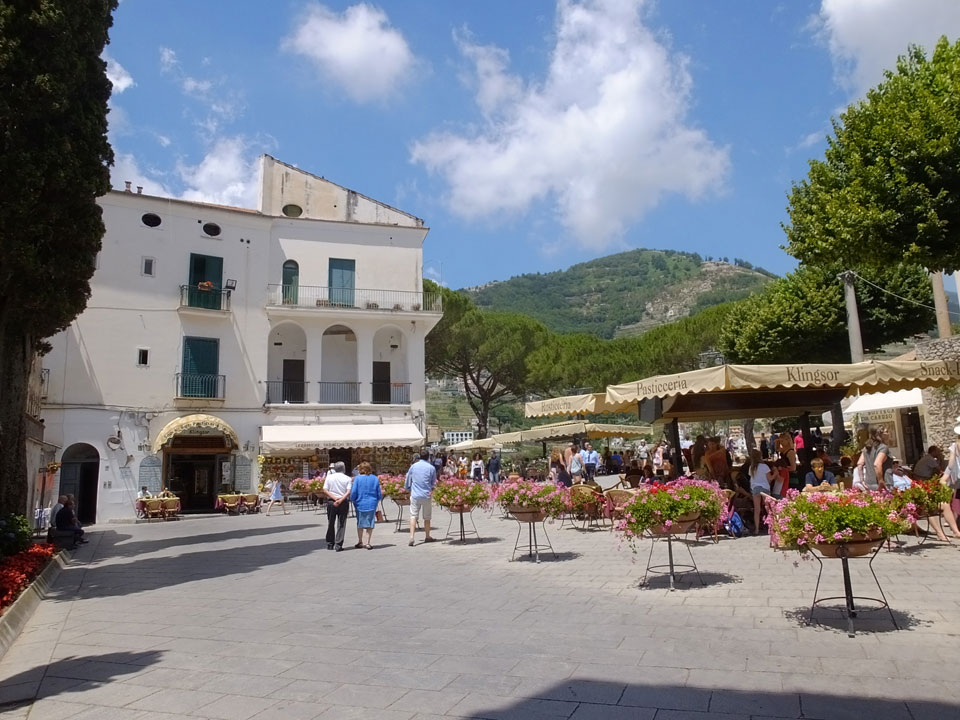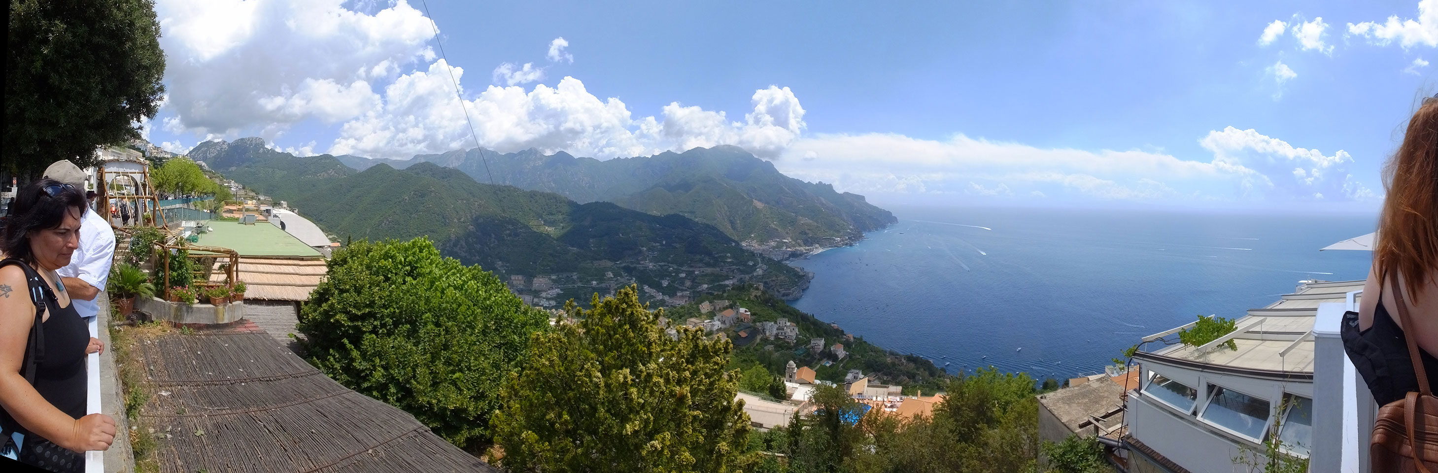 Etwas Marschmusik klang vom Ort aus, war dann aber schon wieder vorbei. Wir gingen in Ravello umher und sahen die Villa Rufolo. Dort wollte man aber €7 Eintritt, was wir uns sparten. Stattdessen ging’s durch den Ort, der klein und fein war. Überall kleine Läden in den alten Gassen. Super Aussicht von Restaurants mit hohen Preisen. Schon toll hier.