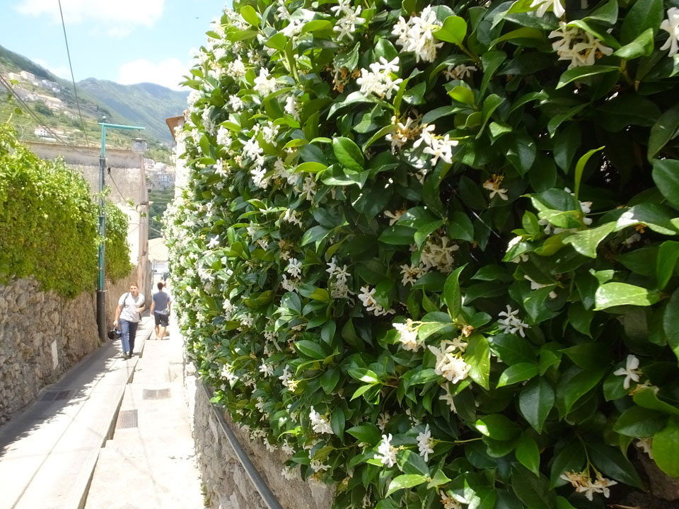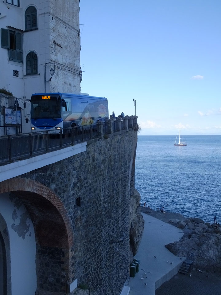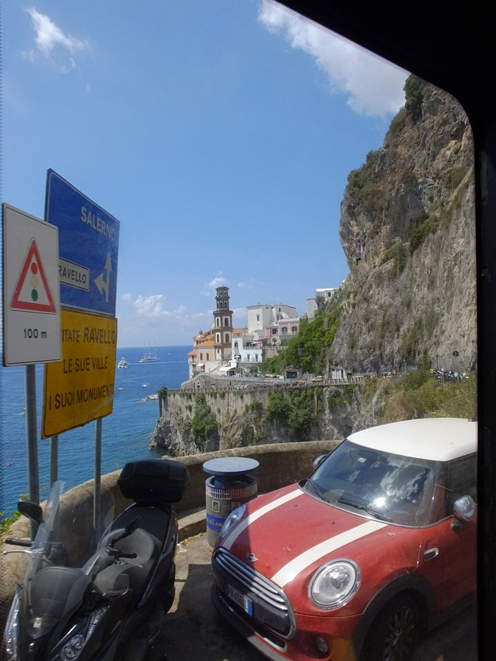 Wir hatten ein etwas mäßiges Frühstück im Hotel, gingen dann zum Bus für die Fahrt um 10 nach Amalfi. Unten dann suchte ich nach dem Bus nach Ravello. Die Haltestelle war etwas woanders. Ich hatte nur zwei Tickets für €2,20, während die Fahrt nach Ravello nur €1,80 kostete. Der Fahrer winkte uns durch.