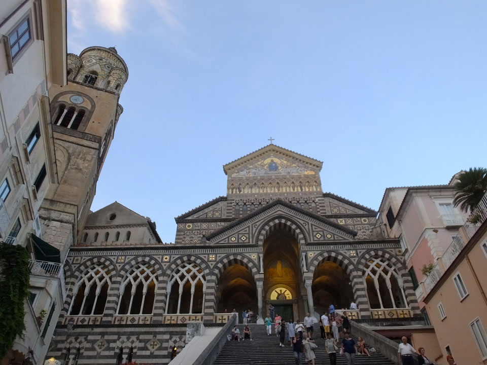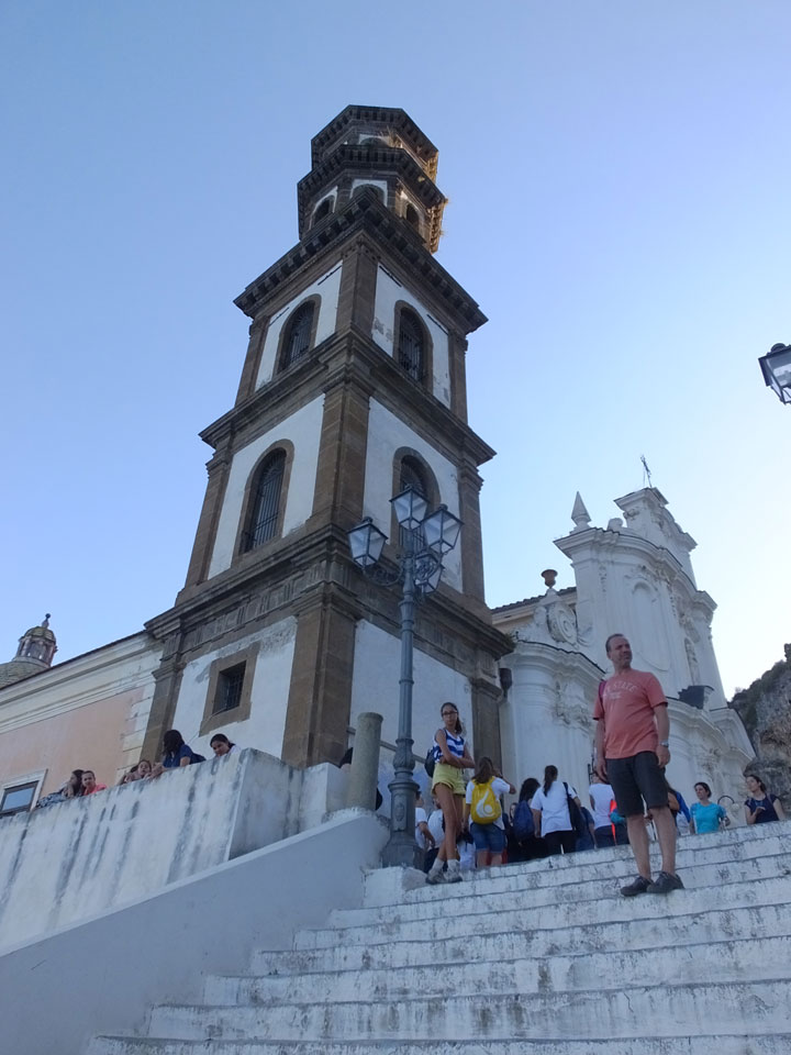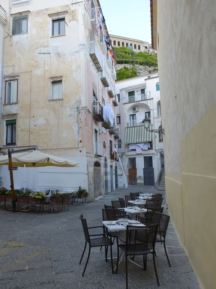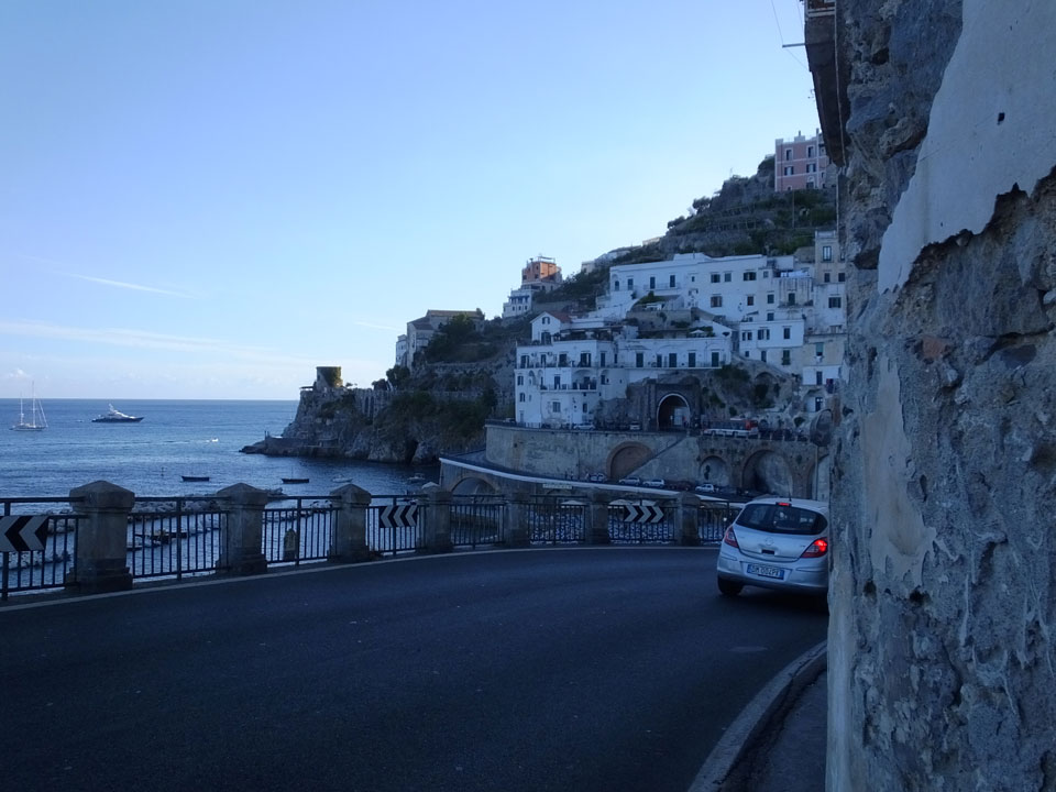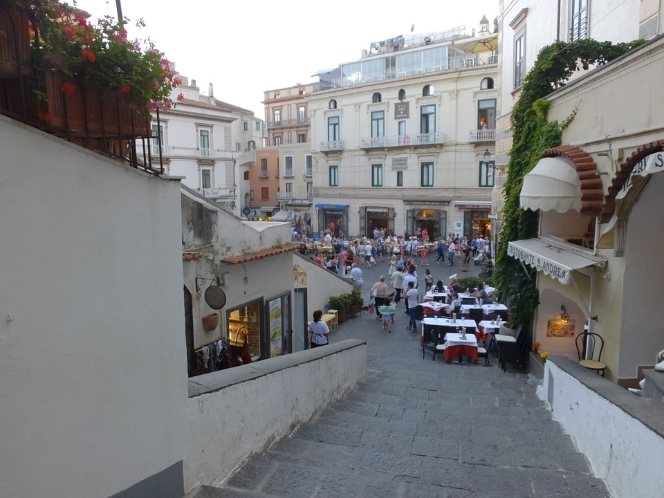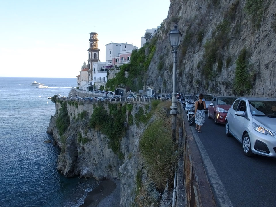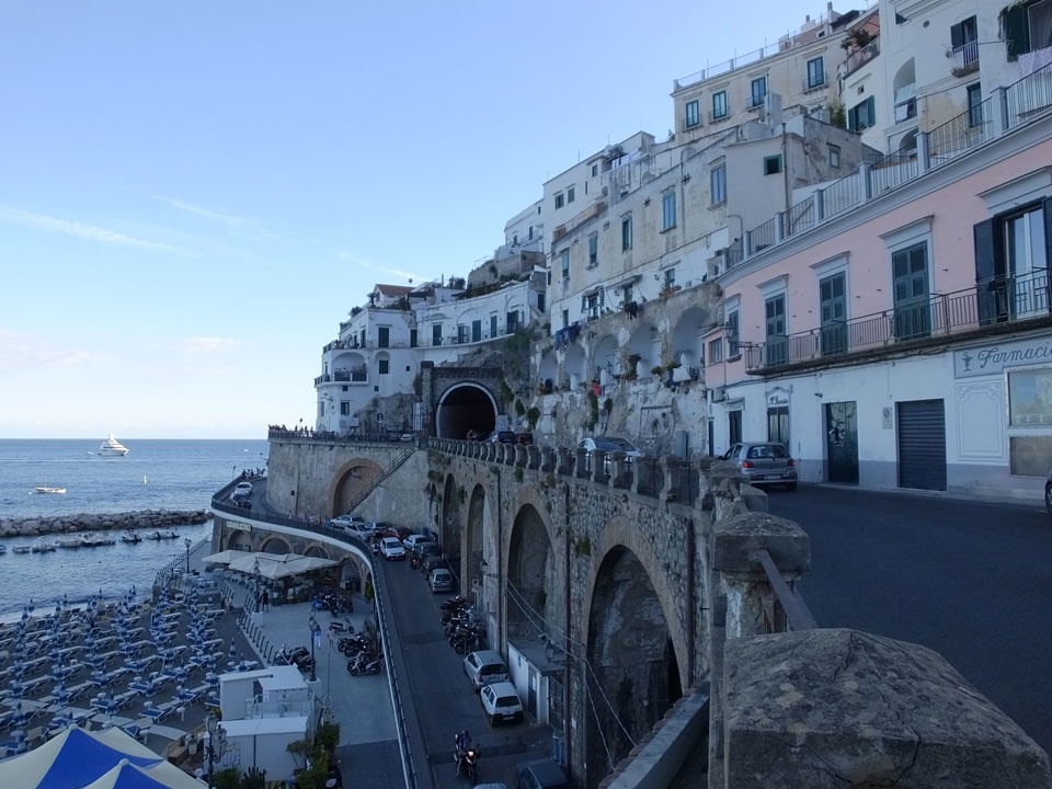Es ging wieder hoch auf die Straße, an einer Kirche vorbei und dann durch einen langen Tunnel nach Amalfi. Dort schauten wir uns ebenfalls um. Die Stadt mit vielen Gängen war auch etwas Besonderes. Ich hatte inzwischen viel Hunger, sodass wir unser Abendessen gleich dort einnahmen. Ich hatte das Gericht, was ich Mittags verpasste und war zufrieden. Man kommt doch meistens um die €20-€25 für 2 Personen aus dem Restaurant. Ich brauchte nur Bargeld, hier ging mal wieder ein Automat nicht. Für zwei Bustickets reichte es noch.