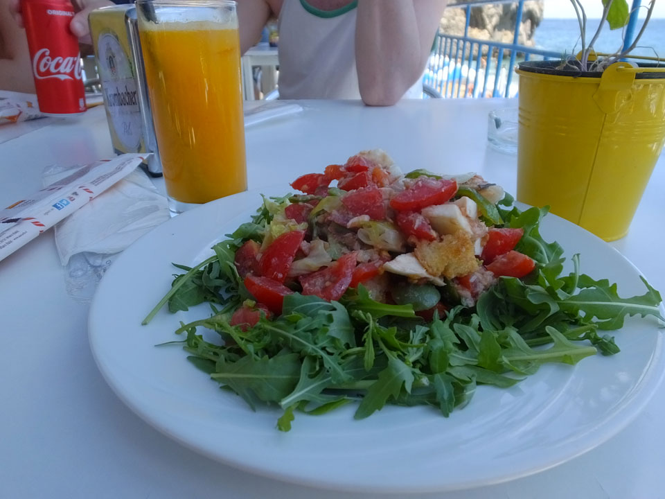 Unten am Strand hüpften wir raus. In einem Strand-Restaurant bestellte ich was zum Mittag. Am Tisch saß uns ein Paar gegenüber, die Parmegiano oder so hatten. Das sah gut aus und wollte ich später auch probieren.