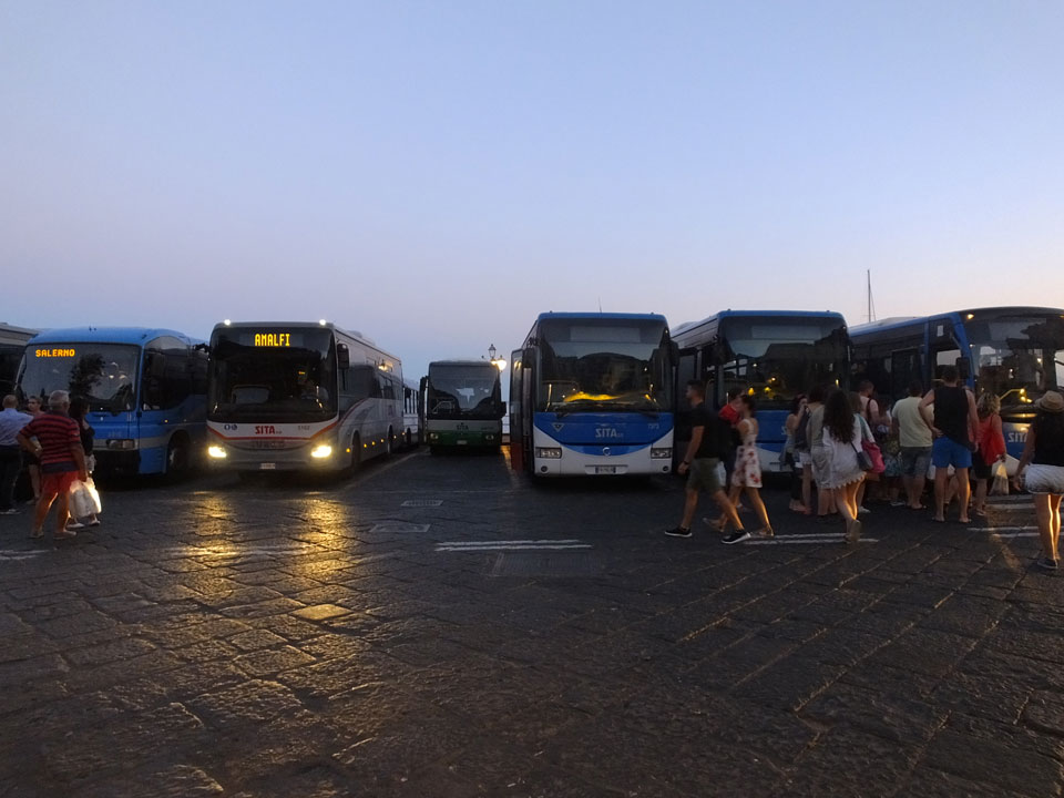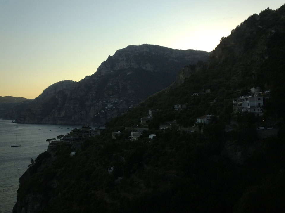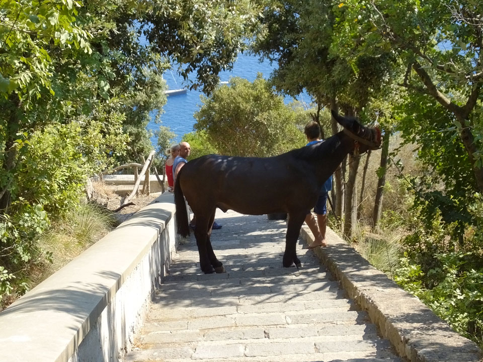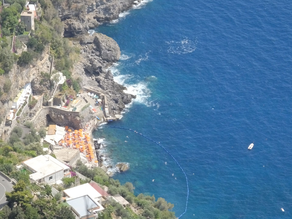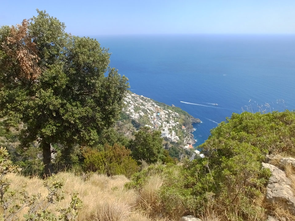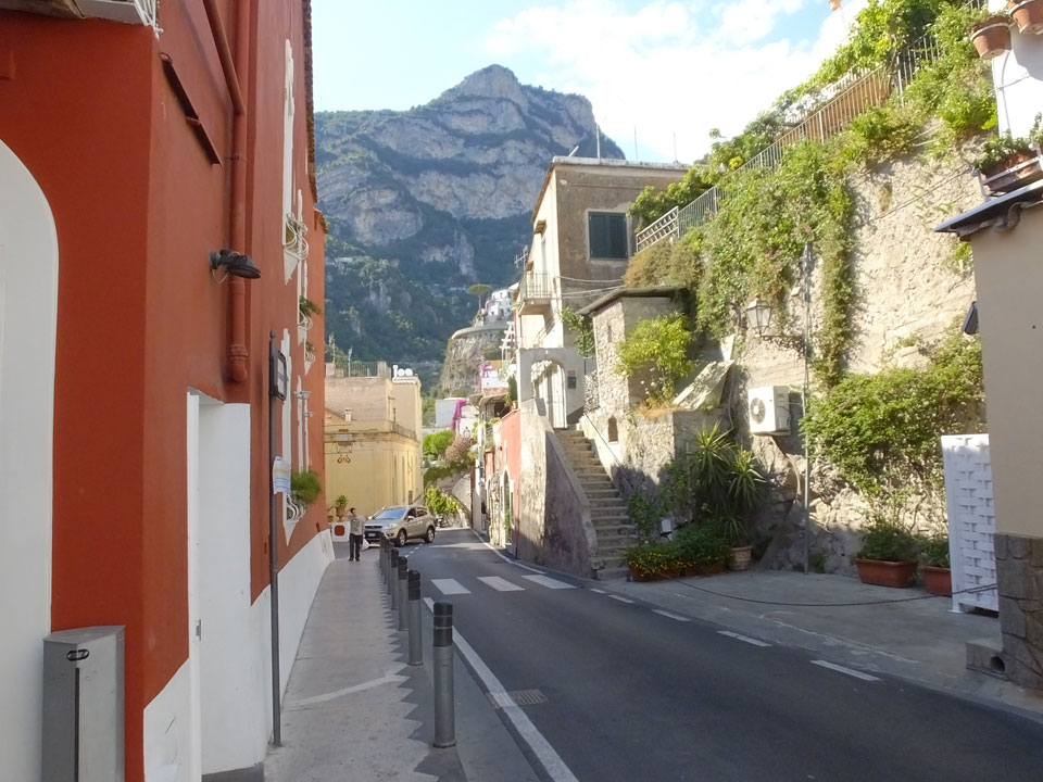 Unten angekommen, 2h nach dem Ausstieg aus dem Bus in Bomerano, dachte ich, dass ich mit dem Bus die eine Station bis Positano fahre. Ein Bus kam auf der gegenüberliegenden Straßenseite vorbei und machte für die dort wartenden Leute nicht mal Halt. Der Bus war einfach zu voll. Ich ging also auch gleich los, wartete nicht die 10-15′ auf den nächsten. Das wäre doch witzig gewesen, wenn ich die Bekannte im Bus getroffen hätte aber dazu war ich nun doch zu spät dran.