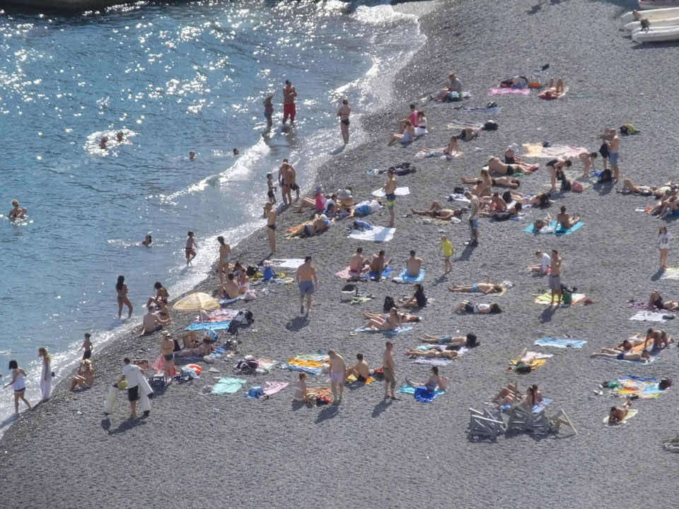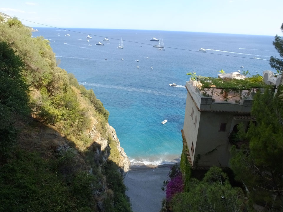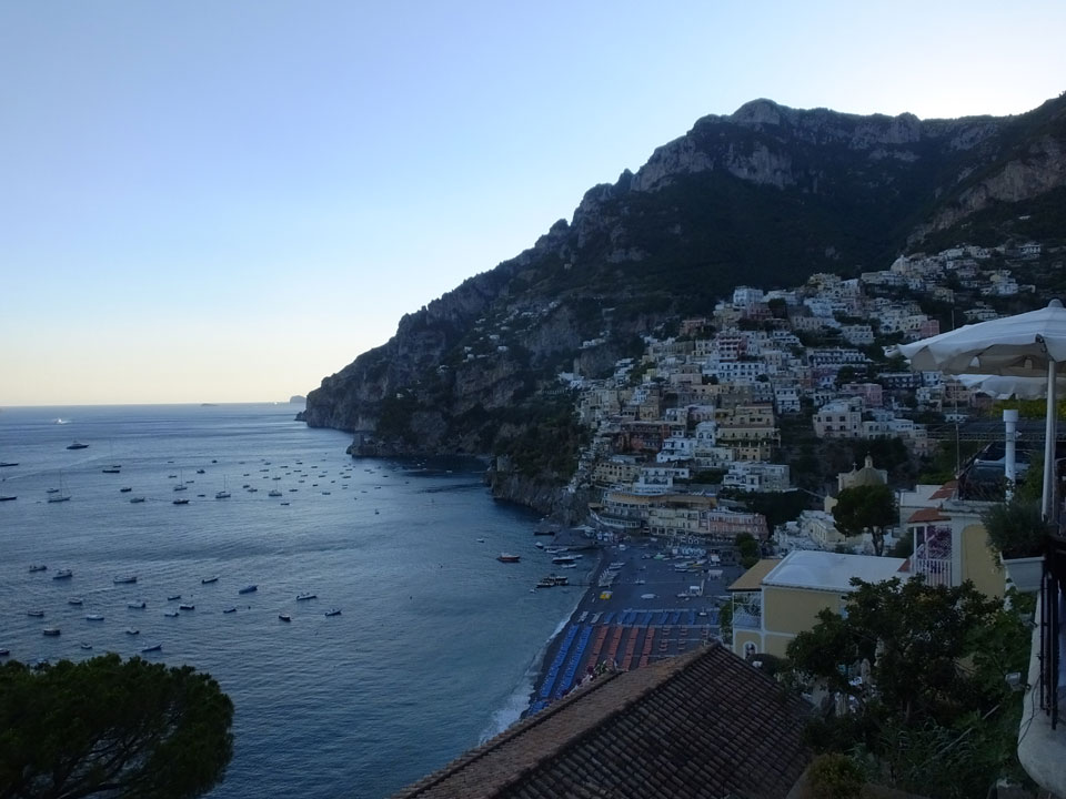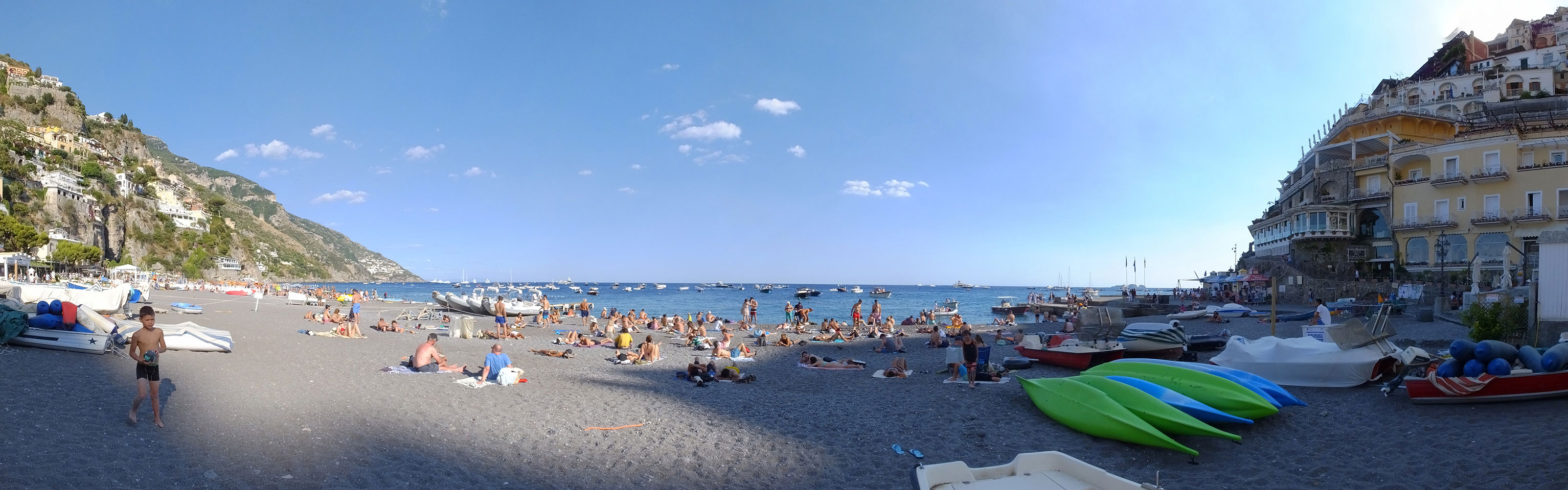 Umziehen – raus aus dem verschwitzten T-Shirt und rein in die Badehose für den Strand. Positano liegt interessant und sieht mit den Hängen voller kleiner Häuser hübsch aus. Es ist schon klar, warum das hier alles so teuer ist, weil einfach kein Platz frei scheint, alles in den Berg gebaut wurde. Das Wasser war super, Photos wurden wieder kritisch beurteilt, alles easy. Dann nach einer reichlichen Stunde wurde es langsam Zeit an die Rückkehr. Wir mussten ja wieder auf unseren Berg und nach Amalfi für den letzten Bus um 21:00.