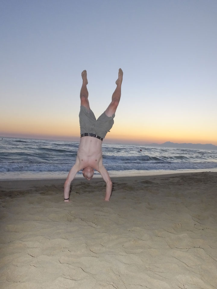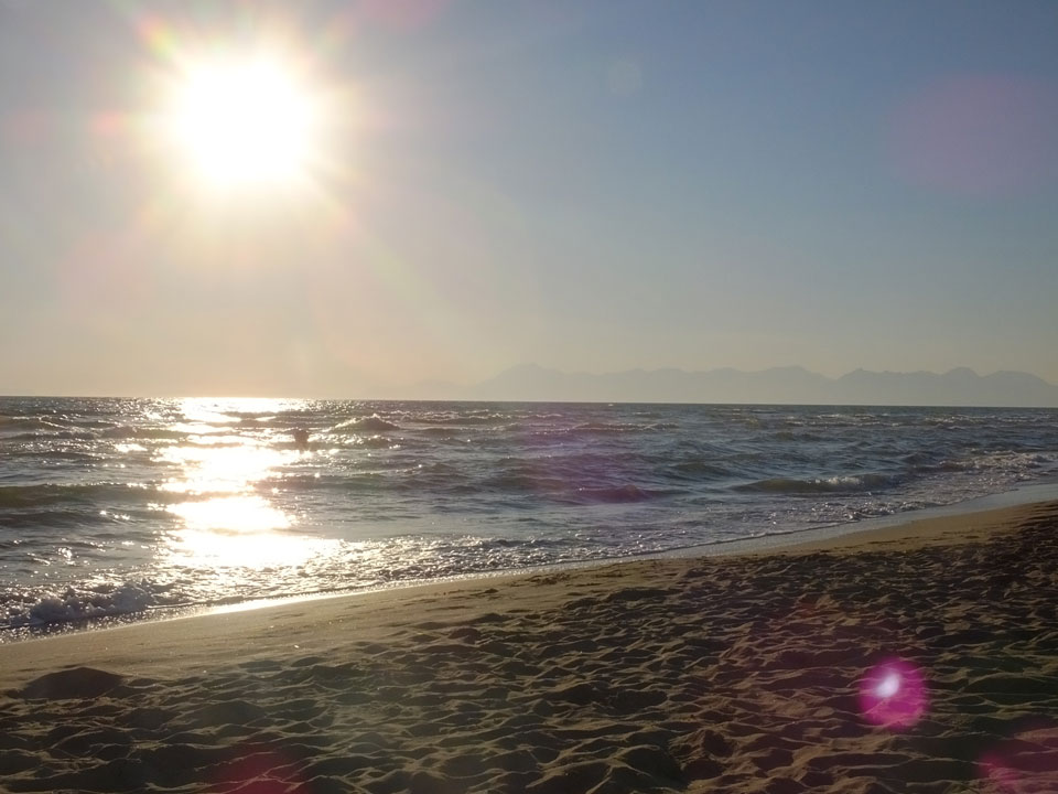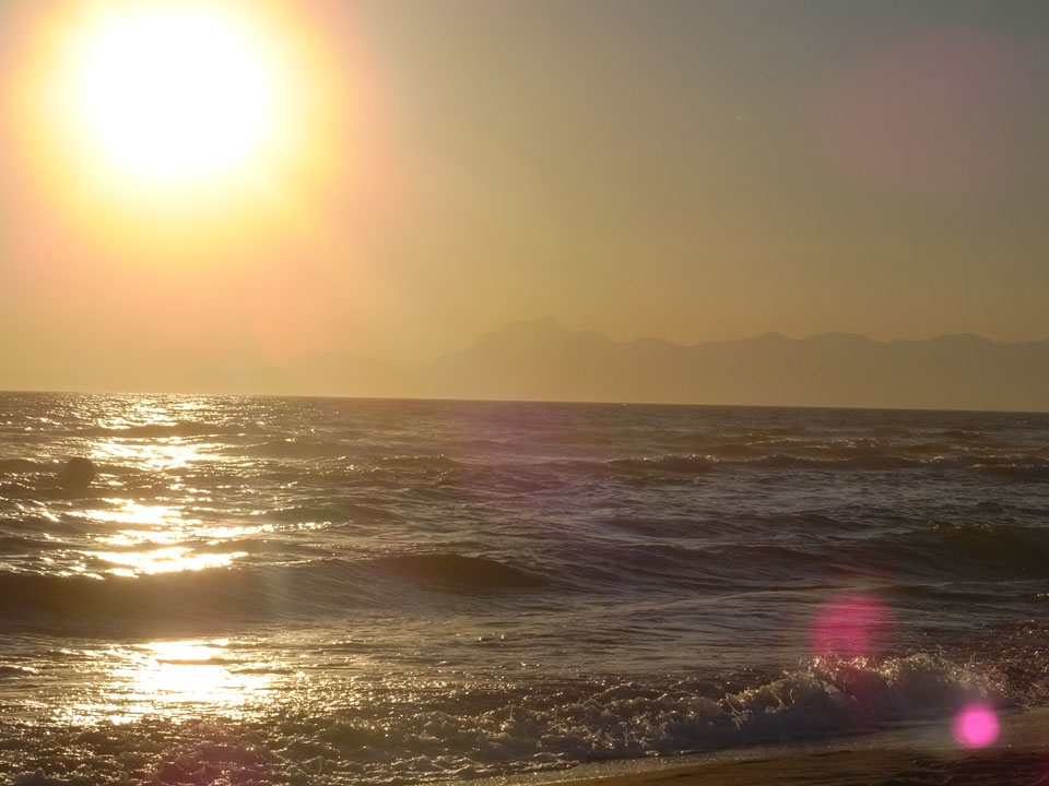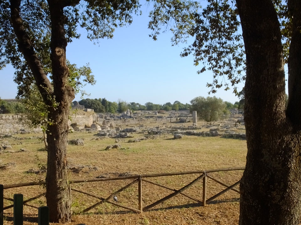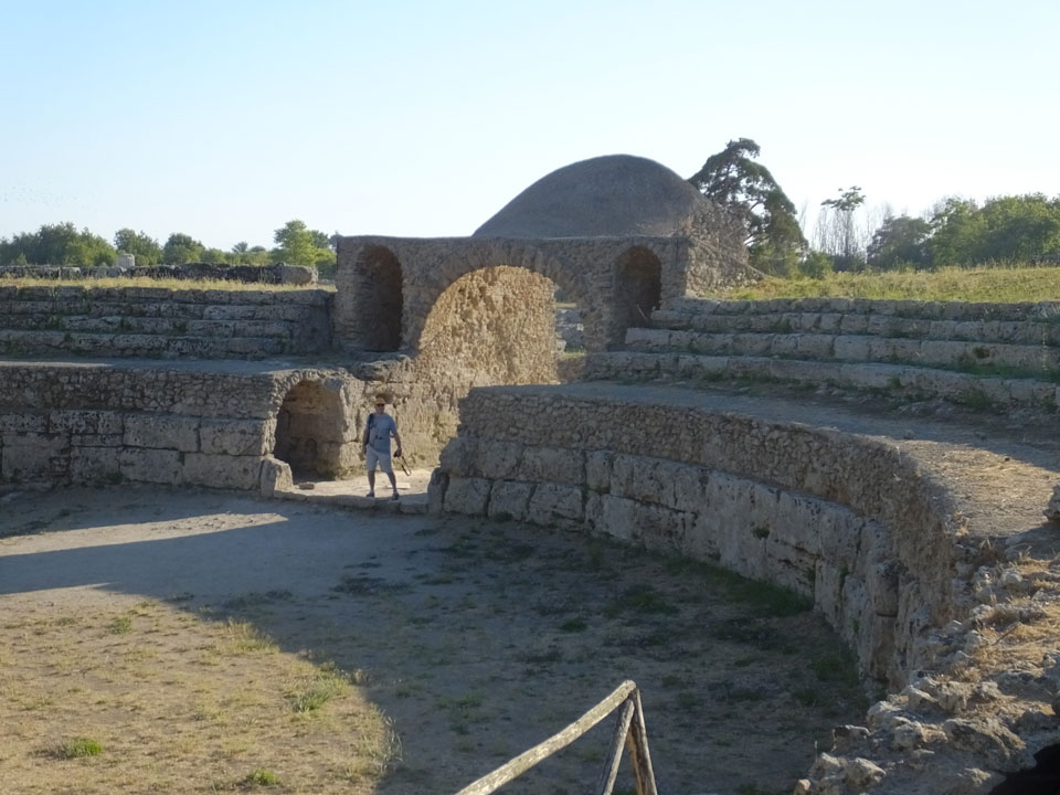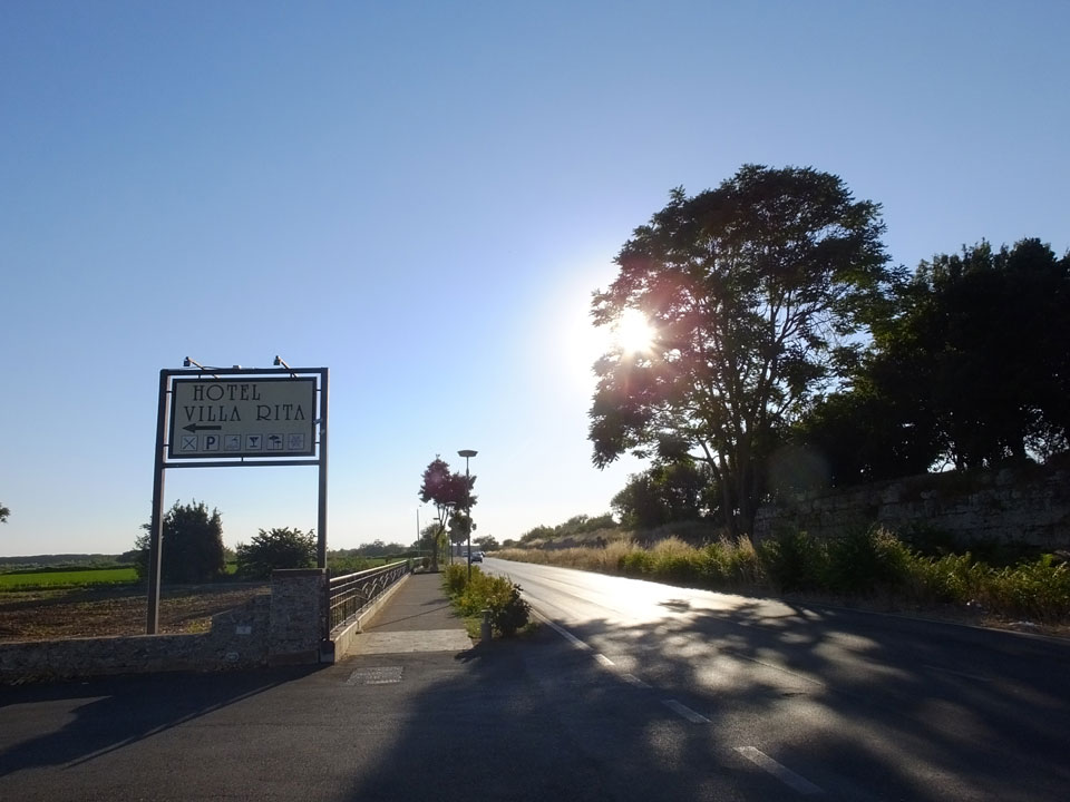 Mitten zwischen Feldern liegt der kleine Ort. Mit dem Taxi (€5+1) zum Hotel. Eine freundliche Begrüßung. Dort hatten wir die Wahl zwischen zwei Zimmern und nahmen das Größere. Für €63 ist das aber auch hier etwas teurer, doch wir sind direkt am archäologischen Komplex. Heute Abend jedoch machten wir erst mal einen ruhigen. Ich gratulierte in Deutschland meinem Bruder zum Geburtstag. Dann packten wir Sachen für den Strand. Der sollte 20′ entfernt liegen, doch das war die Schätzung eher per Fahrrad statt zu Fuß.