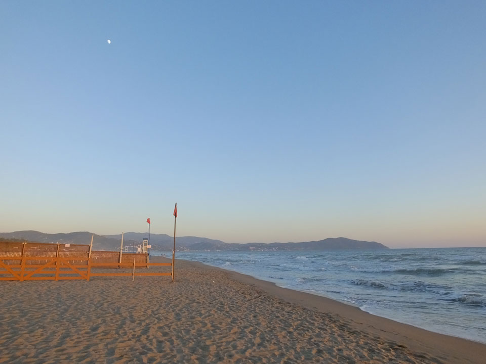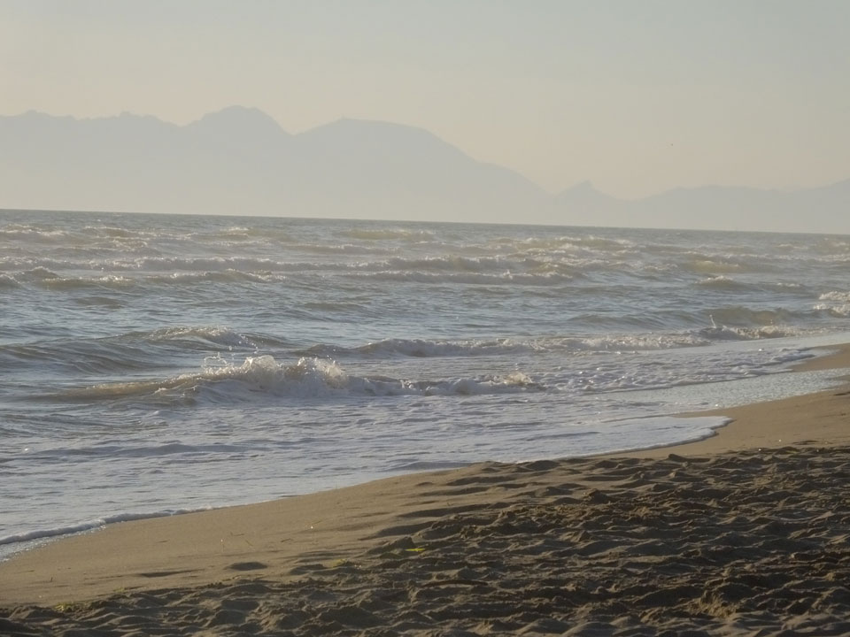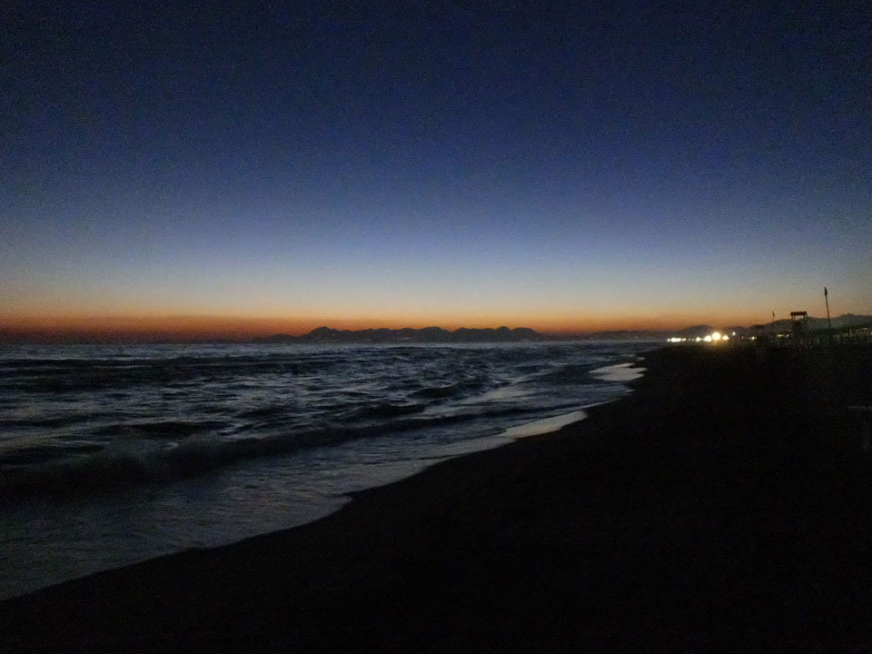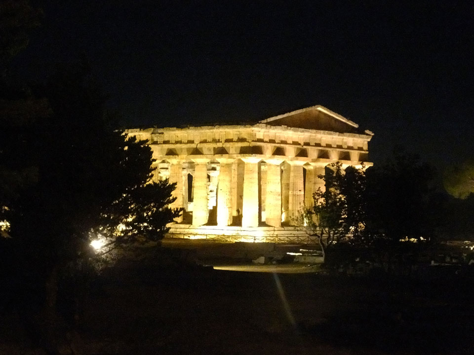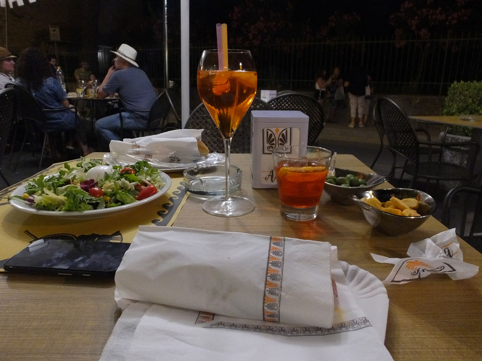 Ein ganzen Stückchen liefen wir, vorbei an uralten Ruinen Paestums kamen dann in die touristische Strandgegend. Die meisten Leute kamen uns entgegen. Zum Sonnenuntergang dann aber war alles fantastisch super. Man sah die Amalfi-Küste in der Ferne. Der Sonnenuntergang mit der Steilküste sah super aus. Mit Limoncello stießen wir auf eine fantastische Reise an. Das Meiste lief perfekt. Beschwipst ging es schneller zurück, Abendessen mit Blick auf einen Tempel und dann in’s Hotel.