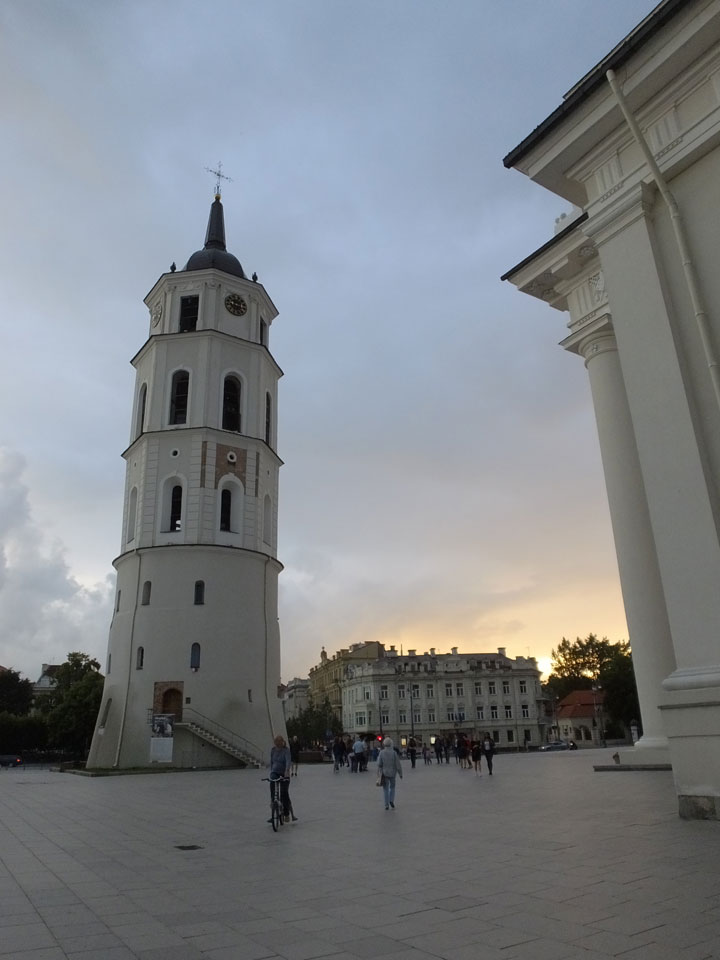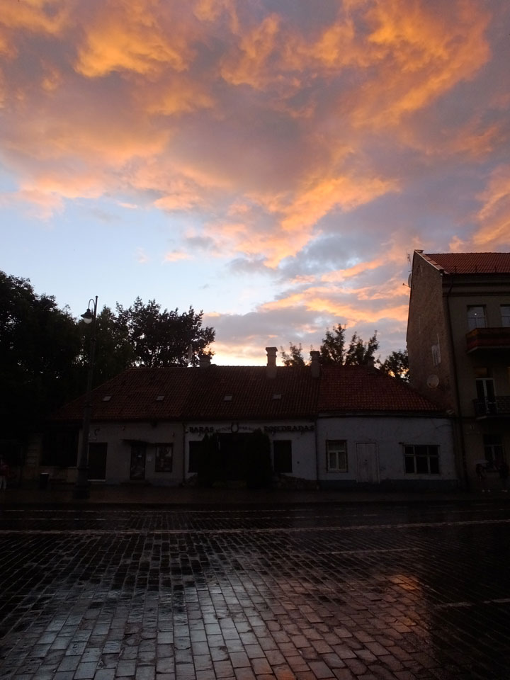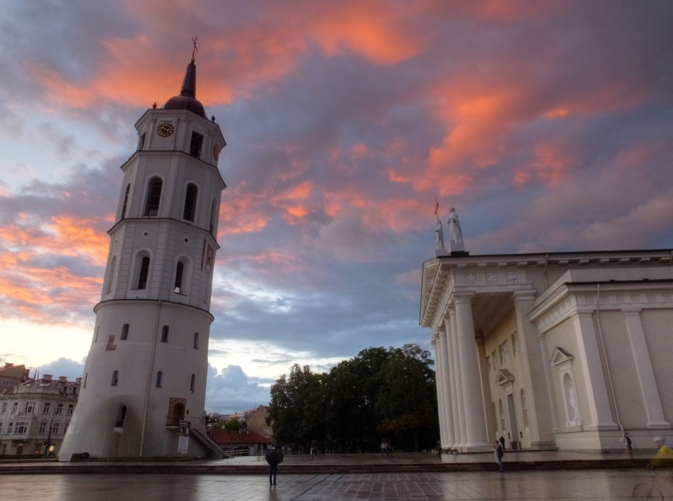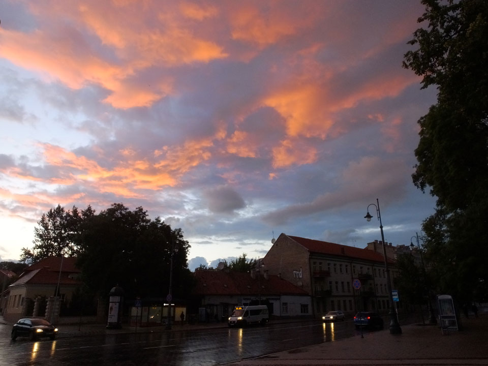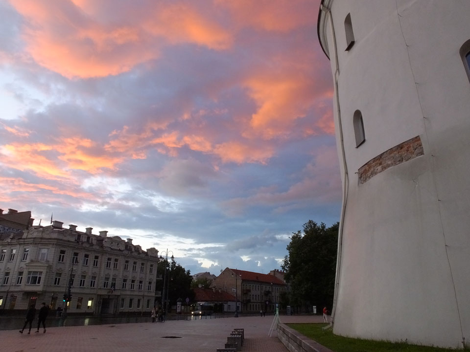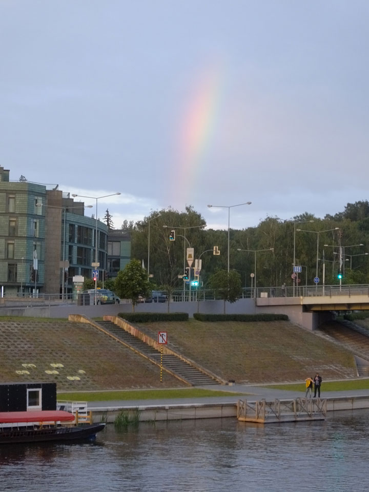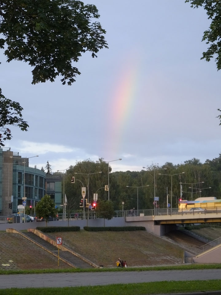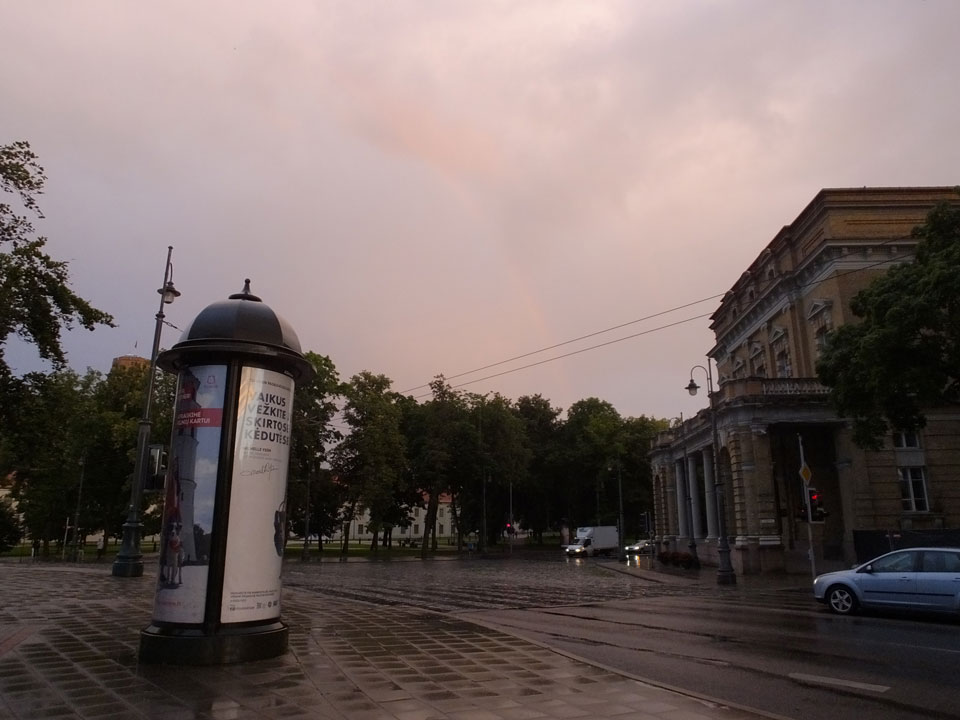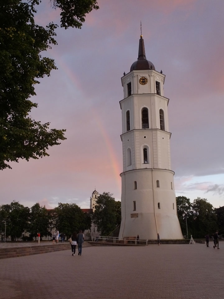 Die Wolken, der Sonnenuntergang und Regen brachten Regenbogen hervor. Ich knipste einige Bilder, die ich so noch nicht von Vilnius vor die Linse bekam. Die Panoramen an der Kathedrale waren dann auch was Besonderes – kitschig aber eben farblich neu.