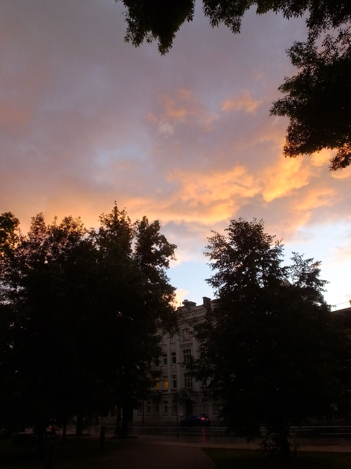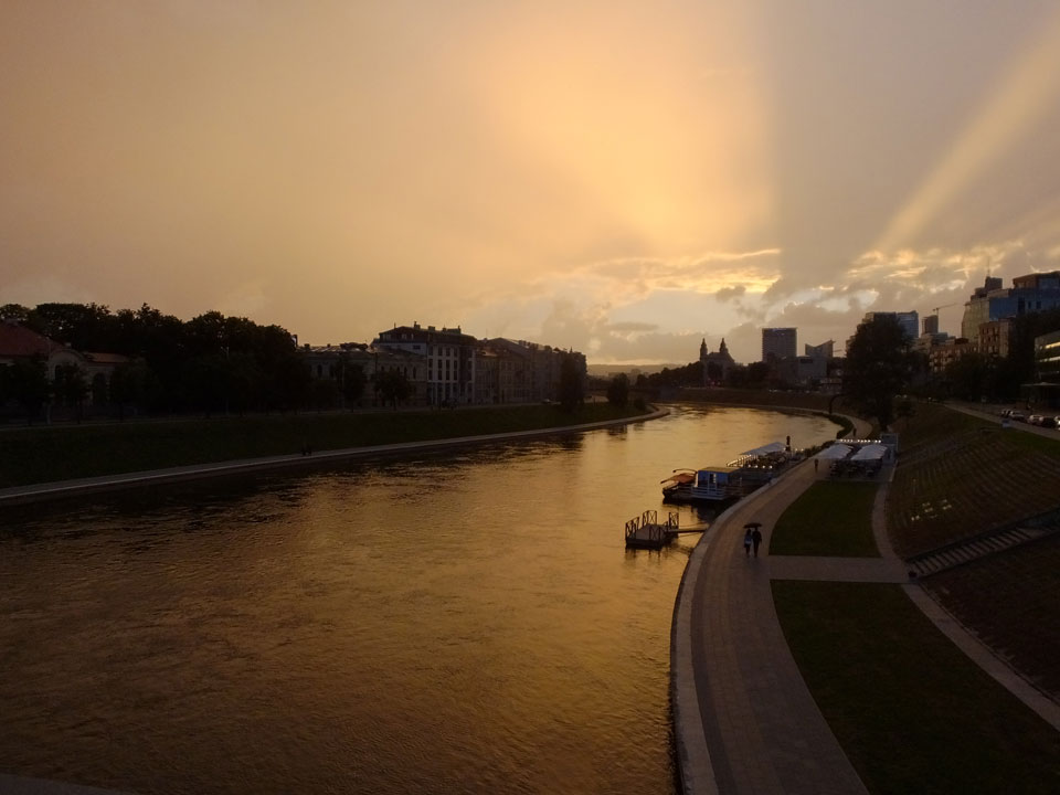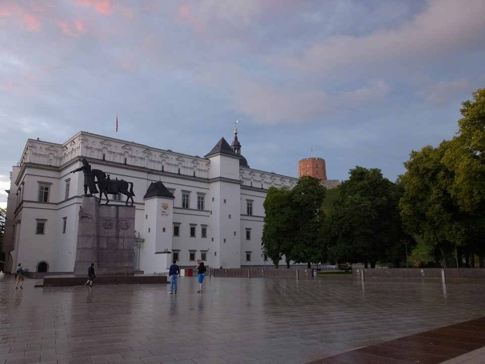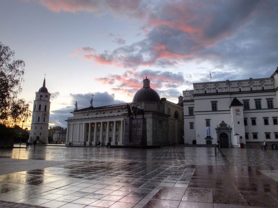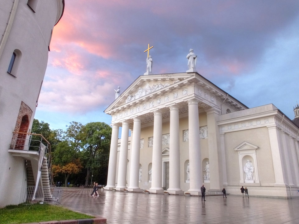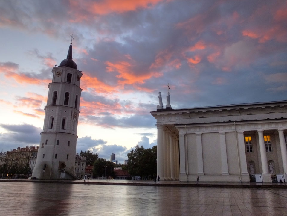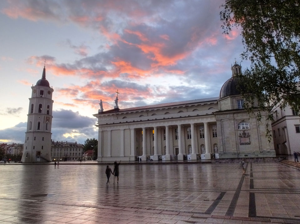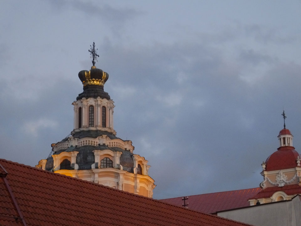 Die Wolken, der Sonnenuntergang und Regen brachten Regenbogen hervor. Ich knipste einige Bilder, die ich so noch nicht von Vilnius vor die Linse bekam. Die Panoramen an der Kathedrale waren dann auch was Besonderes – kitschig aber eben farblich neu.