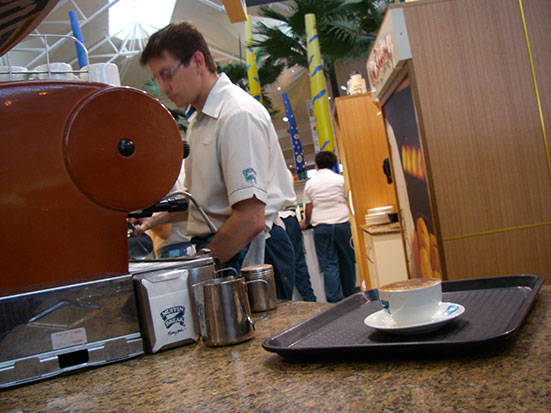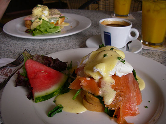Seit über 3 Monaten sah ich täglich die Werbung für das Restaurant und Frühstück im Fahrstuhl. Zeit, es mal selbst zu testen. Wunderschönes Wetter, nette Bedienung und dann blanchierte Eier mit Lachs und Long Black Coffee. Sehr toll. Das hatte auch seinen Preis. Ich legte AU-$50 hin — für zwei Nasen.