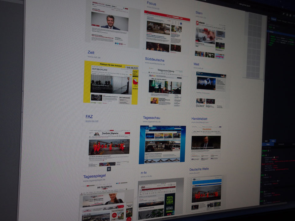 Ich finde die visuelle Übersicht über die Newsites ganz gut. Fraglich ist, ob so eine Webshot-Funktion auch erlaubt ist. Man könnte die Sache mit den RSS-Feeds zweistufig bauen. Bei Click auf den Screenshot sieht man die Top10 News vom RSS – eventuell sogar als Popover. Muss ich testen.
