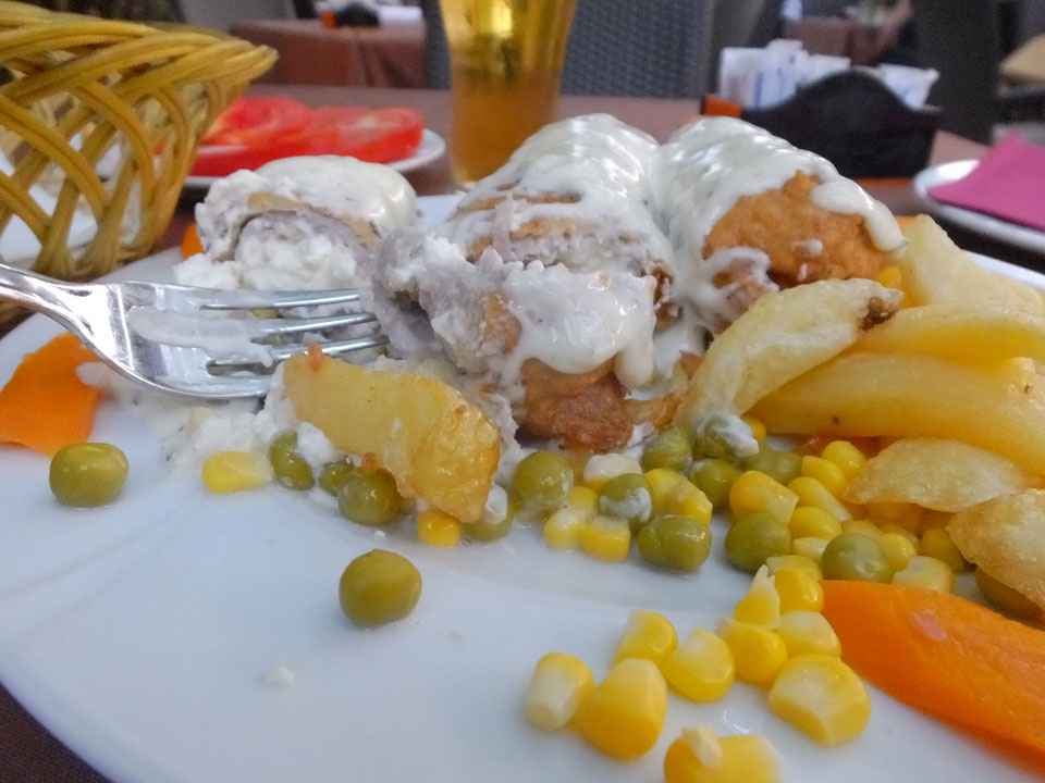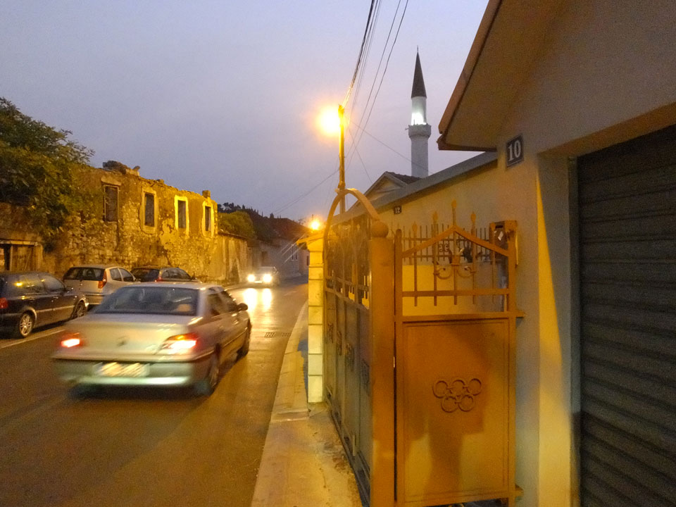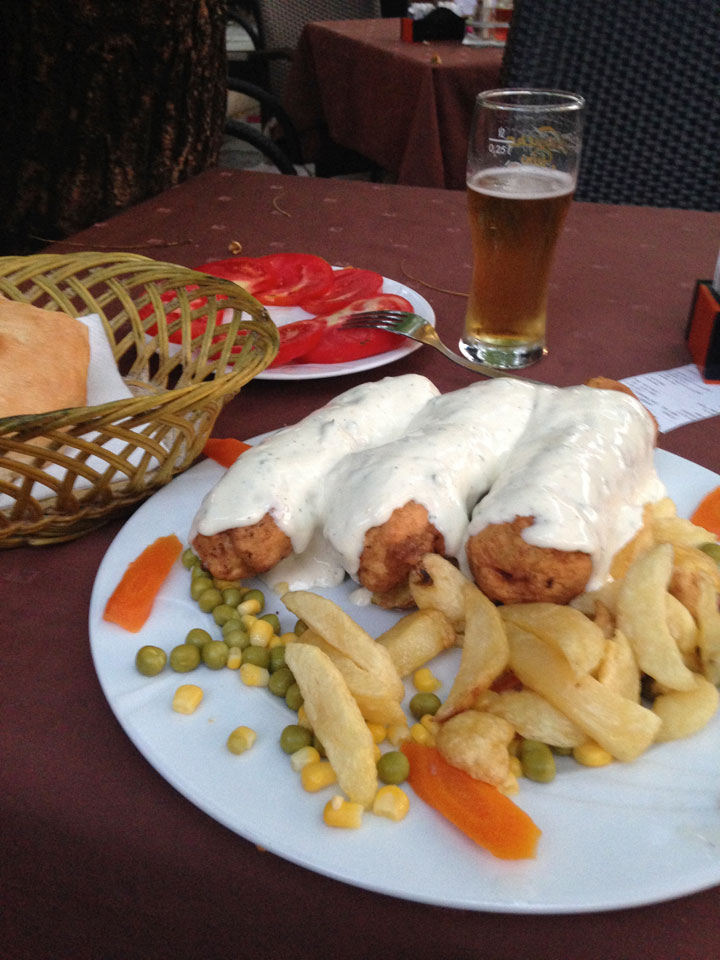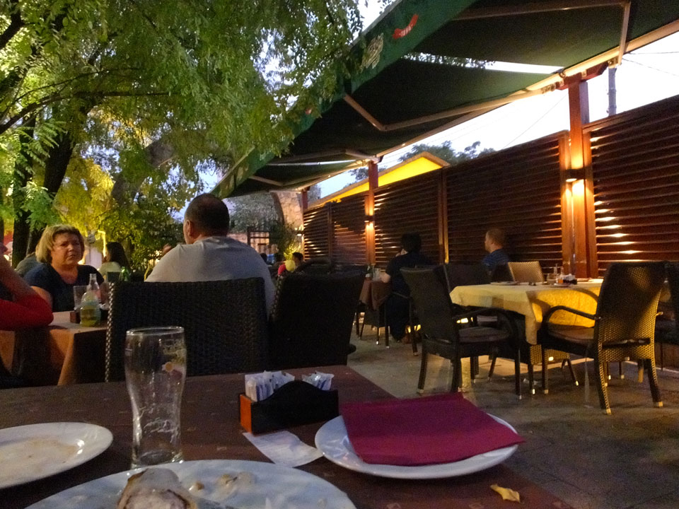 Es wurde Abends und ich wollte noch etwas von der Stadt sehen. Ich ging erst mal Richtung Süden zum Clocktower, der gerade restauriert wurde. Gleich in der Nähe ist das Restaurant „Pod Volat“. Dort wollte ich auf Empfehlung „Podgoricki Popek“ bestellen. Auf dem englischen Menü fand ich es nicht, doch das war doch einfach unter Meatrolls eingeordnet. Mit einem 0,25 Bier und Tomatensalat kam’s auf €10,80 (€12) und ich war irre voll. Ich schaffte die drei Rollen nicht – nur 2½ passten in mich.