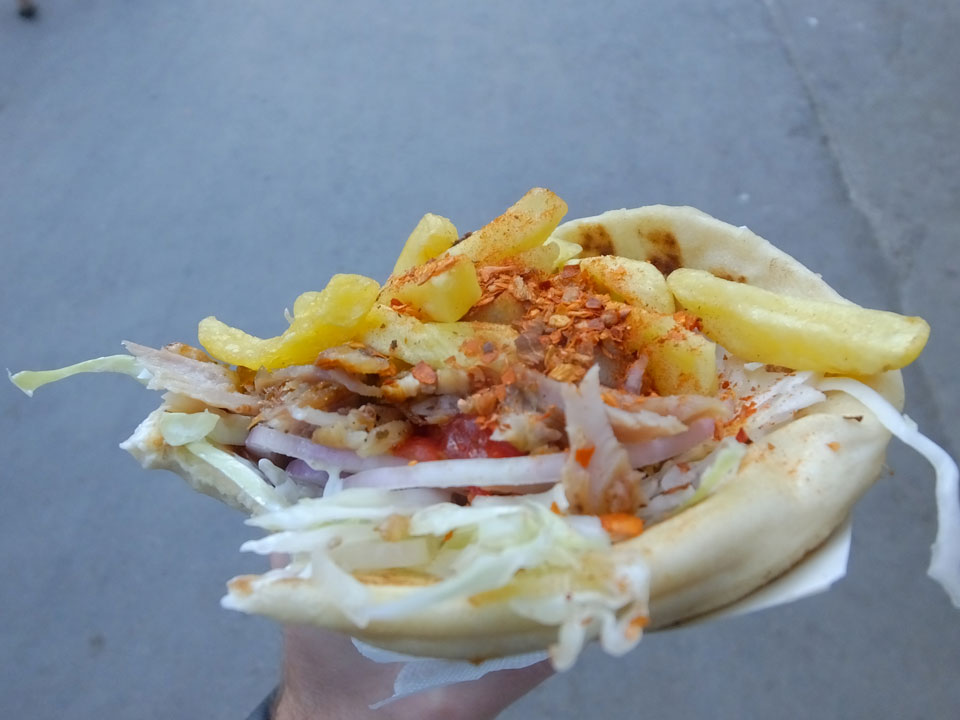 Wieder ein Bett unten, wieder mal Glück gehabt. Ein Lybier auf UN Konferenz-Mission war im Zimmer. Ich ging dann an den Strand, der allerdings voller Kippen war. Nicht besonders hübsch da. Das Wasser war angenehm, doch bis ich in die Gänge kam, stand ich im Schatten und da war’s frisch. Also nur einen Gyros (€3) und Essen einkaufen (€13). Für Spaghetti zahle ich ungern hohe Summen und so werde ich hier wohl mal kochen.