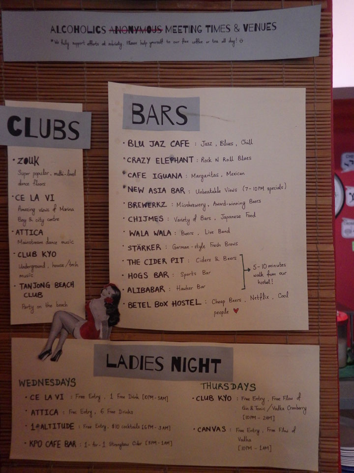Alles gesehen, noch etwas in der Gegend herumgeirrt machte ich mich auf den Weg in’s Hostel. Ohne Karte und groben Plan versuchte ich am Marina Hotel meine Richtung zu finden. Am Ende half doch nur ein Taxi. Es suckt, dass ich so klamm bin. Mit mehr Kohle macht Singapur viel mehr Spaß. Jetzt irre ich zu Fuß umher, nur weil es extra Formel 1 Aufschläge gibt. Bei mir noch nicht – tja.