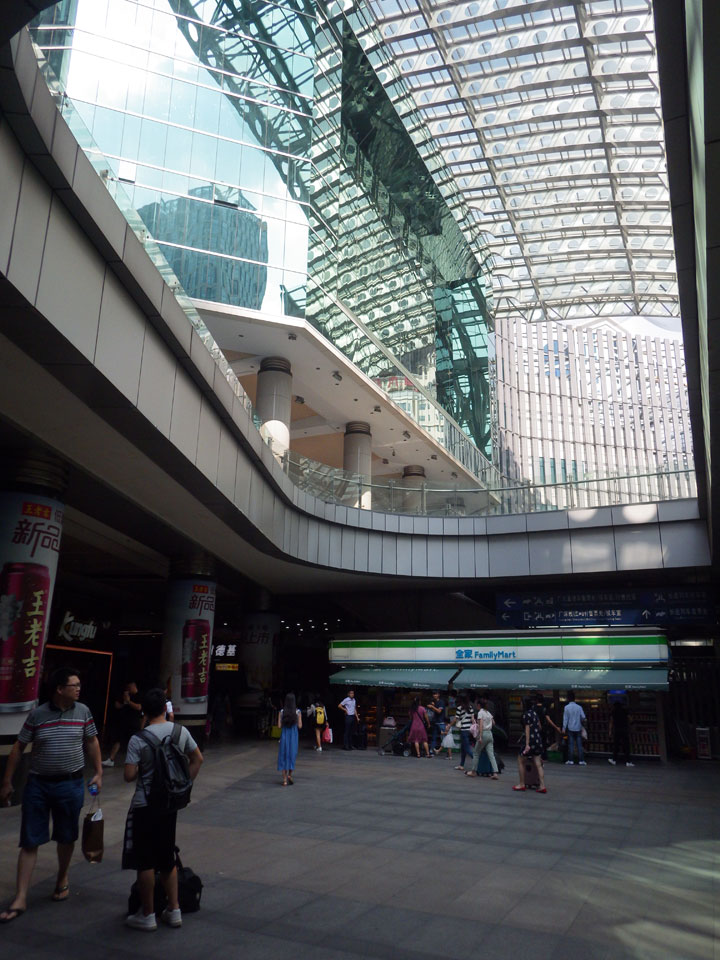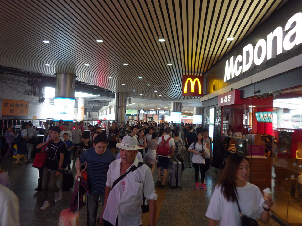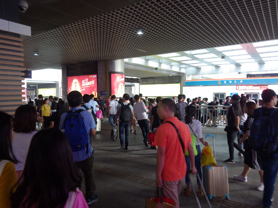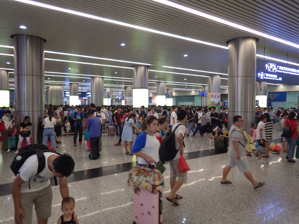 Erst 14:30 kam dann eine Putzfrau, der ich meinen eSchlüssel geben konnte. Inzwischen war ich wieder halbwegs OK und ging über die Straße zum Bahnhof. Irgendwie habe ich nicht genug von Guanzhou gesehen. Momentan hatte ich aber auch keine extra Energie. Auf dem Weg zum Bahnhof und dann auch drinnen staunte ich über die Menschenmassen. Zum heutigen Samstag müssen viele Leute wieder nach Nachhauseweg antreten. Nach Shenzen wollten dann wohl auch viele, denn an den Fahrkartenautomaten gab’s keine freien Züge. Normalerweise haben die Automaten einen englischen Modus – hier aber nicht. Ich hangelte mich aber mit etwas Hilfe gut durch – der nächste freie Zug wäre erst nach 17:00 gewesen, doch dann fragte der Automat nach meinem chinesischen Perso.