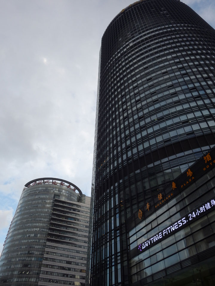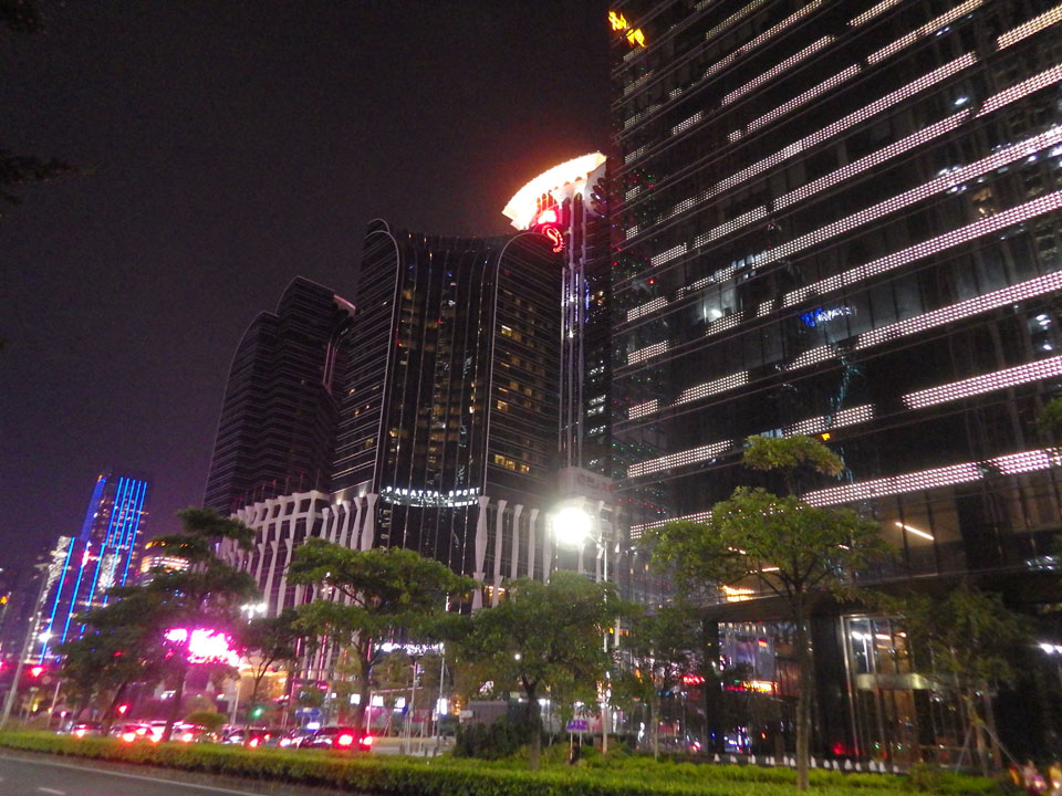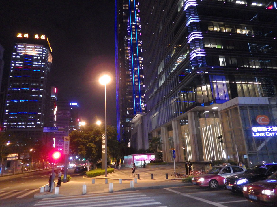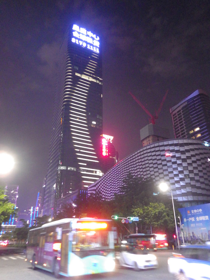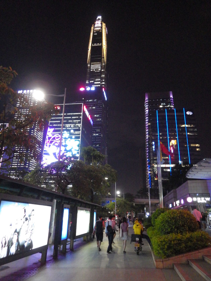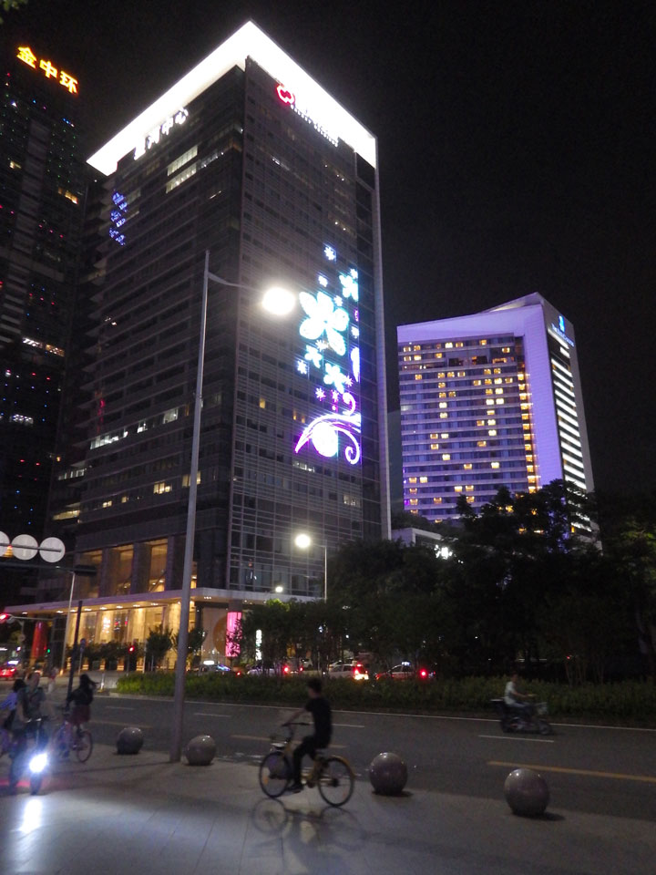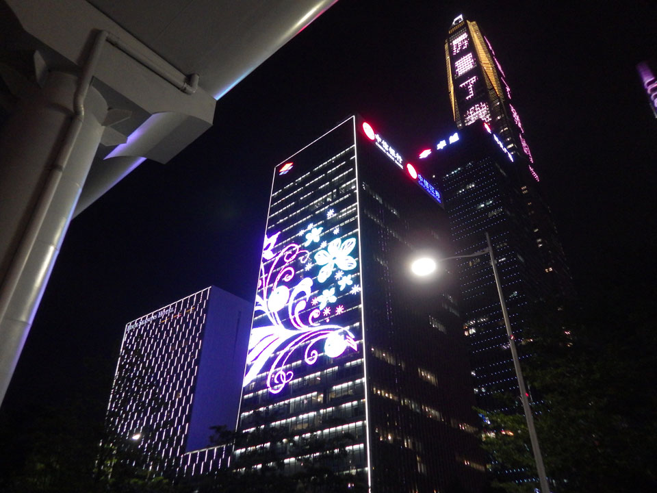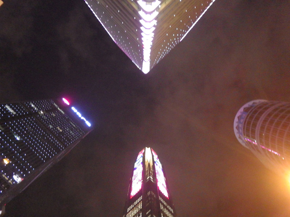 Zurück fuhr ich nur ein paar Stationen und stieg am Convention Center aus. Da war die „Link City“ – eine Untergrund Ladenstraße. Eine Menge Essens-Läden, darunter auch Yoshinoya. So hatte ich mal einen Vorgeschmack auf Japan und chattete etwas mit zu Hause. Wieder oben auf der Straße staunte ich über hohe Häuser und erneute LED Animationen an den Fassaden. China ist supermodern, da staune ich schon. Wieviel Substanz dahinter steht, kann man schwer sagen. Die meisten Wolkenkratzer zeigen gigantische Telefonnummern, unter denen man wohl Räume mieten kann.