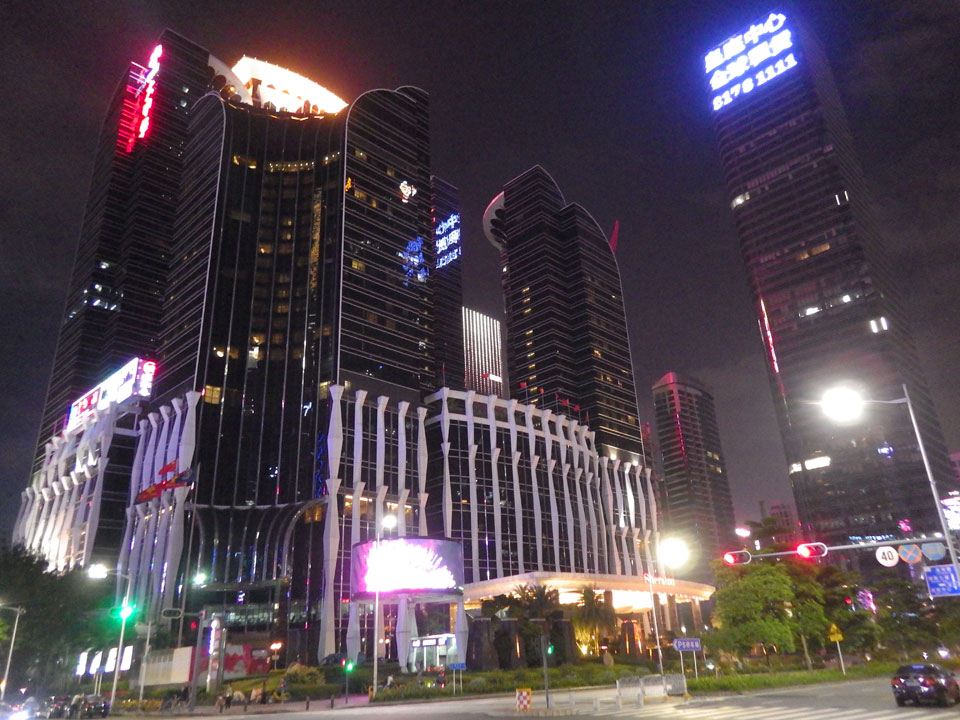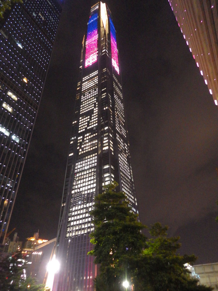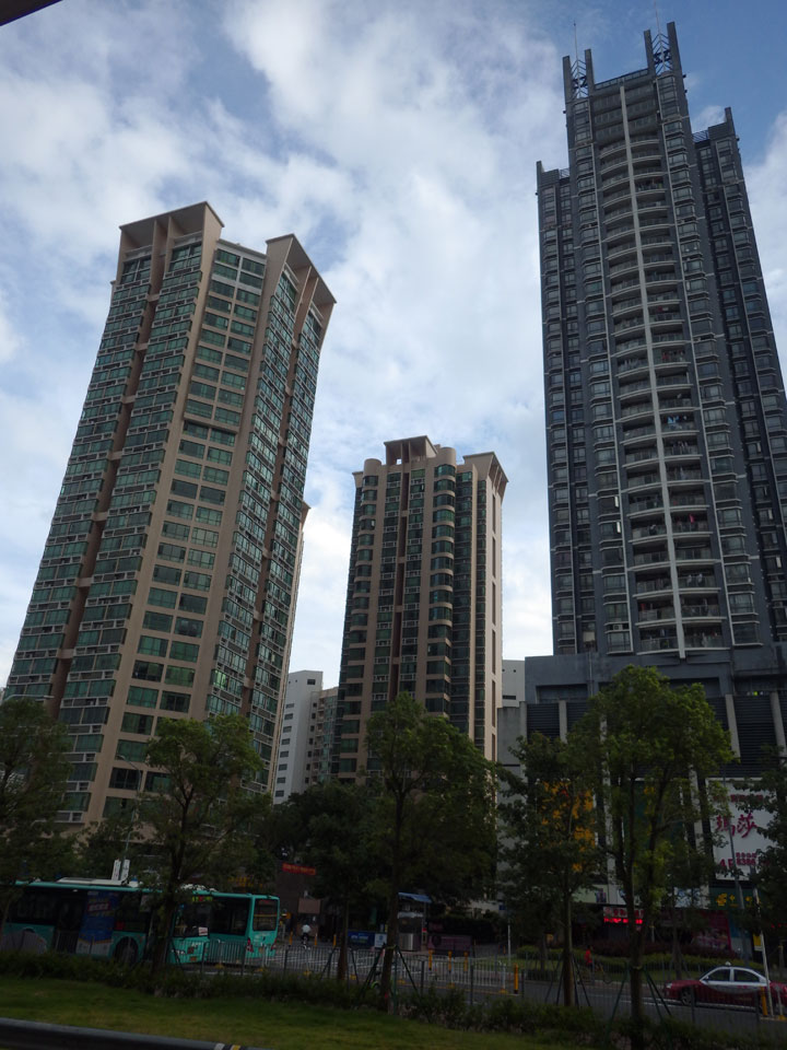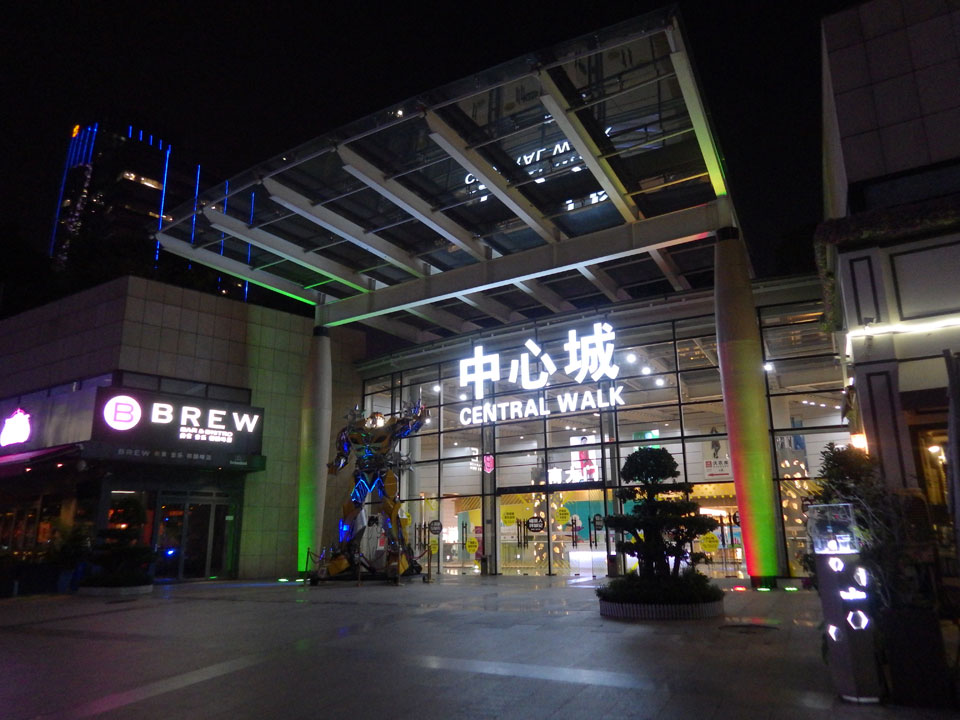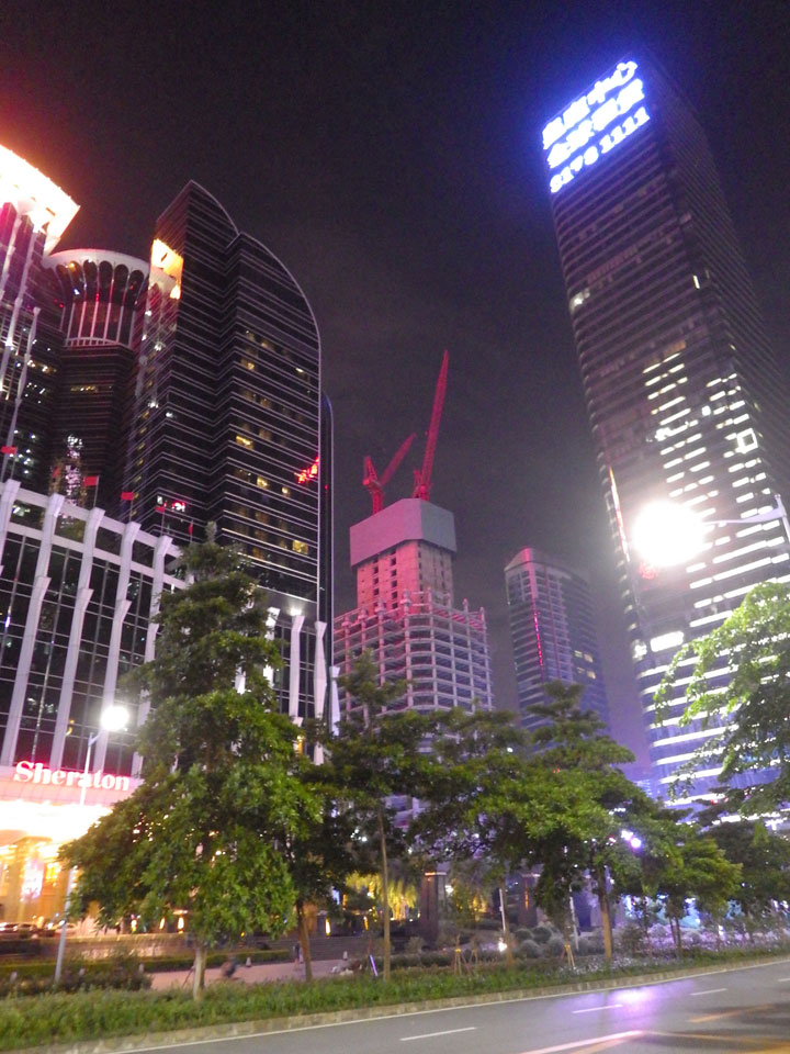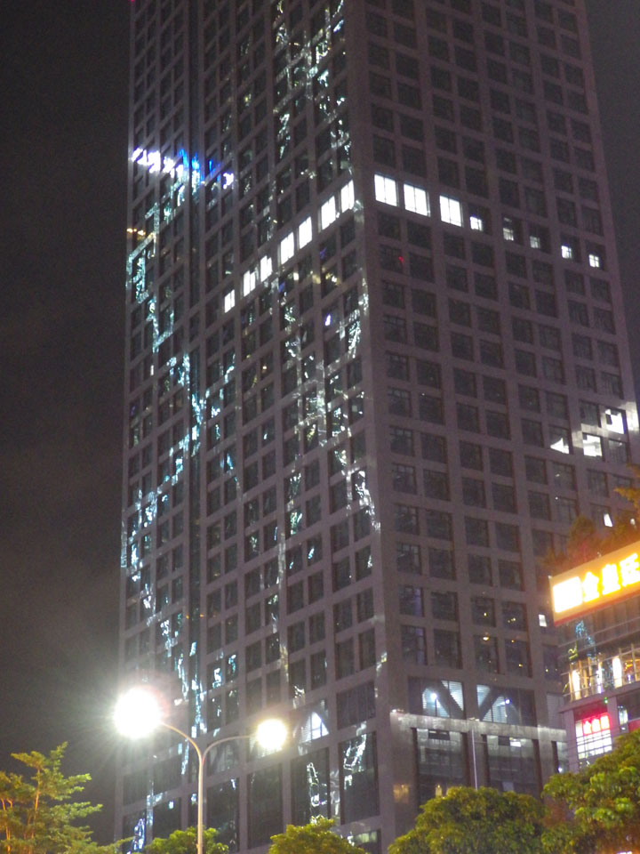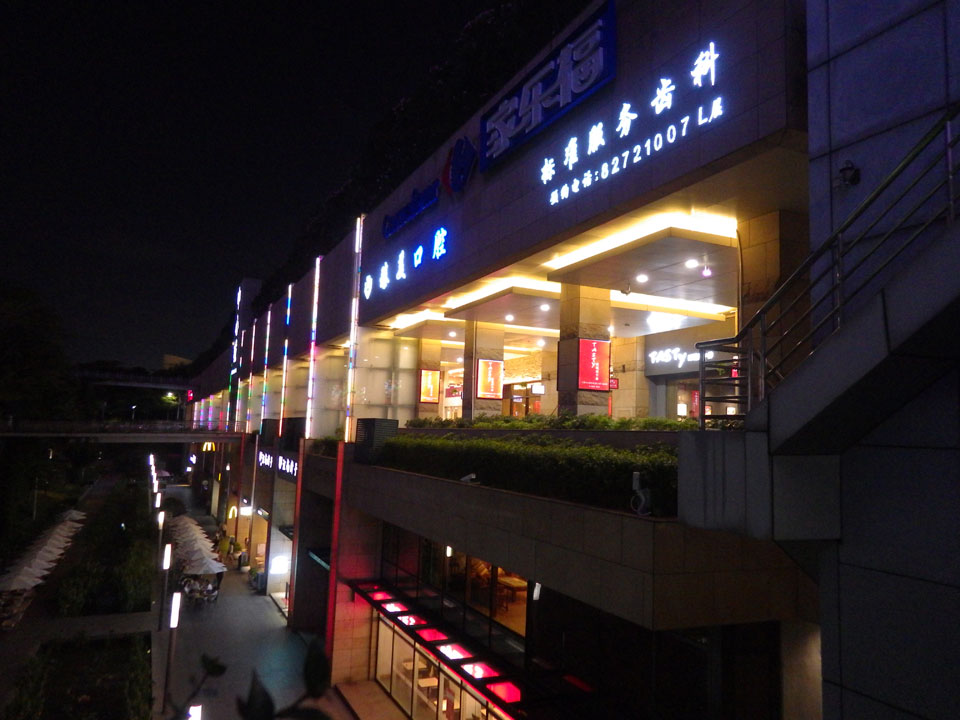 Zurück fuhr ich nur ein paar Stationen und stieg am Convention Center aus. Da war die „Link City“ – eine Untergrund Ladenstraße. Eine Menge Essens-Läden, darunter auch Yoshinoya. So hatte ich mal einen Vorgeschmack auf Japan und chattete etwas mit zu Hause. Wieder oben auf der Straße staunte ich über hohe Häuser und erneute LED Animationen an den Fassaden. China ist supermodern, da staune ich schon. Wieviel Substanz dahinter steht, kann man schwer sagen. Die meisten Wolkenkratzer zeigen gigantische Telefonnummern, unter denen man wohl Räume mieten kann.