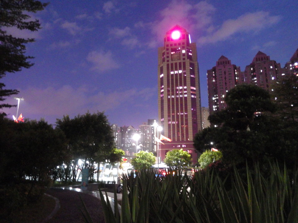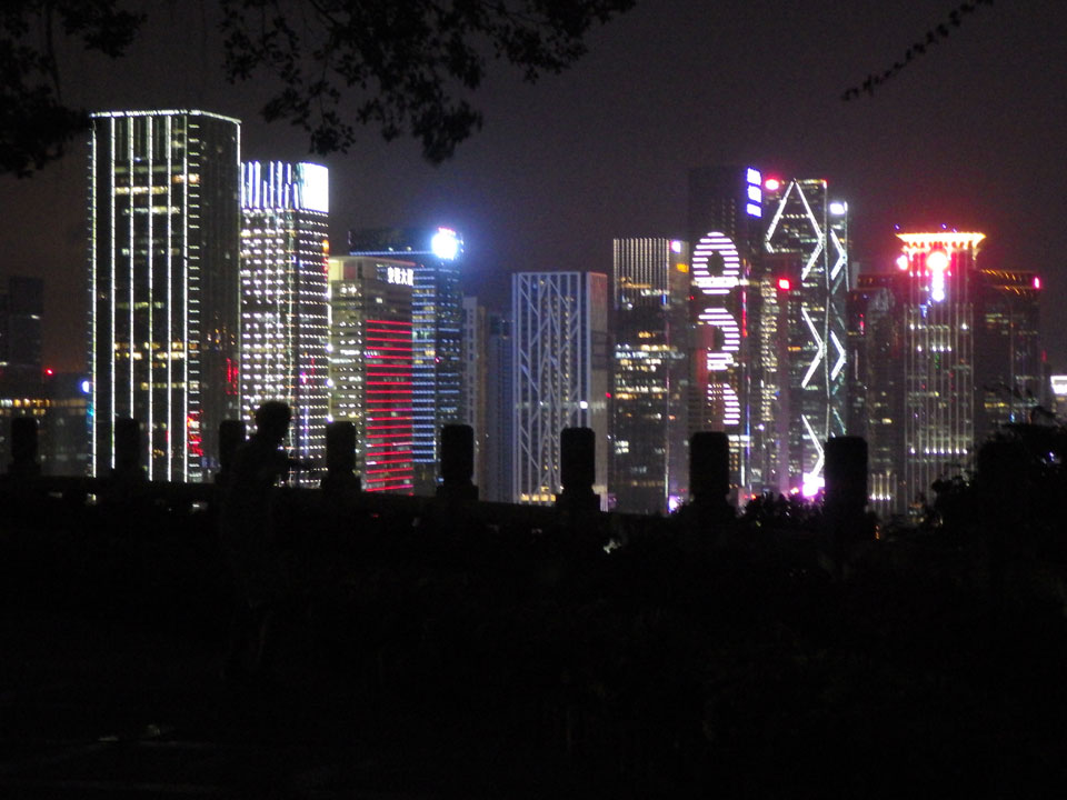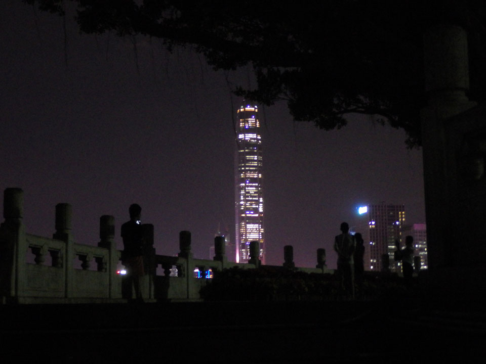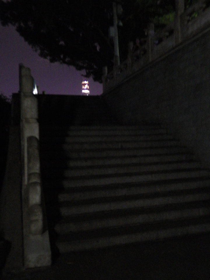 Shenzen ist eine ganz nette Stadt. Der Park bietet eine nette Aussicht. Bevor man oben auf dem Hügel ist, heißt es Treppen steigen. Das Licht war doch recht schummrig hier. In so manch anderen Ländern käme ich mir da nicht so sicher vor. Hier war aber alles OK, oben schauten schon einige Leute auf die Skyline.