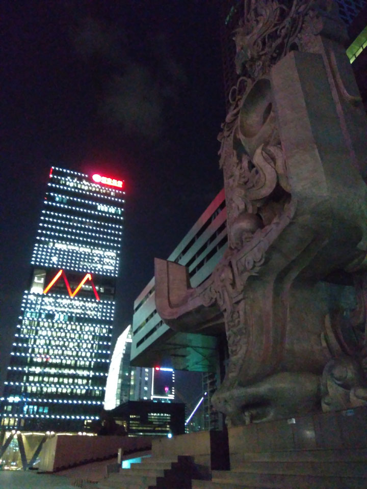 Meine Pentax hatte doch tatsächlich keinen Speicher mehr. Die Photos mit dem Handy blieben dürftig. Zurück ging’s zu Fuß. Ein ganzes Stückchen war#s, bot mir einen weiteren Eindruck von der Stadt, die Abends recht leer scheint. Das wird morgen in Hongkong sicher anders werden – wie ich das in Erinnerung habe.