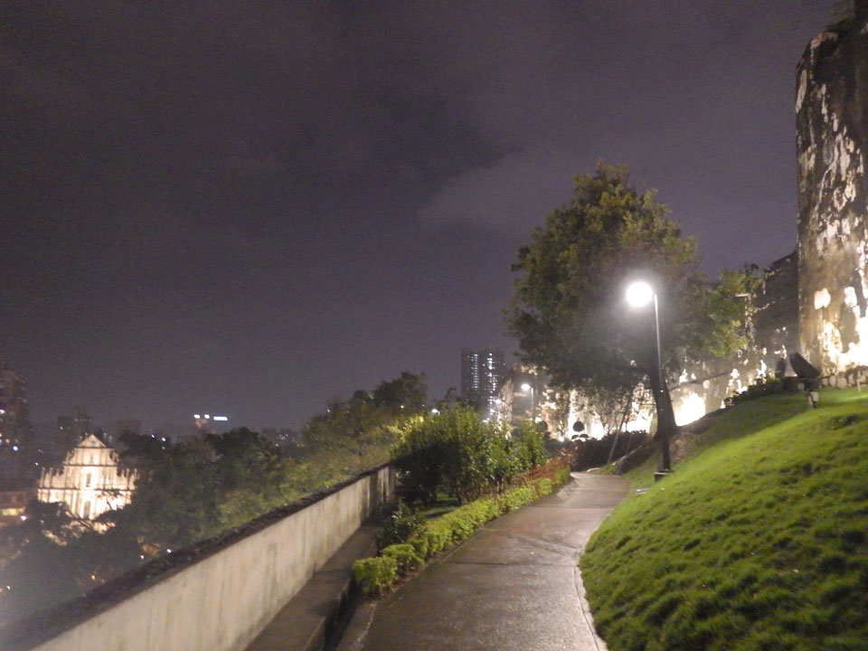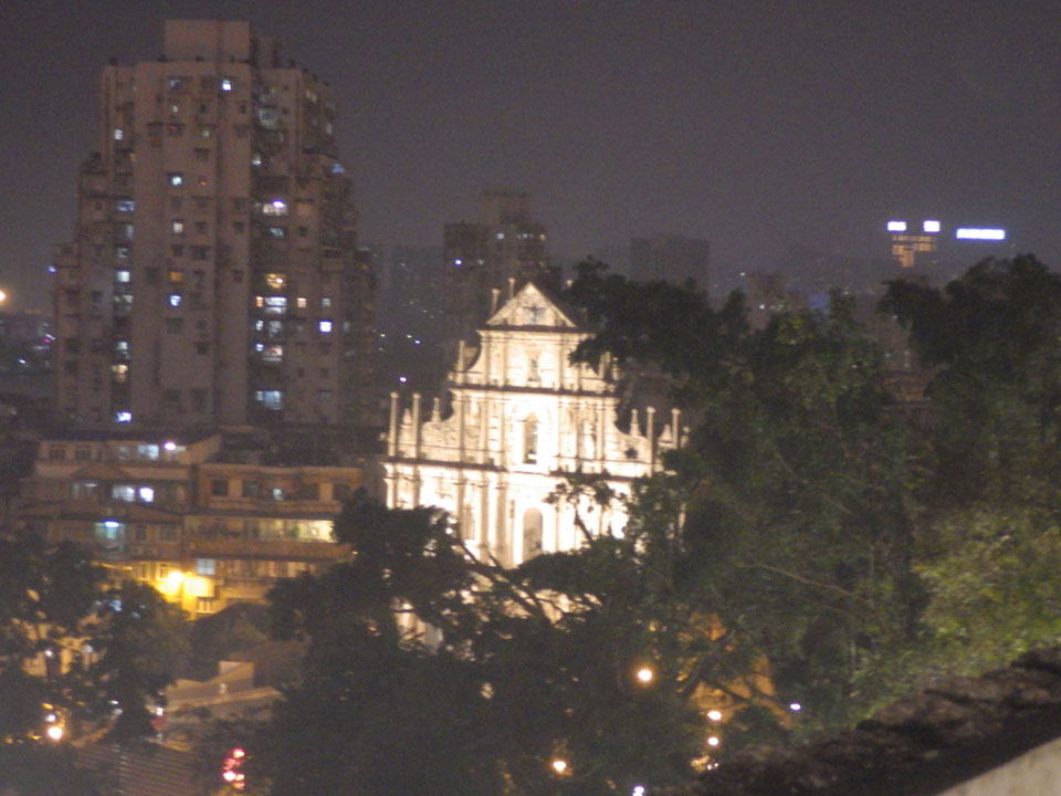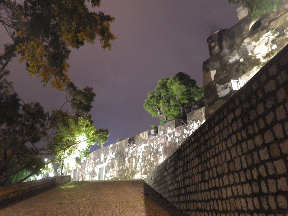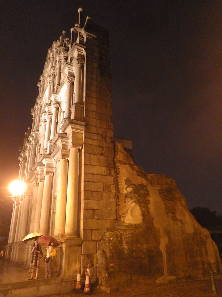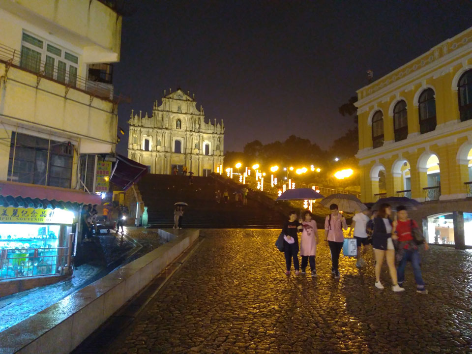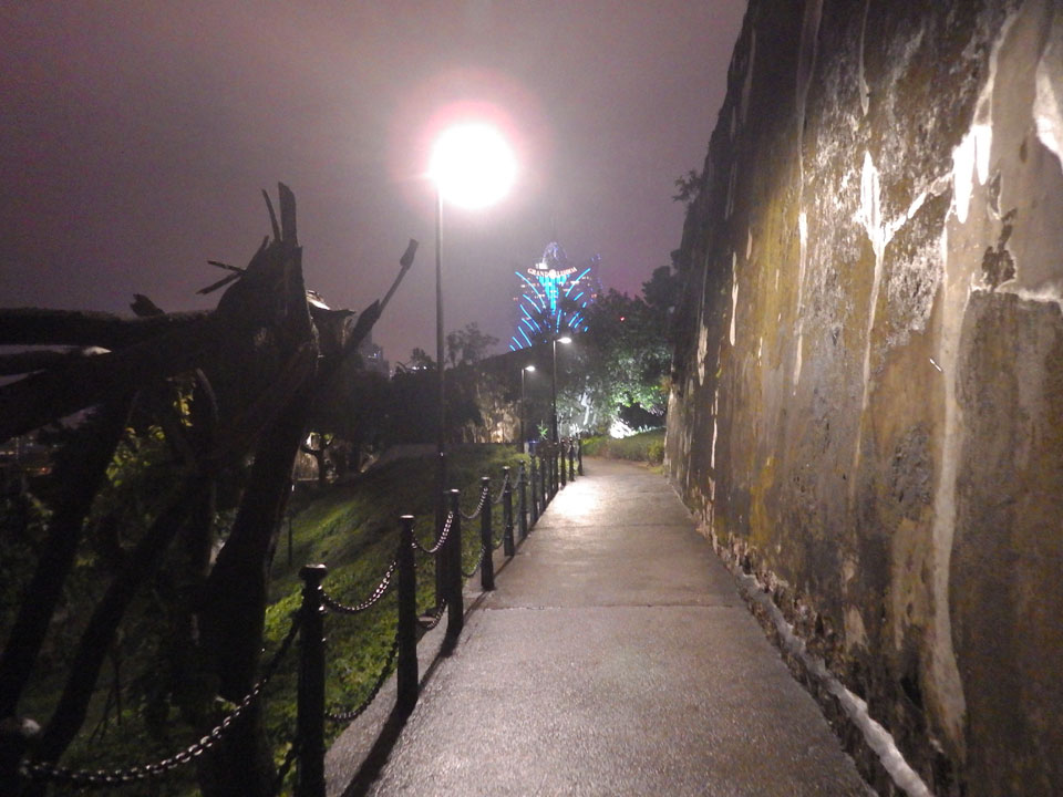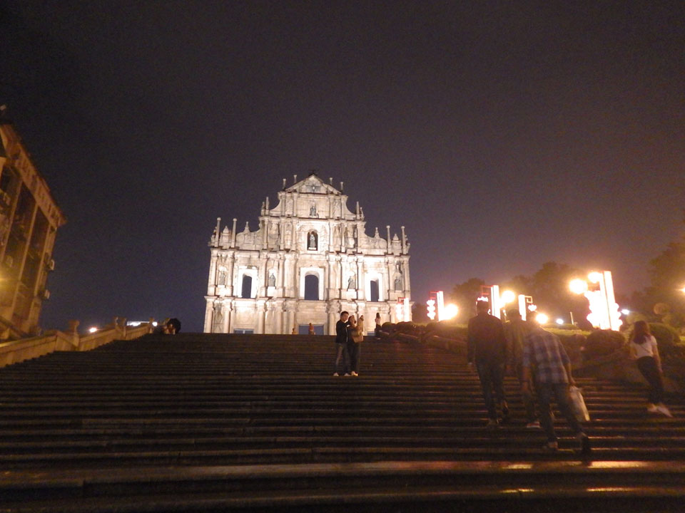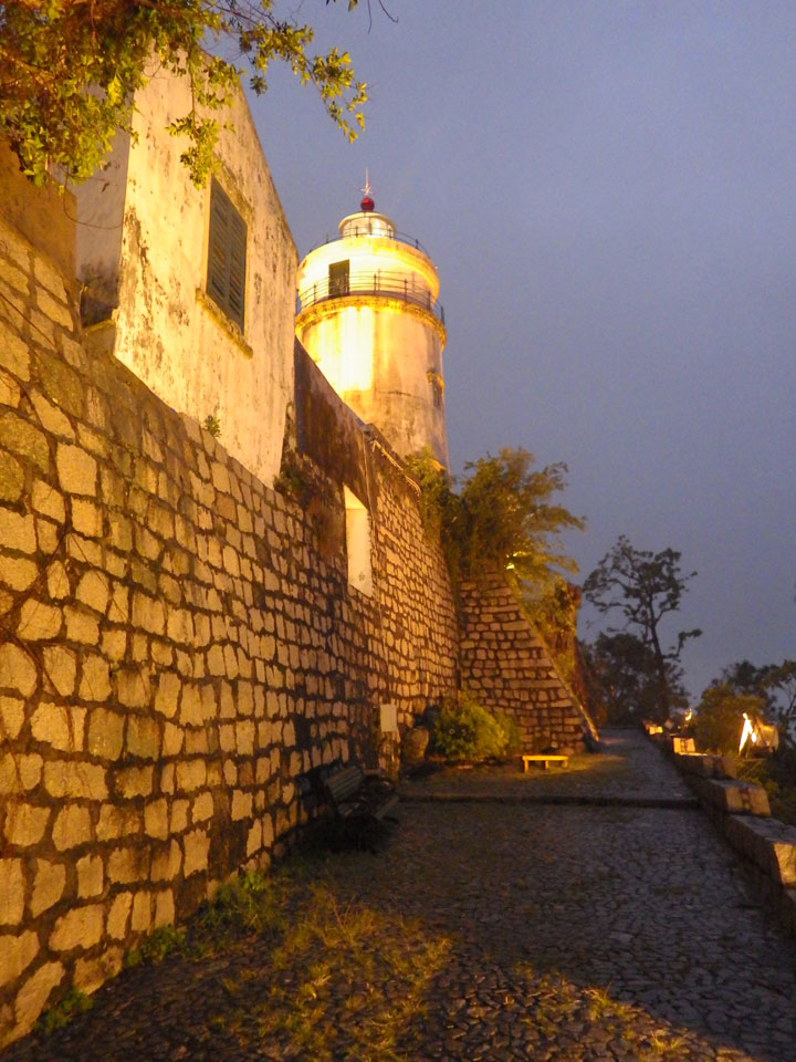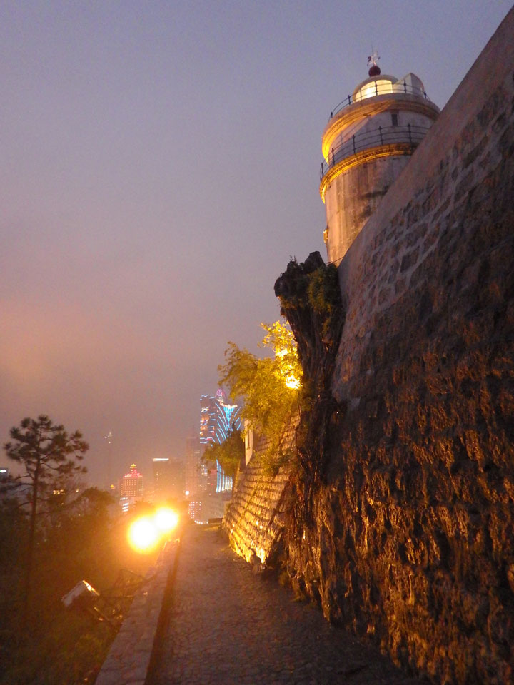 Das erste Ziel war der Guia Leuchtturm. Nach 18:00 geschlossen, sah ich den 15m hohen Turm auch leuchtend trotzdem in meiner Runde um das Fort. Gleich in der Nähe dann die Ruinen der St. Paul’s Kirche. Ich war nun etwas in einer Art Altstadt und das gefiel mir ganz gut. Trotz immer einsetzenden Regengüssen, war die Atmosphäre hier netter als in den gigantischen Casino-Komplexen. Meine Pentax war ohne Akkus, das Handy hielt aber durch.