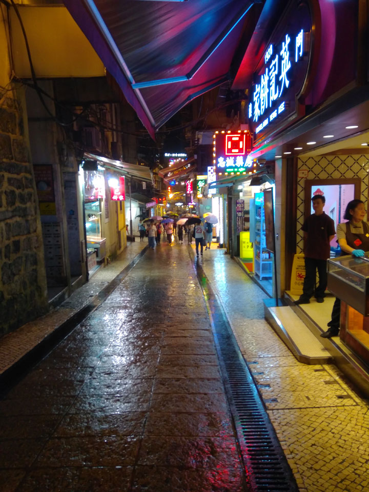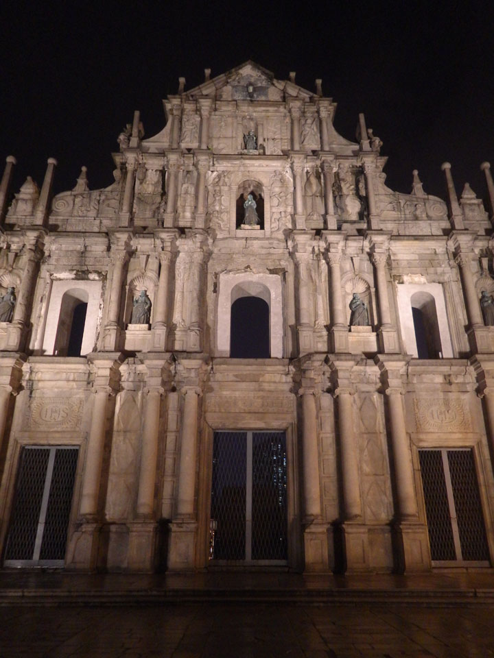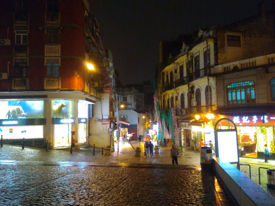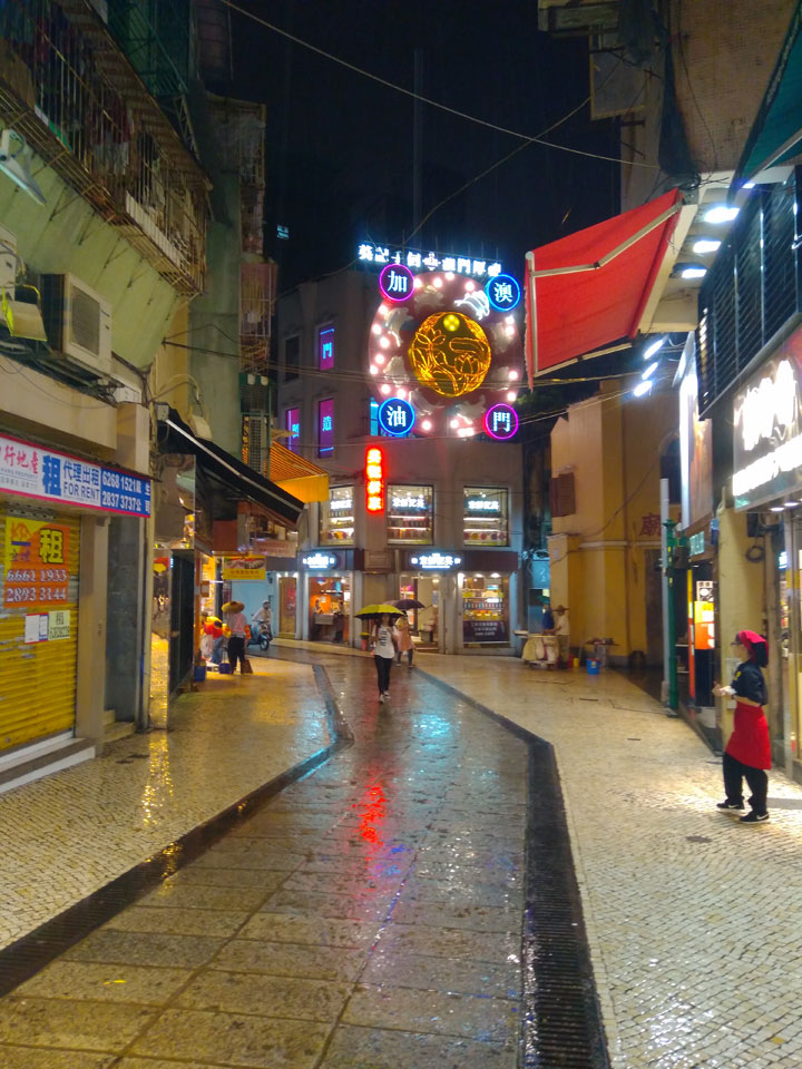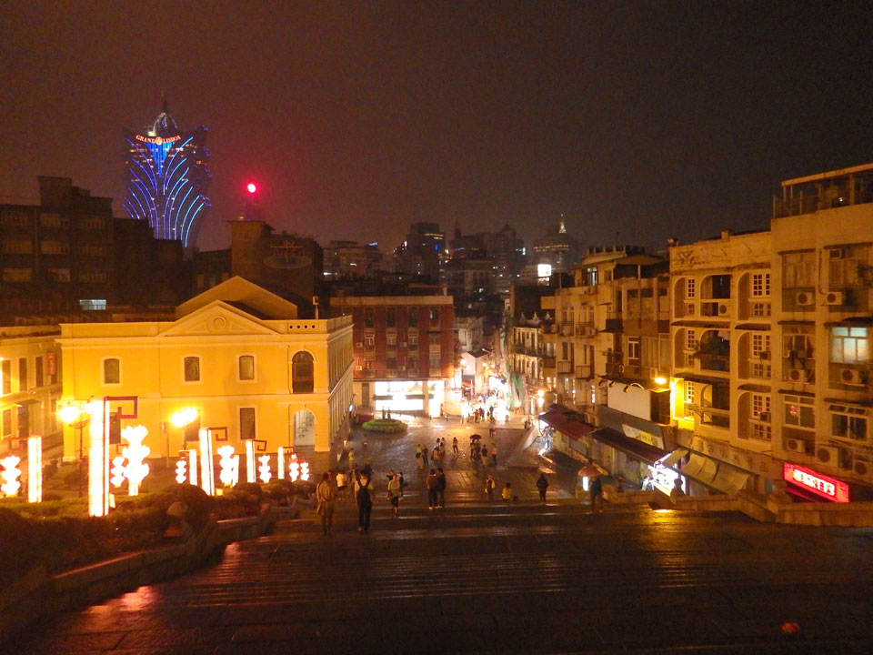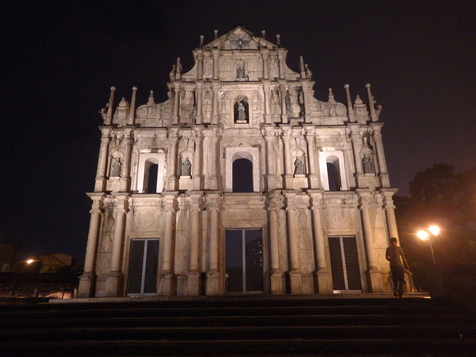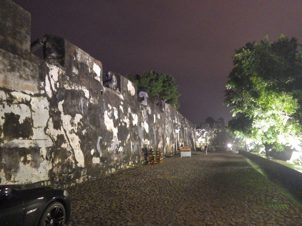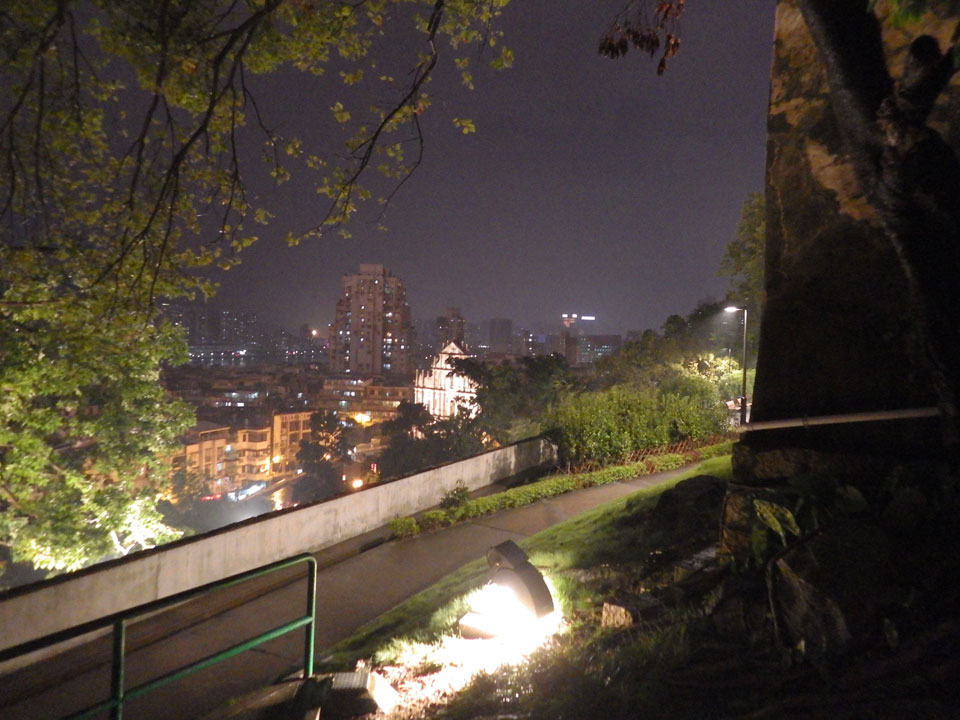 Das erste Ziel war der Guia Leuchtturm. Nach 18:00 geschlossen, sah ich den 15m hohen Turm auch leuchtend trotzdem in meiner Runde um das Fort. Gleich in der Nähe dann die Ruinen der St. Paul’s Kirche. Ich war nun etwas in einer Art Altstadt und das gefiel mir ganz gut. Trotz immer einsetzenden Regengüssen, war die Atmosphäre hier netter als in den gigantischen Casino-Komplexen. Meine Pentax war ohne Akkus, das Handy hielt aber durch.