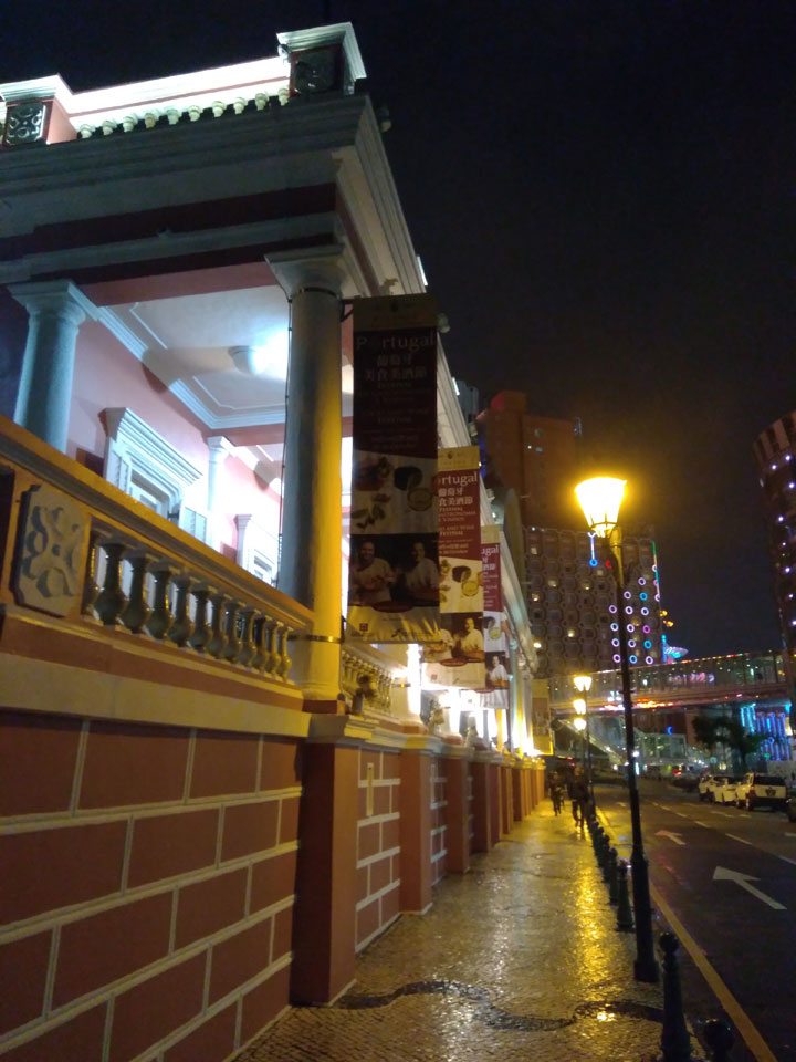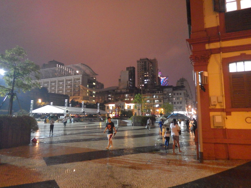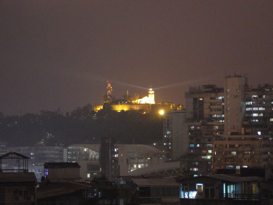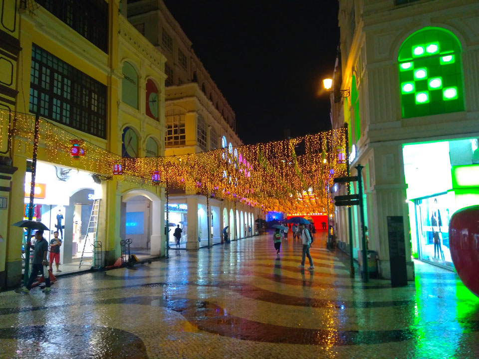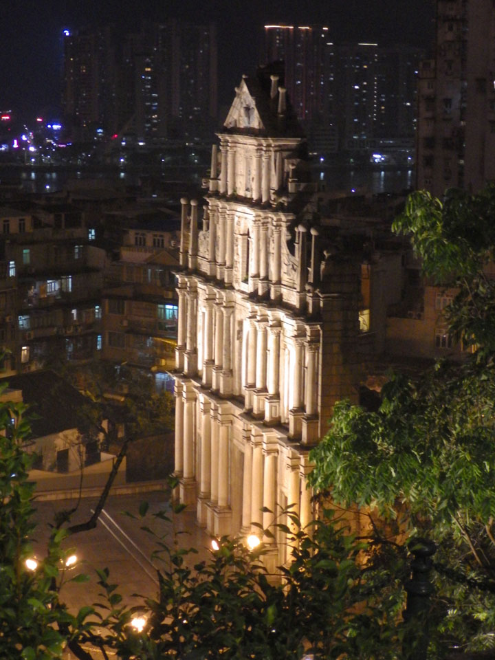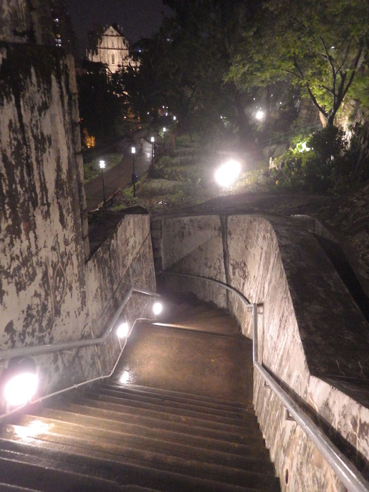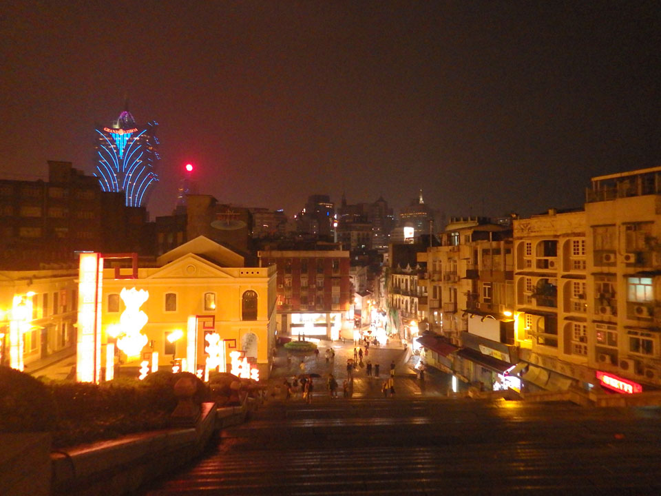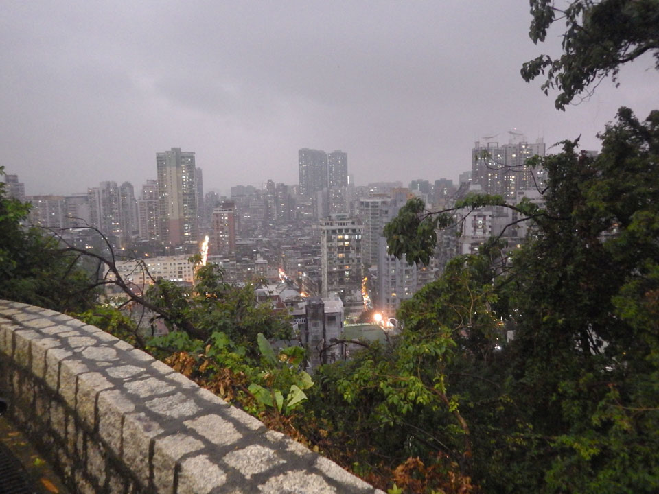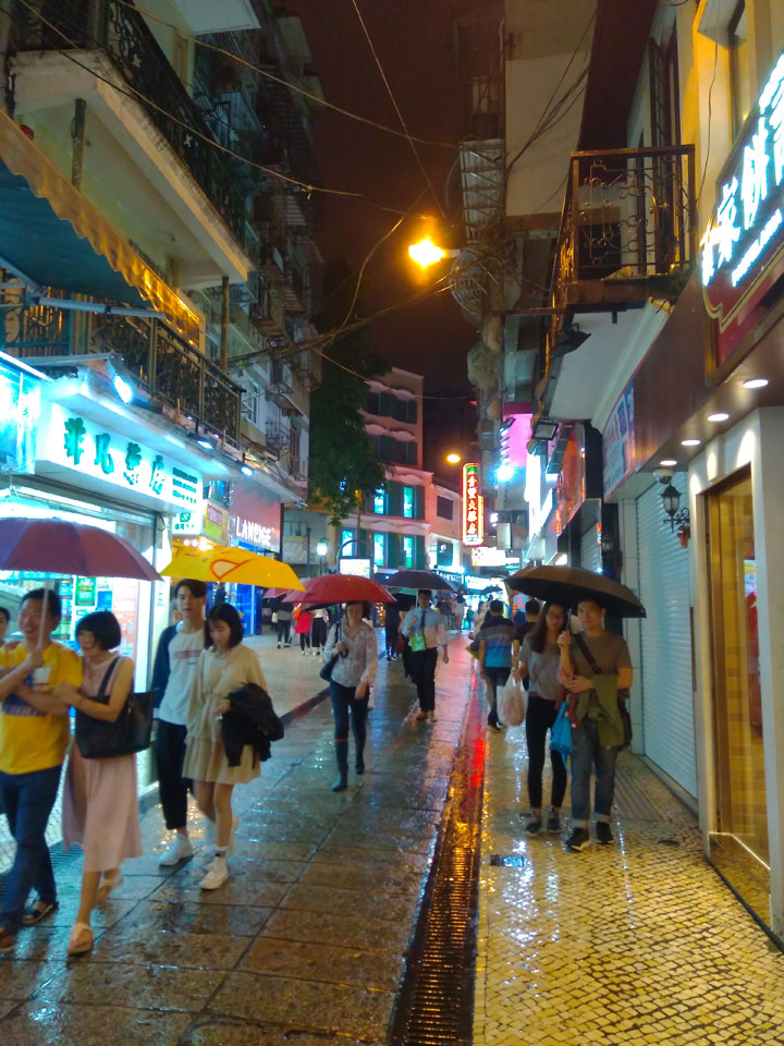 Das erste Ziel war der Guia Leuchtturm. Nach 18:00 geschlossen, sah ich den 15m hohen Turm auch leuchtend trotzdem in meiner Runde um das Fort. Gleich in der Nähe dann die Ruinen der St. Paul’s Kirche. Ich war nun etwas in einer Art Altstadt und das gefiel mir ganz gut. Trotz immer einsetzenden Regengüssen, war die Atmosphäre hier netter als in den gigantischen Casino-Komplexen. Meine Pentax war ohne Akkus, das Handy hielt aber durch.