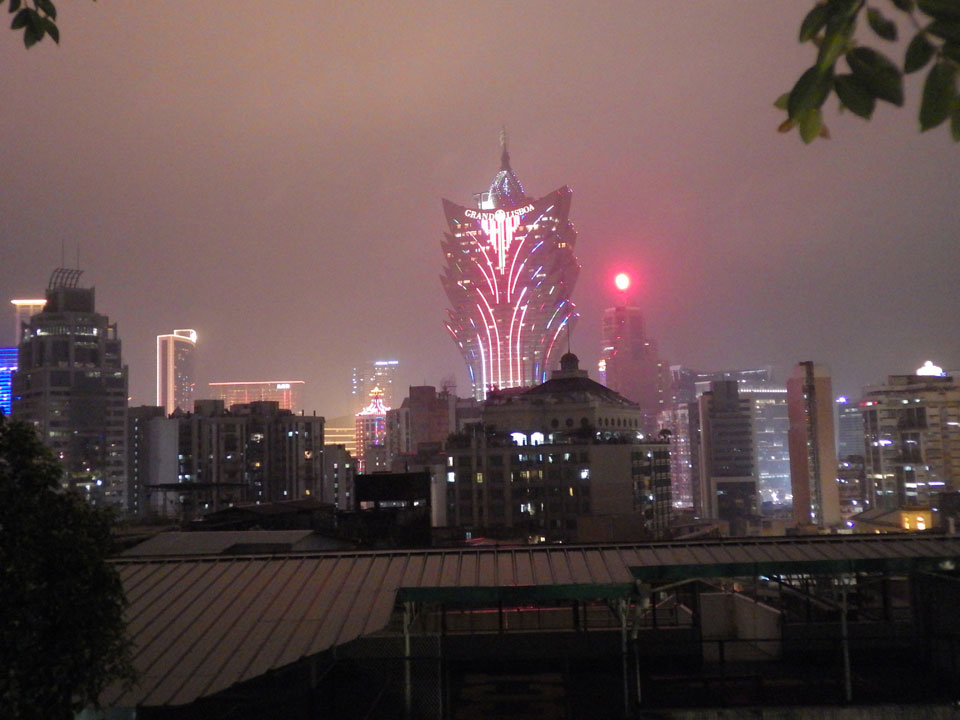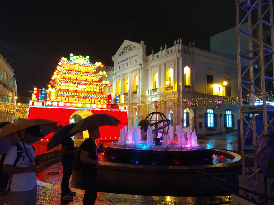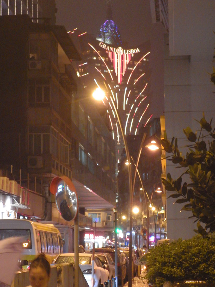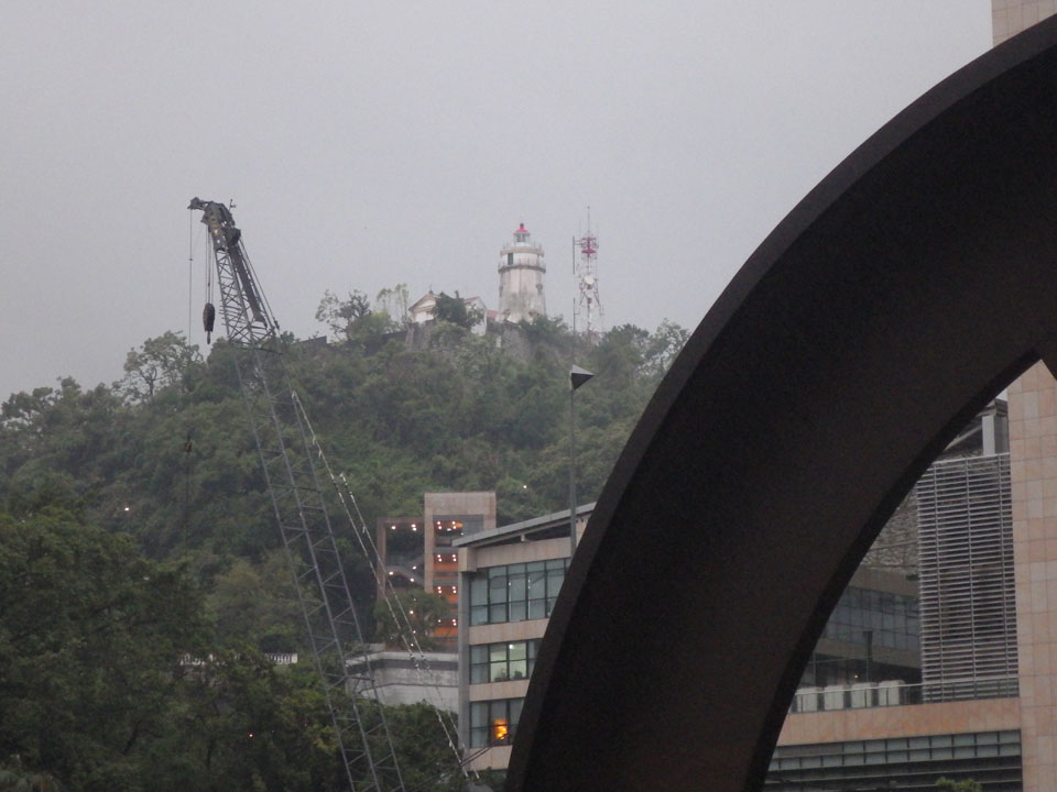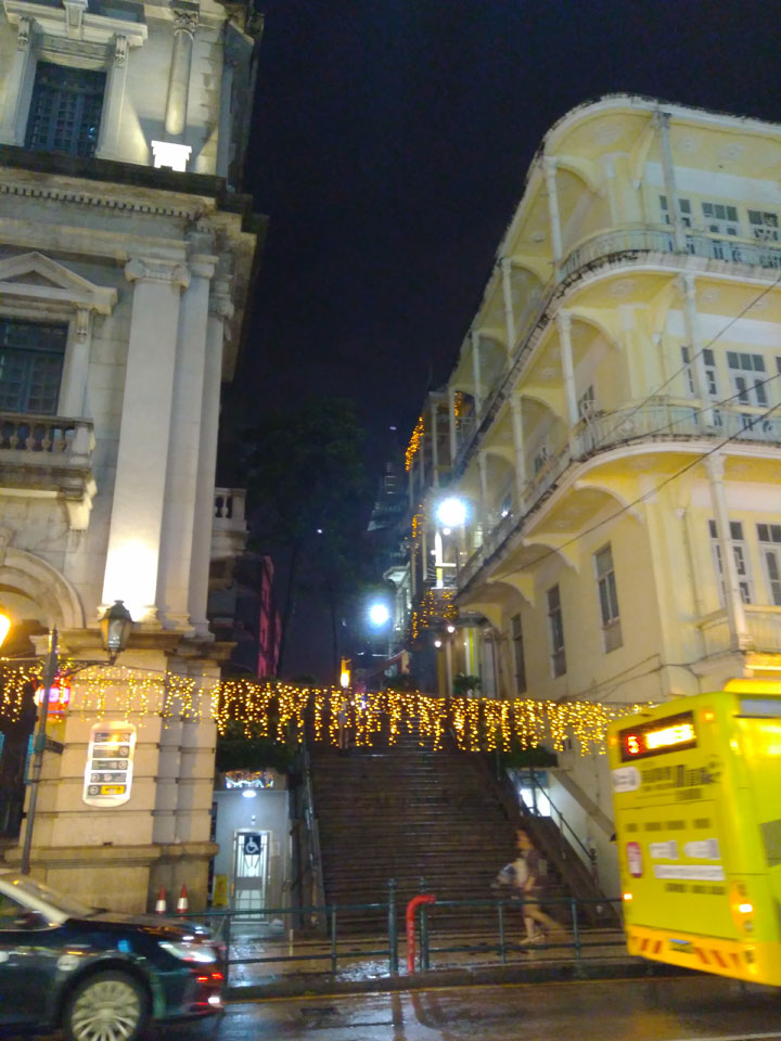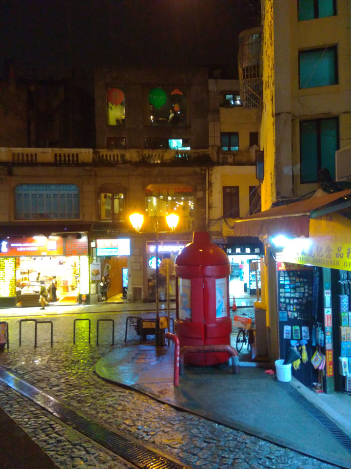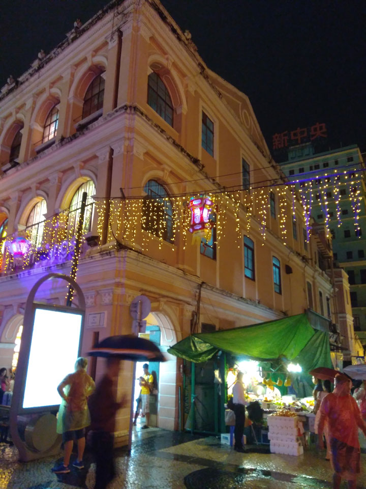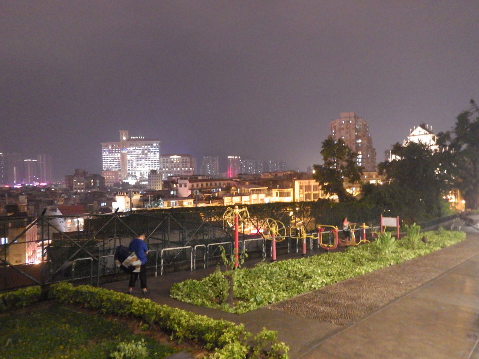 Das erste Ziel war der Guia Leuchtturm. Nach 18:00 geschlossen, sah ich den 15m hohen Turm auch leuchtend trotzdem in meiner Runde um das Fort. Gleich in der Nähe dann die Ruinen der St. Paul’s Kirche. Ich war nun etwas in einer Art Altstadt und das gefiel mir ganz gut. Trotz immer einsetzenden Regengüssen, war die Atmosphäre hier netter als in den gigantischen Casino-Komplexen. Meine Pentax war ohne Akkus, das Handy hielt aber durch.