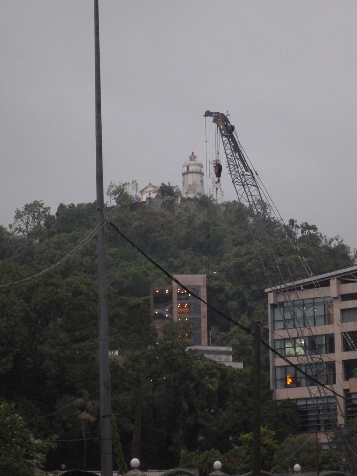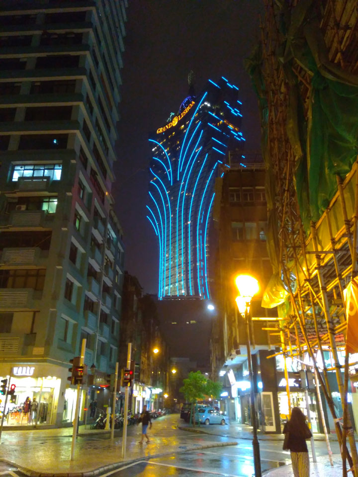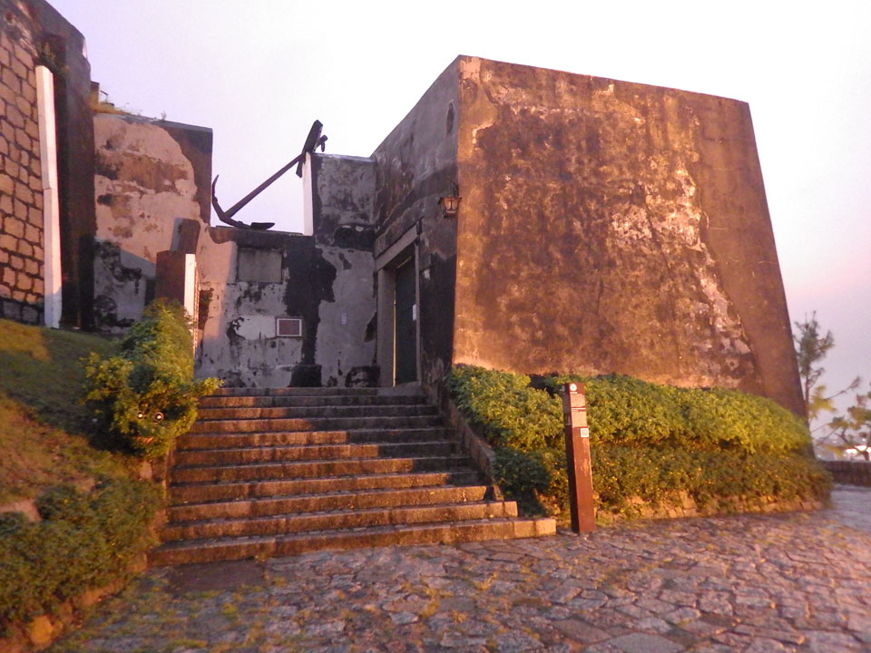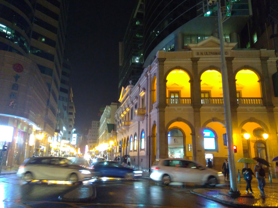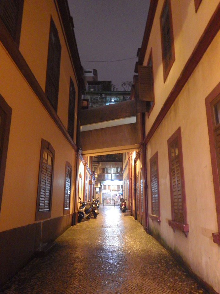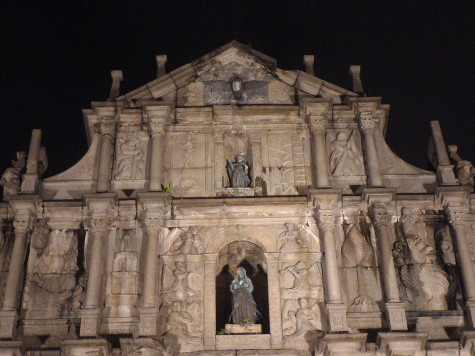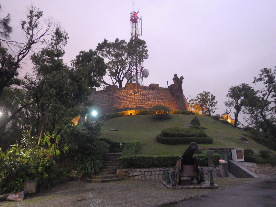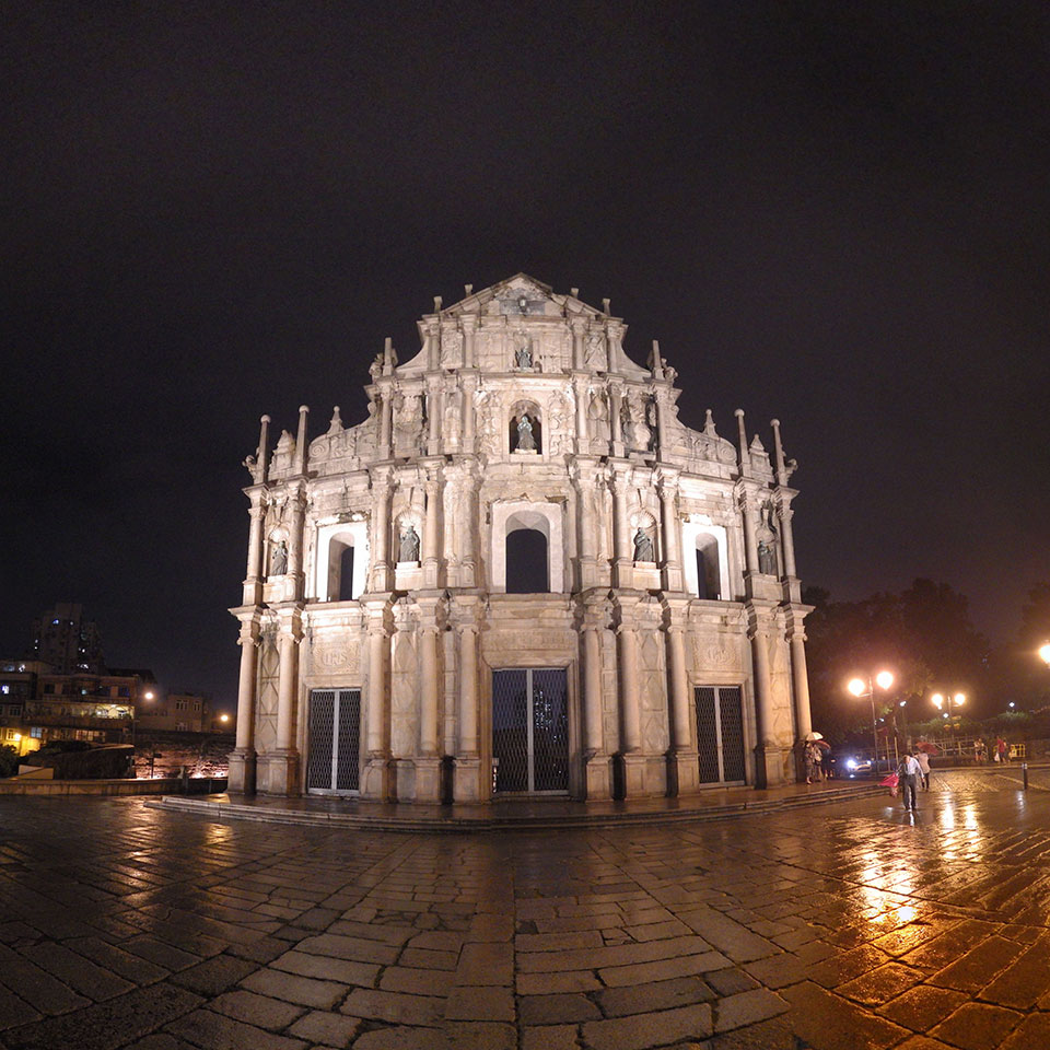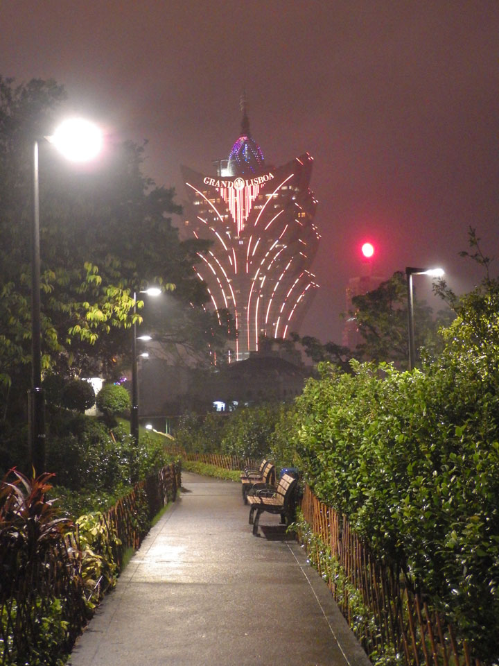 Das erste Ziel war der Guia Leuchtturm. Nach 18:00 geschlossen, sah ich den 15m hohen Turm auch leuchtend trotzdem in meiner Runde um das Fort. Gleich in der Nähe dann die Ruinen der St. Paul’s Kirche. Ich war nun etwas in einer Art Altstadt und das gefiel mir ganz gut. Trotz immer einsetzenden Regengüssen, war die Atmosphäre hier netter als in den gigantischen Casino-Komplexen. Meine Pentax war ohne Akkus, das Handy hielt aber durch.