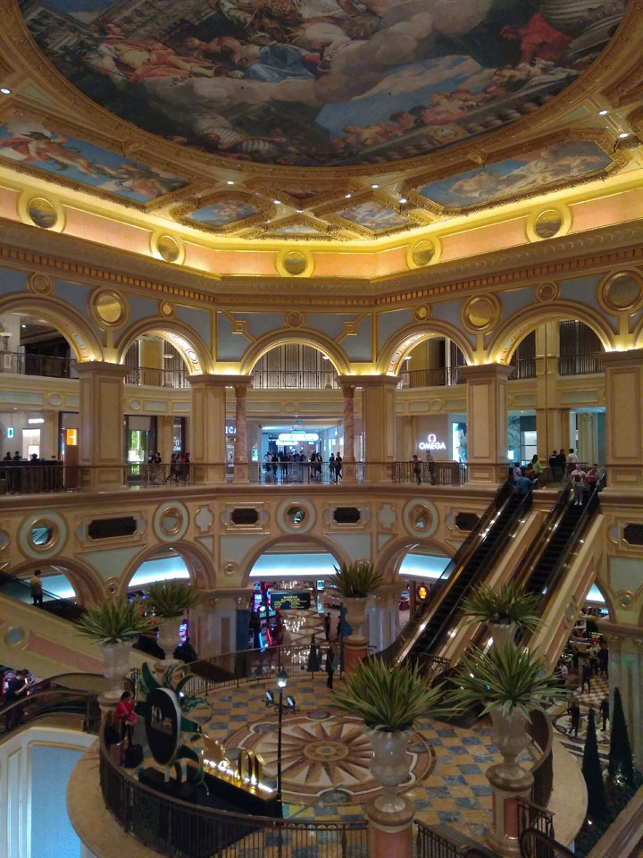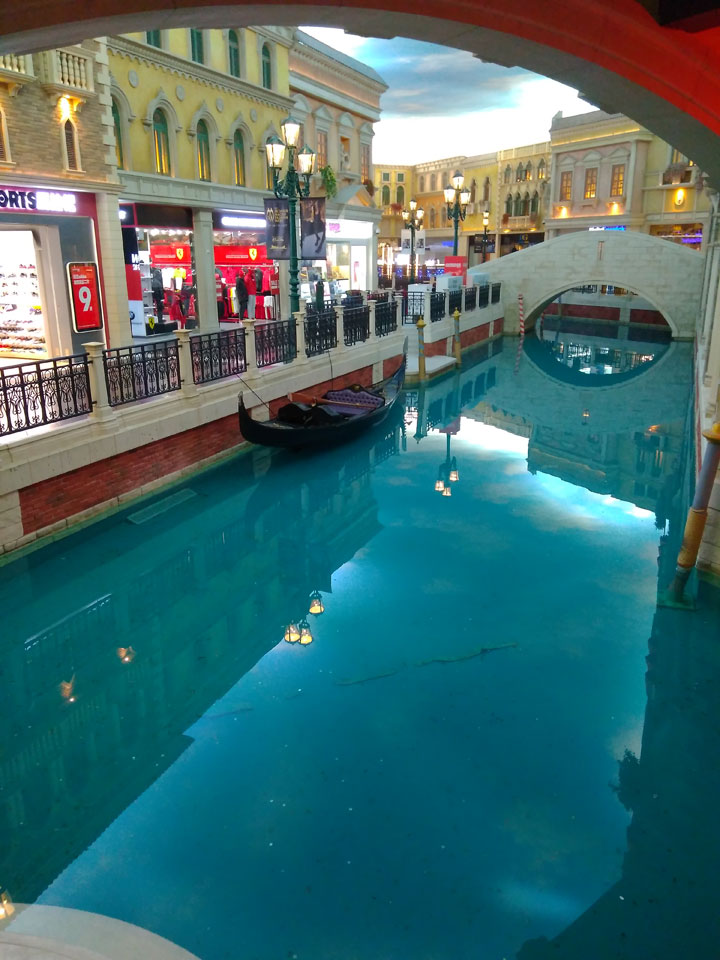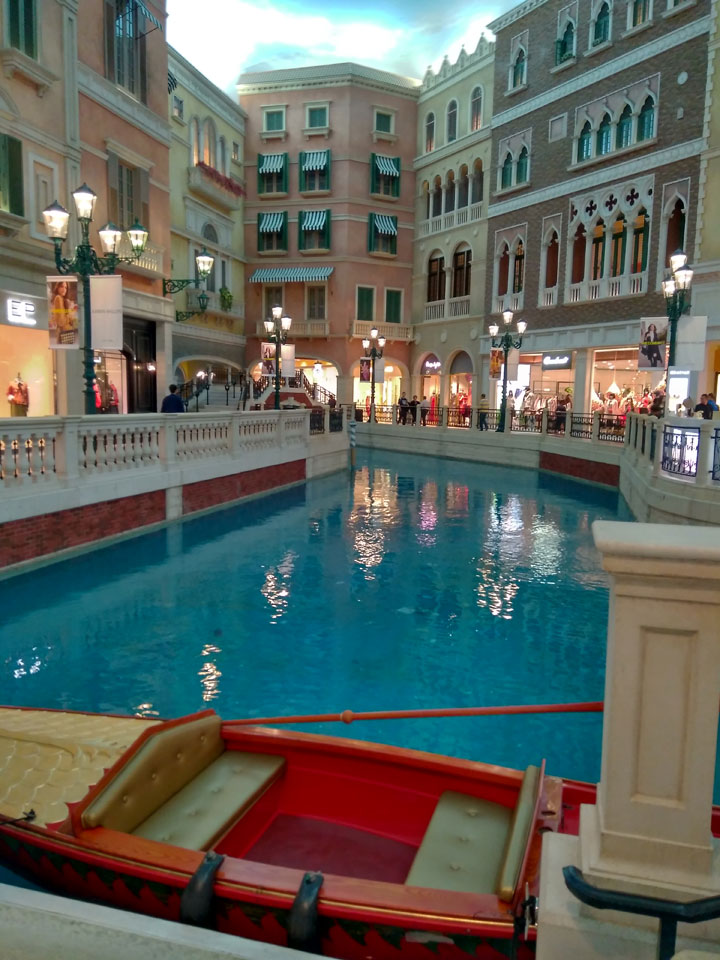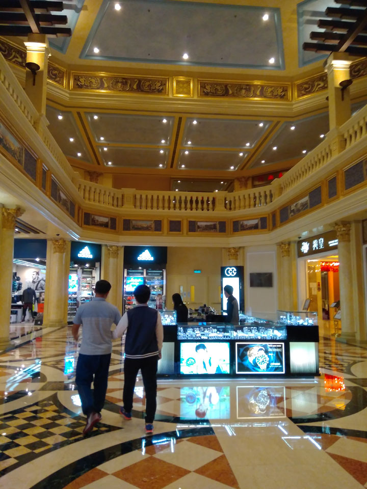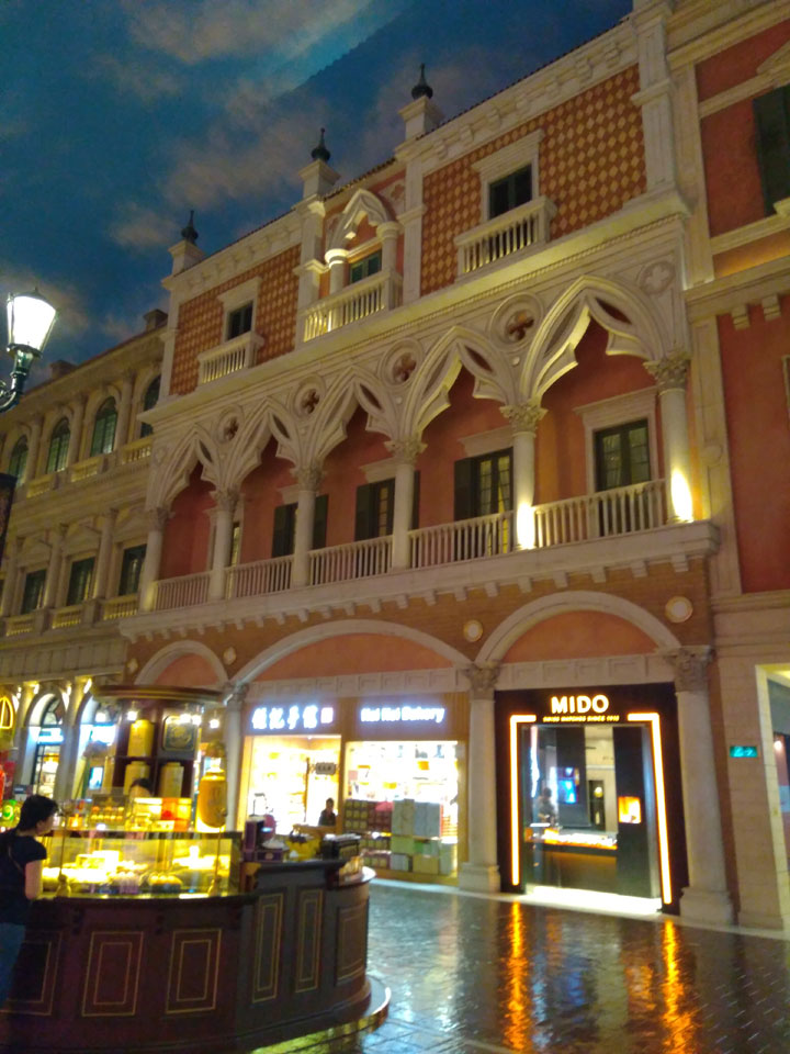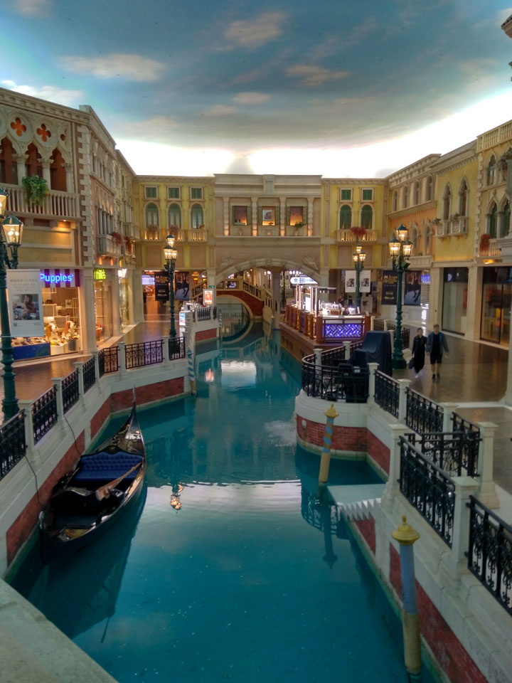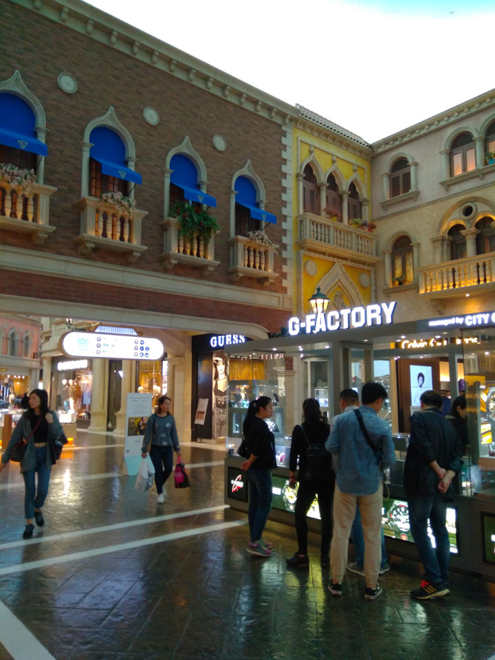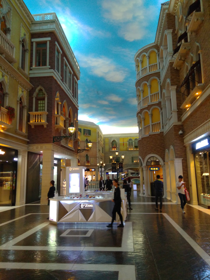 Ich schaute in die zweite Etage, wo ein Kanal mit Gondeln war. Echt: in der zweiten Etage! Eine lange Ladenstraße, ein Plaza, parfümierte Luft – alles ziemlich irre und vergleichbar mit dem Venetian in Las Vegas. Hier schien mir zwar weniger los, doch das Ding war wohl noch etwas größer als in Vegas. Es fehlen ein paar Essengeschäfte – zu viel Luxus für meinen Geschmack. Als ich dann den berümten Macau Egg Tart sah, waren die schon ausverkauft.