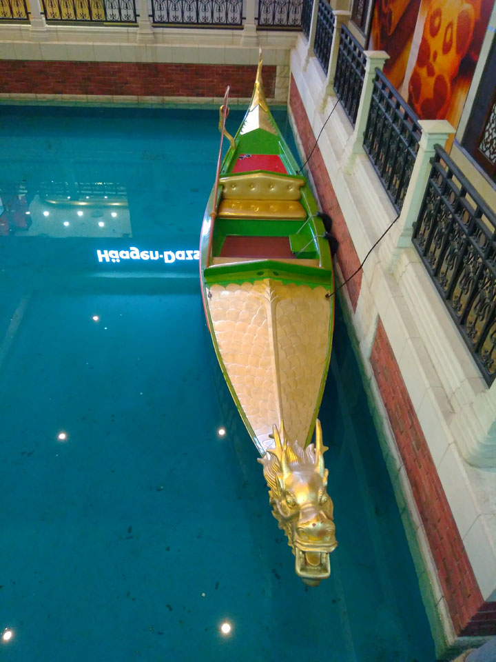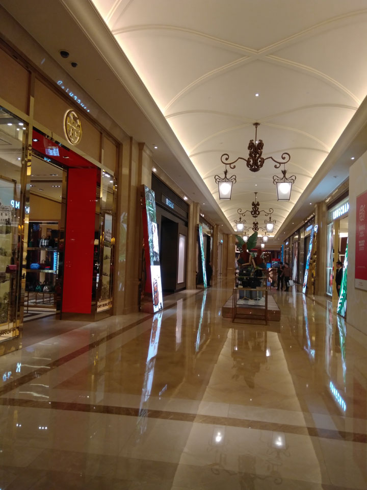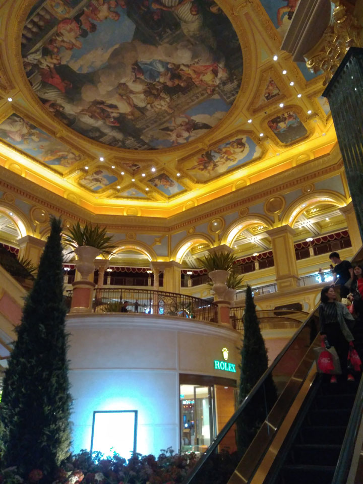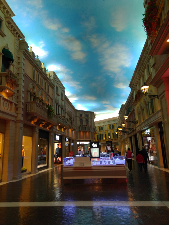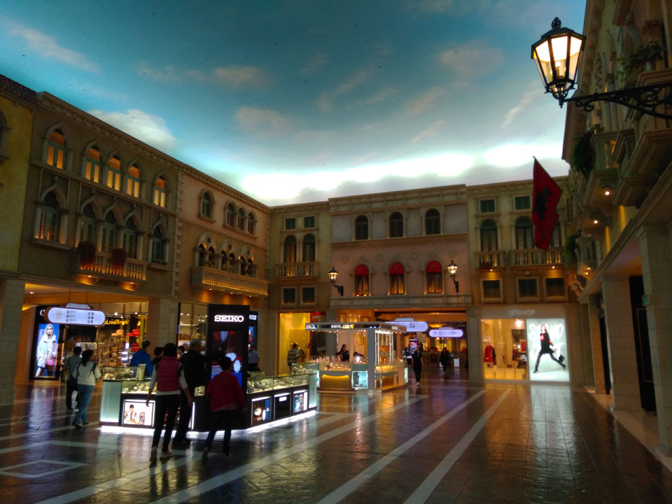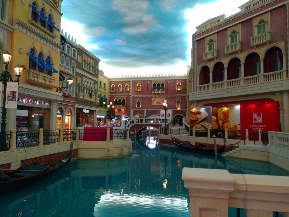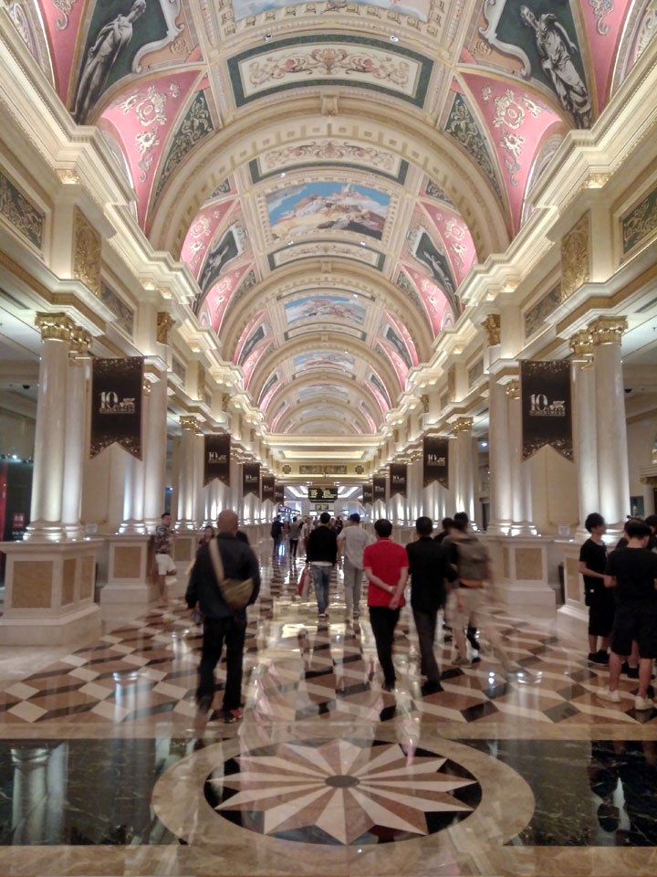 Ich schaute in die zweite Etage, wo ein Kanal mit Gondeln war. Echt: in der zweiten Etage! Eine lange Ladenstraße, ein Plaza, parfümierte Luft – alles ziemlich irre und vergleichbar mit dem Venetian in Las Vegas. Hier schien mir zwar weniger los, doch das Ding war wohl noch etwas größer als in Vegas. Es fehlen ein paar Essengeschäfte – zu viel Luxus für meinen Geschmack. Als ich dann den berümten Macau Egg Tart sah, waren die schon ausverkauft.